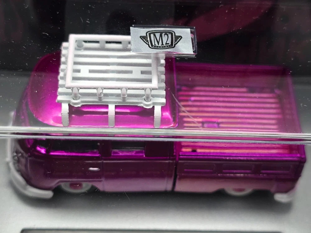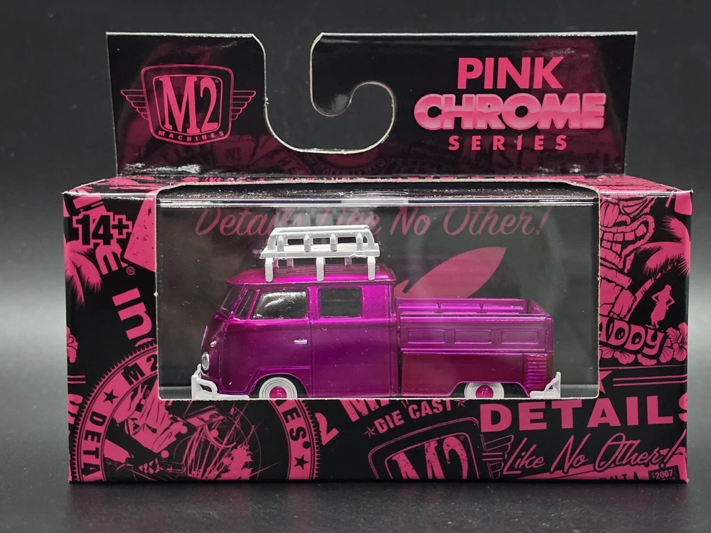 This is a brand new M2 Machines Pink Chrome Series 1959 VW Double Cab Truck USA Model. This limited edition truck comes with a special case and stand, and has never been opened. The truck is made of high quality diecast material and features a beautiful pink chrome finish. It is a must-have for any Volkswagen or truck collector, and would make a great addition to any collection. The truck is a scale 1:64 and represents the Pink Chrome Series. The truck's year of manufacture is 2024 and it is suitable for both boys and girls.