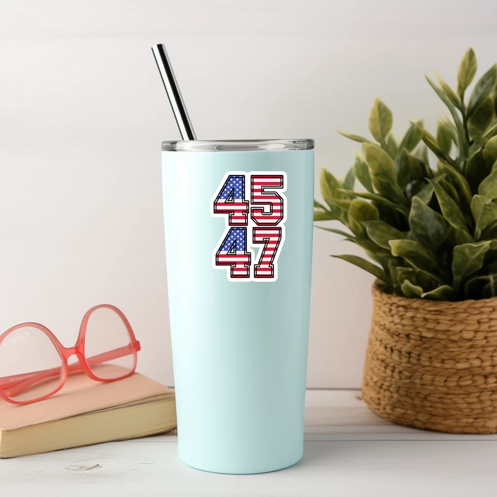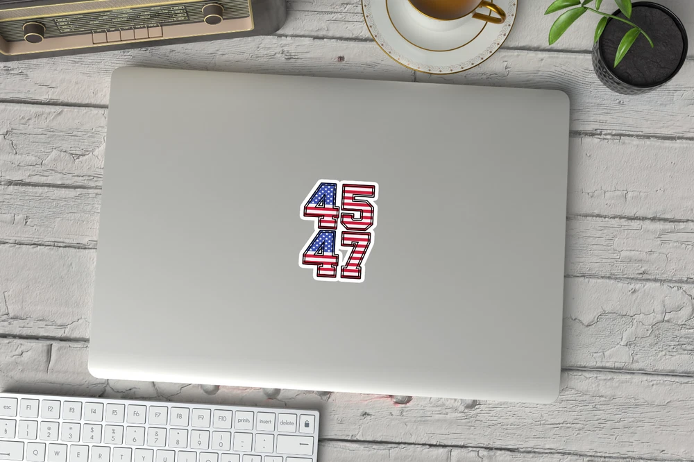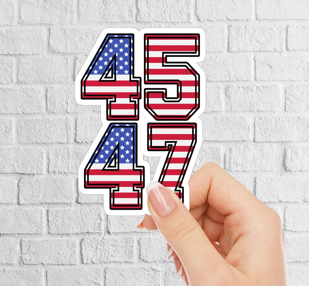 Show your support for Donald Trump with this patriotic "45/47" vinyl sticker! Featuring bold red, white, and blue American flag designs, this decal represents Trump as the 45th and potentially the 47th president of the United States. Perfect for personalizing your laptop, tumbler, helmet, or any smooth surface, this sticker makes a strong statement for any Trump supporter. Crafted from high-quality vinyl and laminated for added protection, this sticker ensures durability and vibrant colors. Note: Best suited for indoor use and not intended for prolonged outdoor exposure or UV light. Key Features: Premium vinyl with laminated protection Easy application and residue-free removal Bold "45/47" design with American flag elements Perfect for laptops, tumblers, helmets, and more Not suitable for extended outdoor use or UV exposure Celebrate the spirit of the America First movement with this eye-catching "45/47" sticker. Get yours today and show your support for Trump’s legacy!