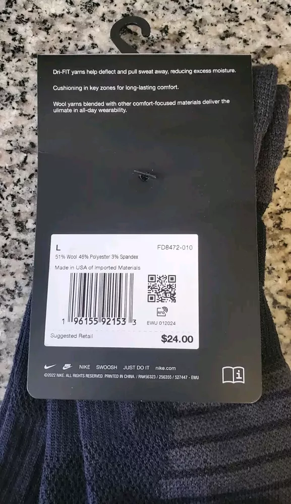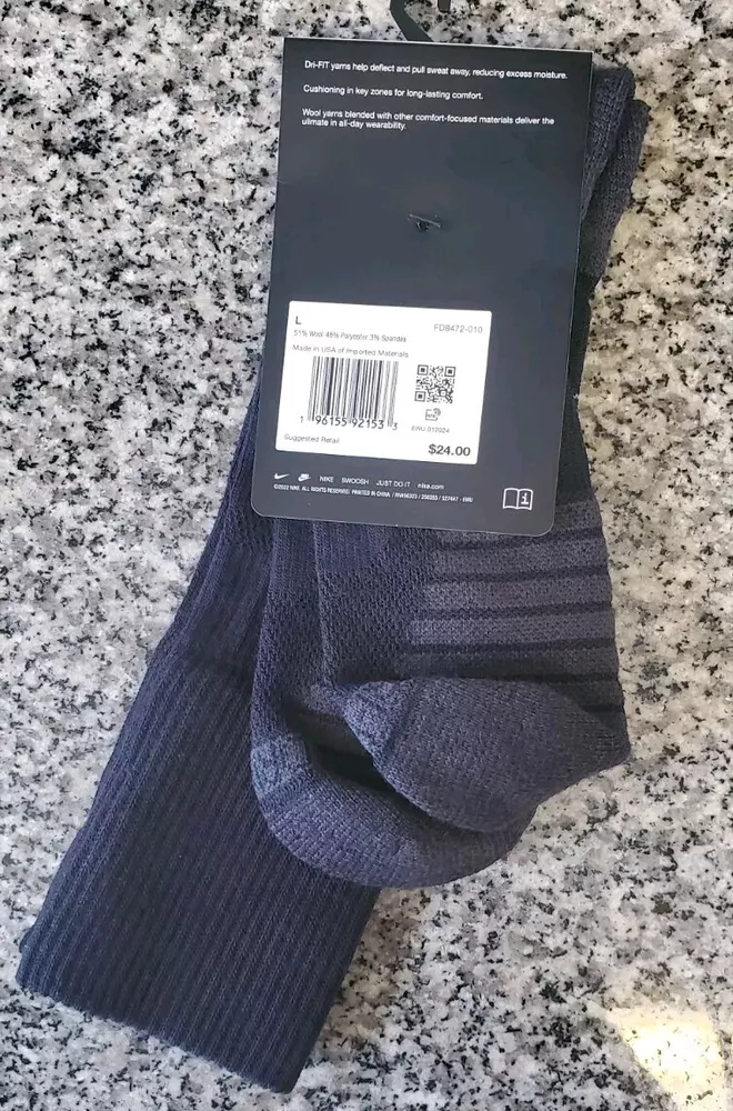 Brand: Nike Features: Breathable, Moisture Wicking Number in Pack: 1 Character: Snike Material: Polyester, Wool Department: Men Performance/Activity: CrossFit, Golf, Gym & Training, Hunting, Walking Season: Fall, Spring, Summer, Winter Sock Length: Mid Calf Occasion: Business, Casual, Workwear Color: Black gtin13: Does not apply Pattern: Striped Size: L 8-12 Handmade: No Personalize: No MPN: FD8472010 Style: Outdoor Socks Toe Style: Full Toe UPC: Does not apply Size Type: Regular Theme: Outdoor Type: Socks Country/Region of Manufacture: China