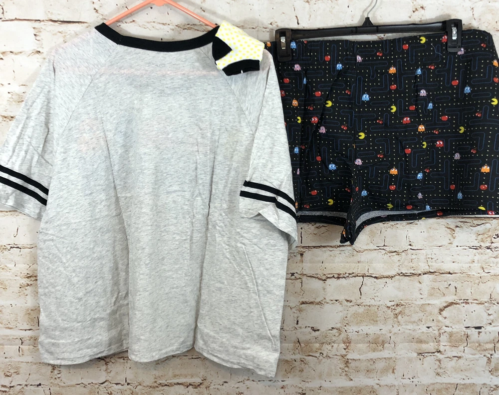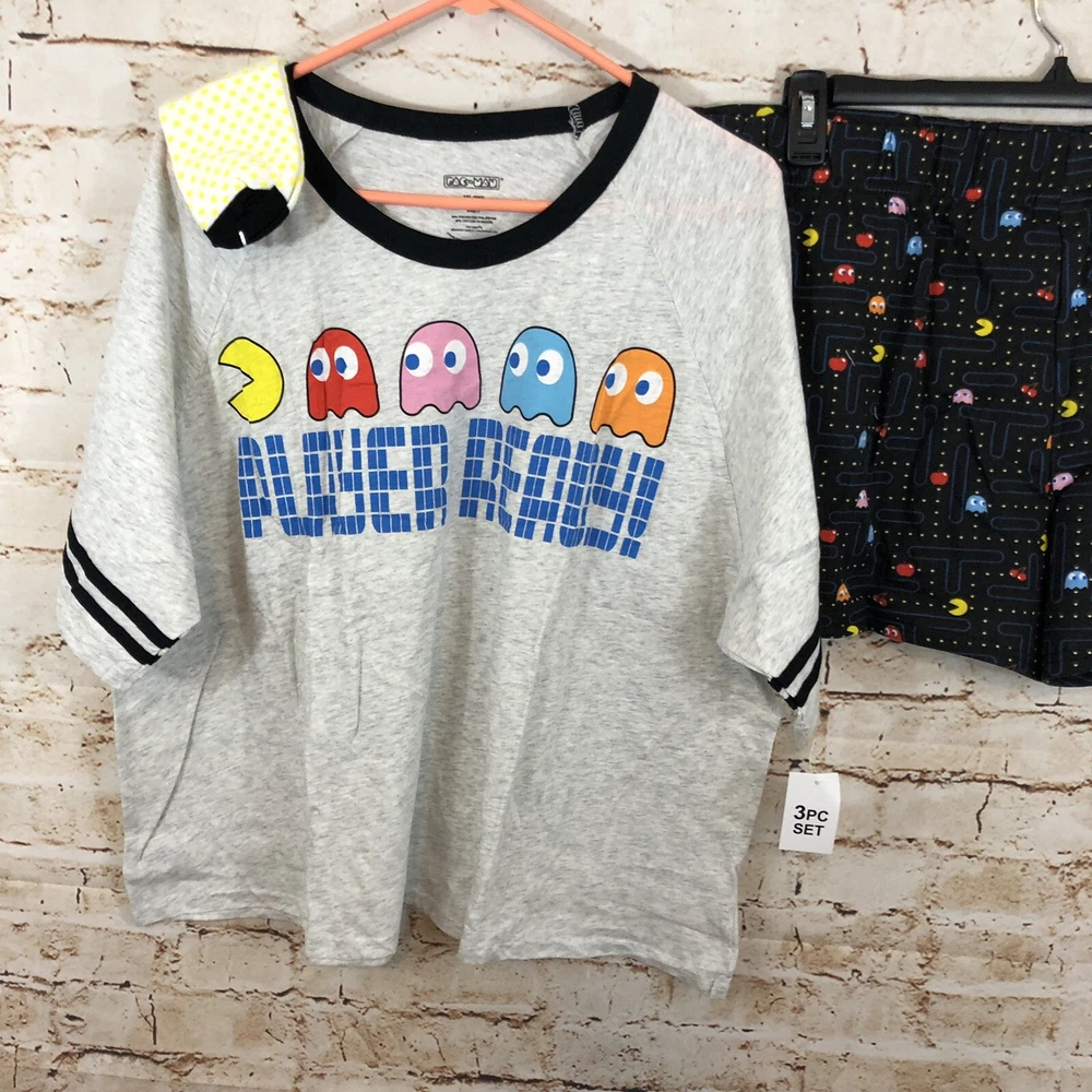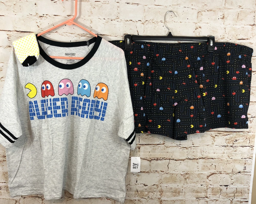 New with tags Pac Man 3 piece pajamas set womens medium Three-piece set includes: T-shirt, boxer short and socks T-shirt: relaxed fit; crewneck; short sleeves graphic at front Shorts: pull-on styling; elastic waistband for added comfort; allover print Includes a pair of coordinating socks T-shirt: 50% Cotton/50% Polyester; Shorts: 65% Polyester/35% Rayon; Socks: 74% Cotton/24% Polyester/2% Spandex Shirt: armpit to armpit: 19 length:22 shorts: inseam: 2" waist across unstretched: 16"-19" stretched