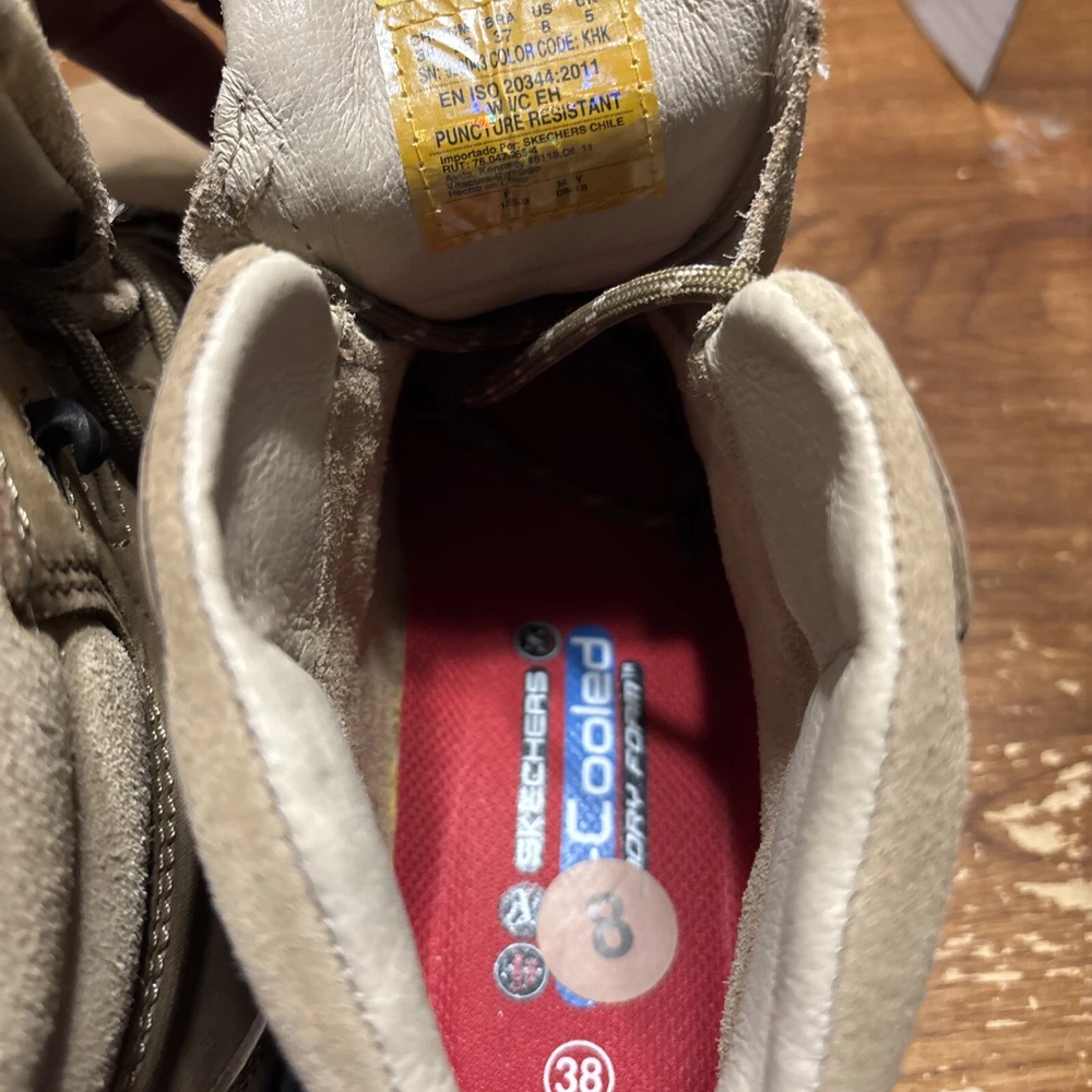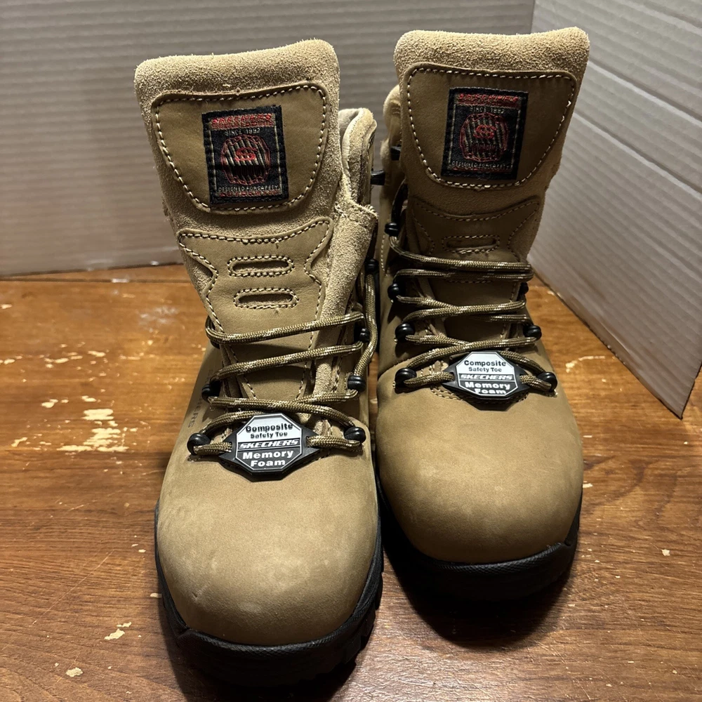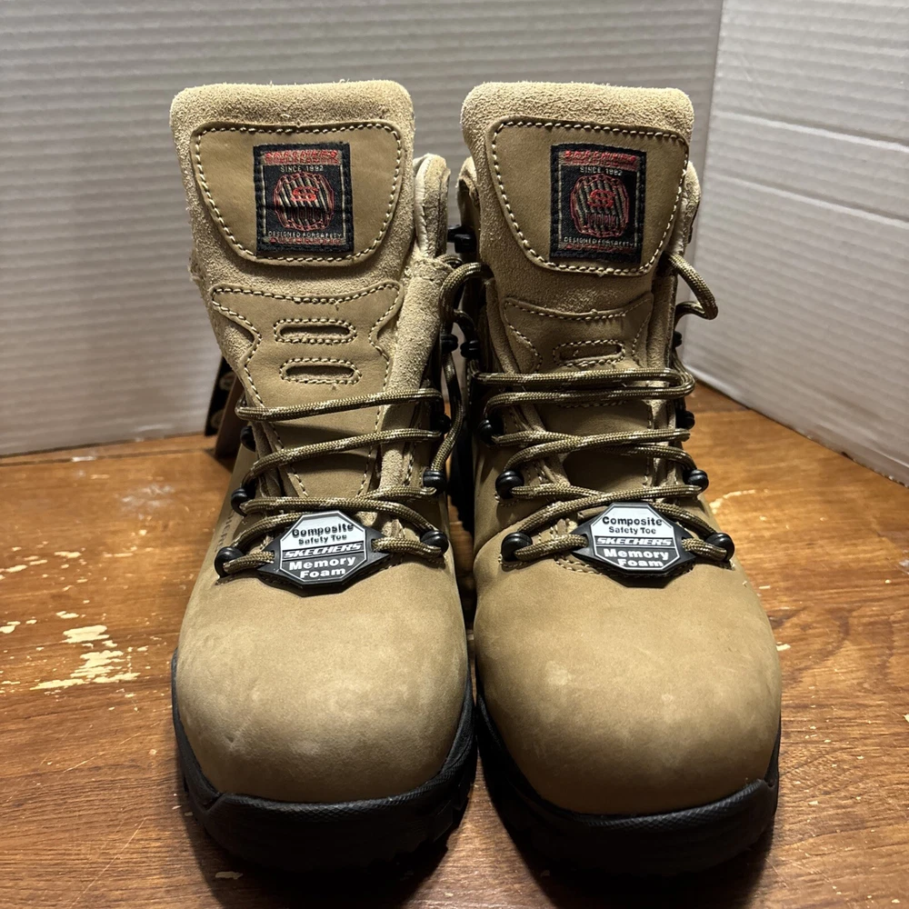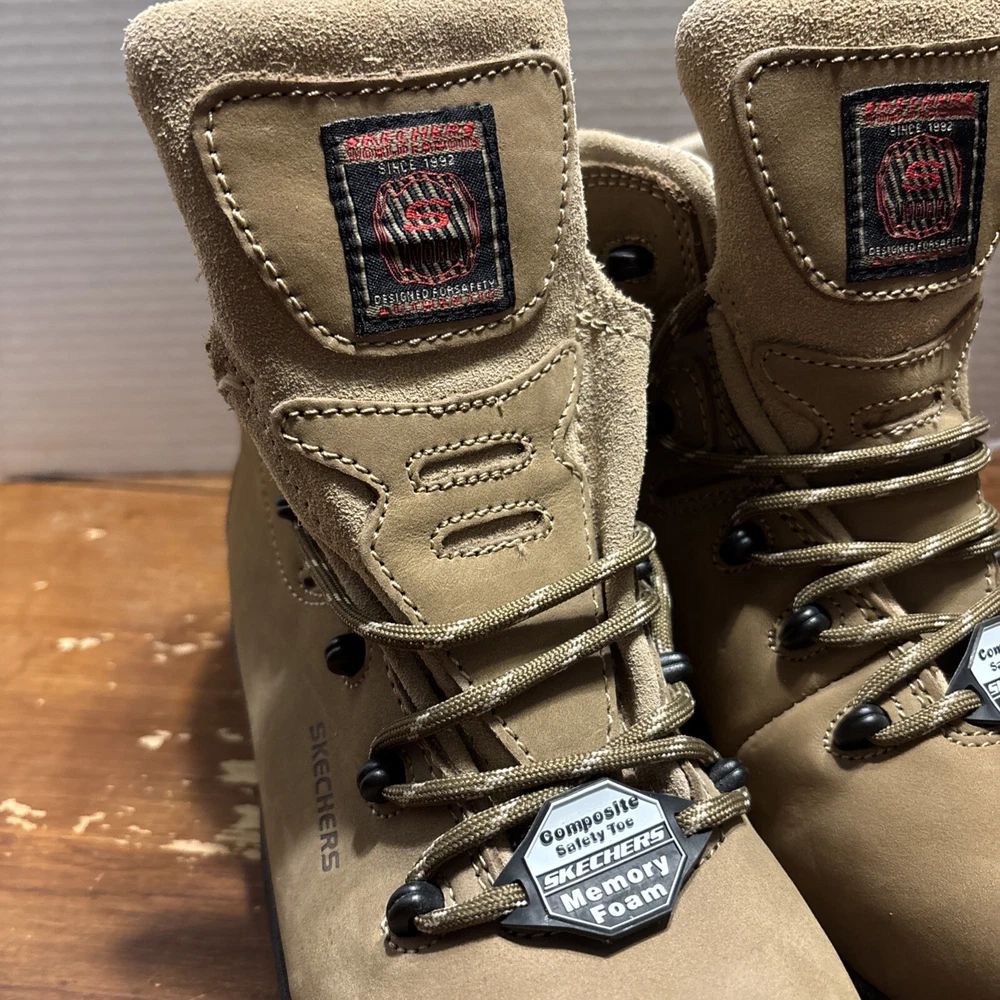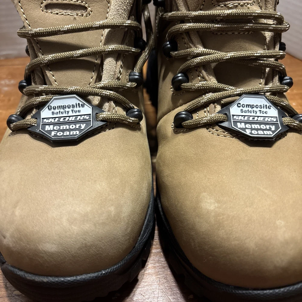 The product is a pair of SKECHERS men's work boots in size 8 with composite safety toe. They are khaki in color with a solid pattern, lace-up closure, and round toe shape. The boots feature air-cooled memory foam insoles for comfort, slip-resistant outsoles, and are oil resistant. They were manufactured in 2018 in China as part of the Skechers Memory Foam product line. Perfect for workwear in all seasons. International charges are the buyer’s responsibility. No international returns.