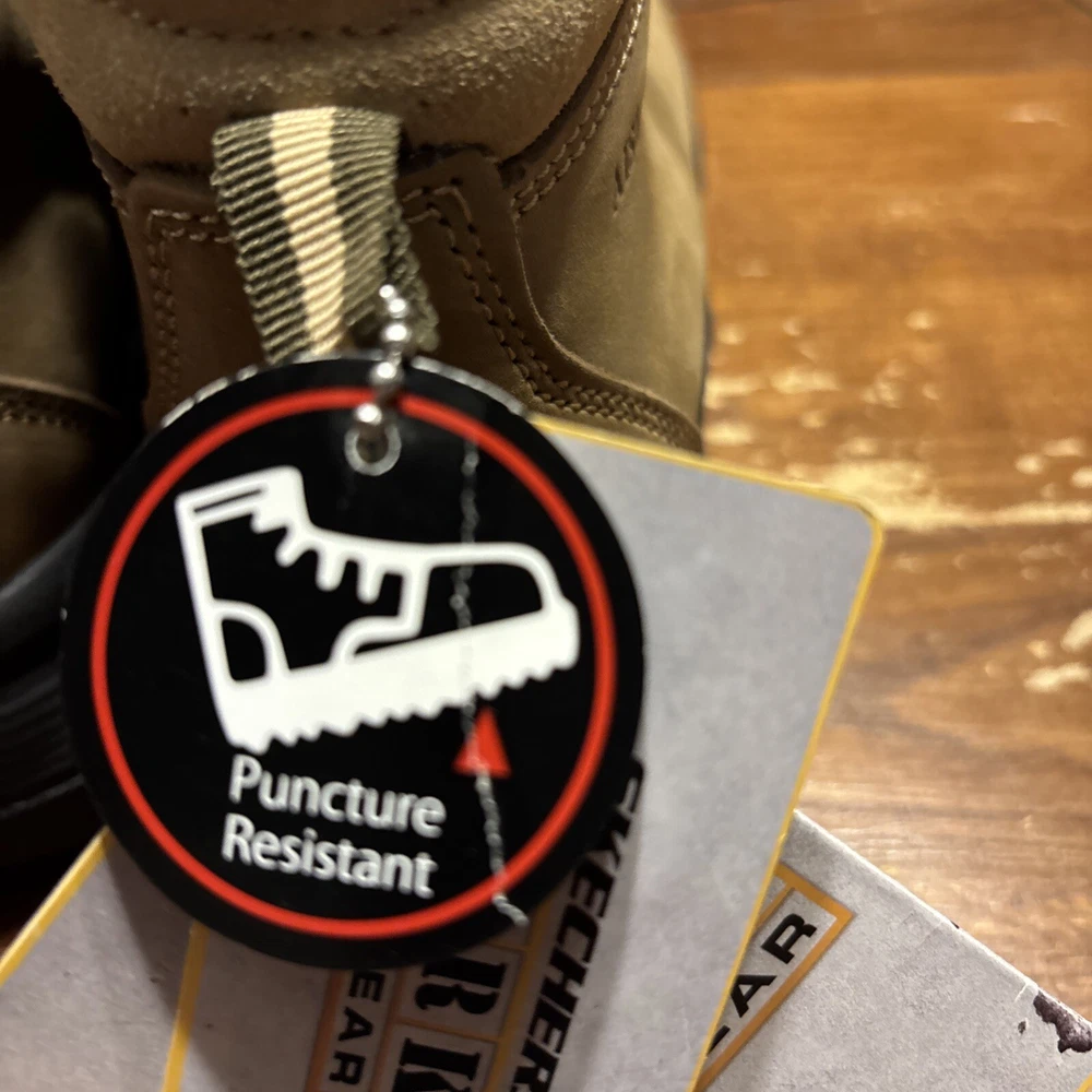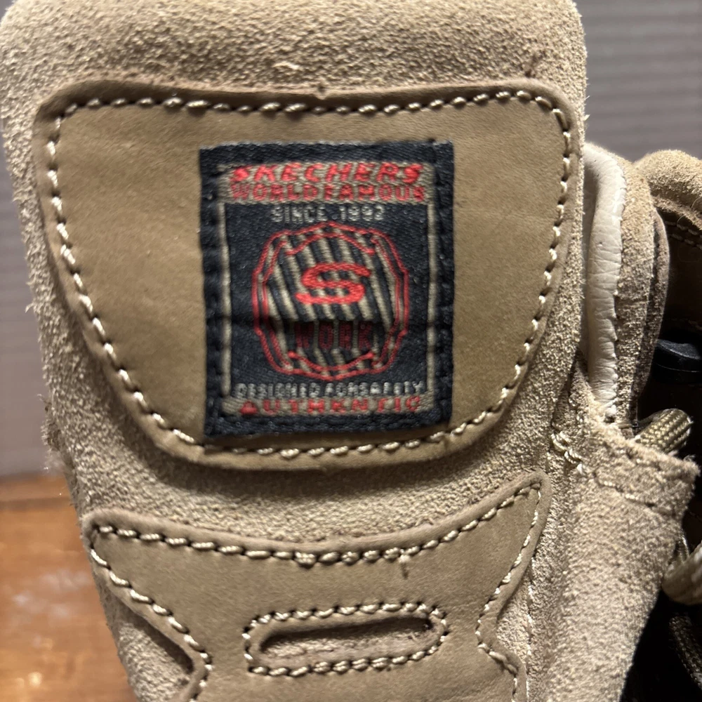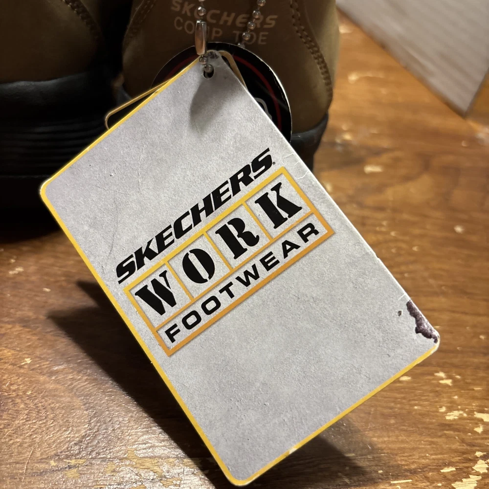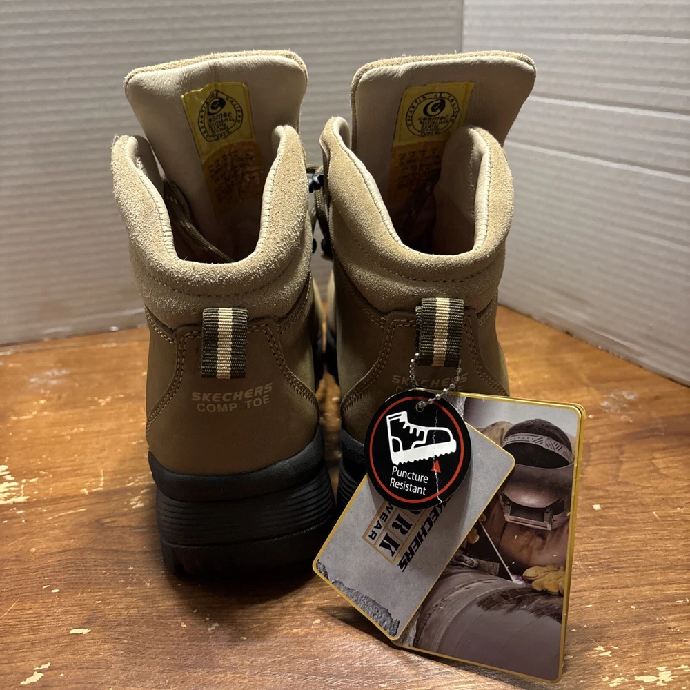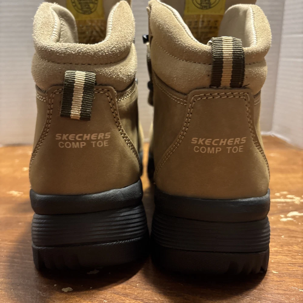 The product is a pair of SKECHERS men's work boots in size 8 with composite safety toe. They are khaki in color with a solid pattern, lace-up closure, and round toe shape. The boots feature air-cooled memory foam insoles for comfort, slip-resistant outsoles, and are oil resistant. They were manufactured in 2018 in China as part of the Skechers Memory Foam product line. Perfect for workwear in all seasons. International charges are the buyer’s responsibility. No international returns.