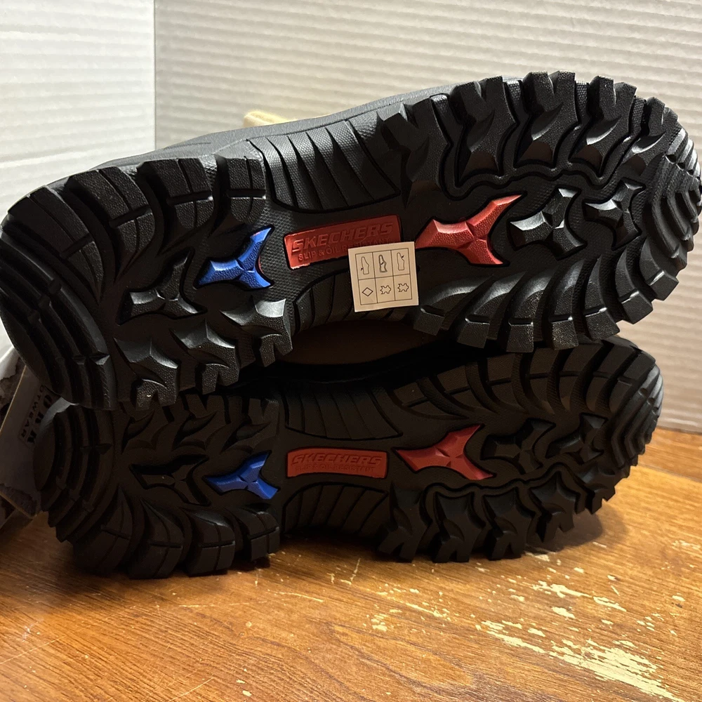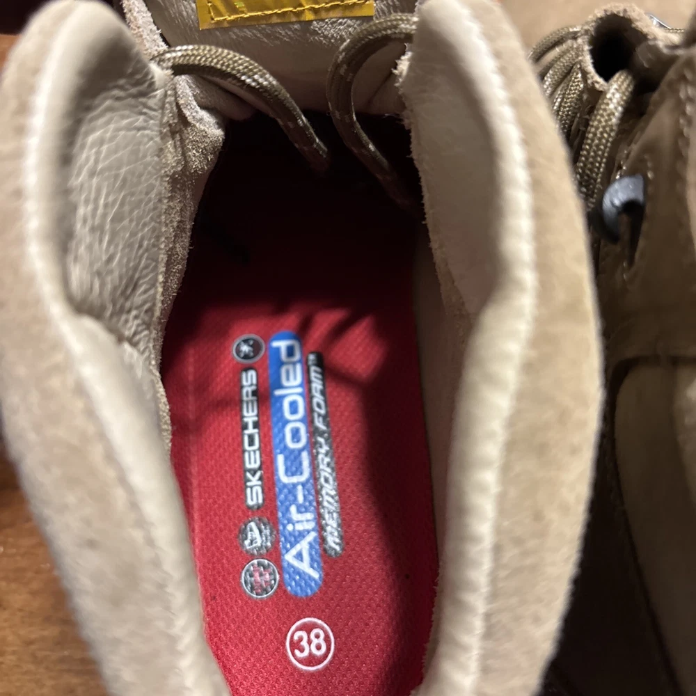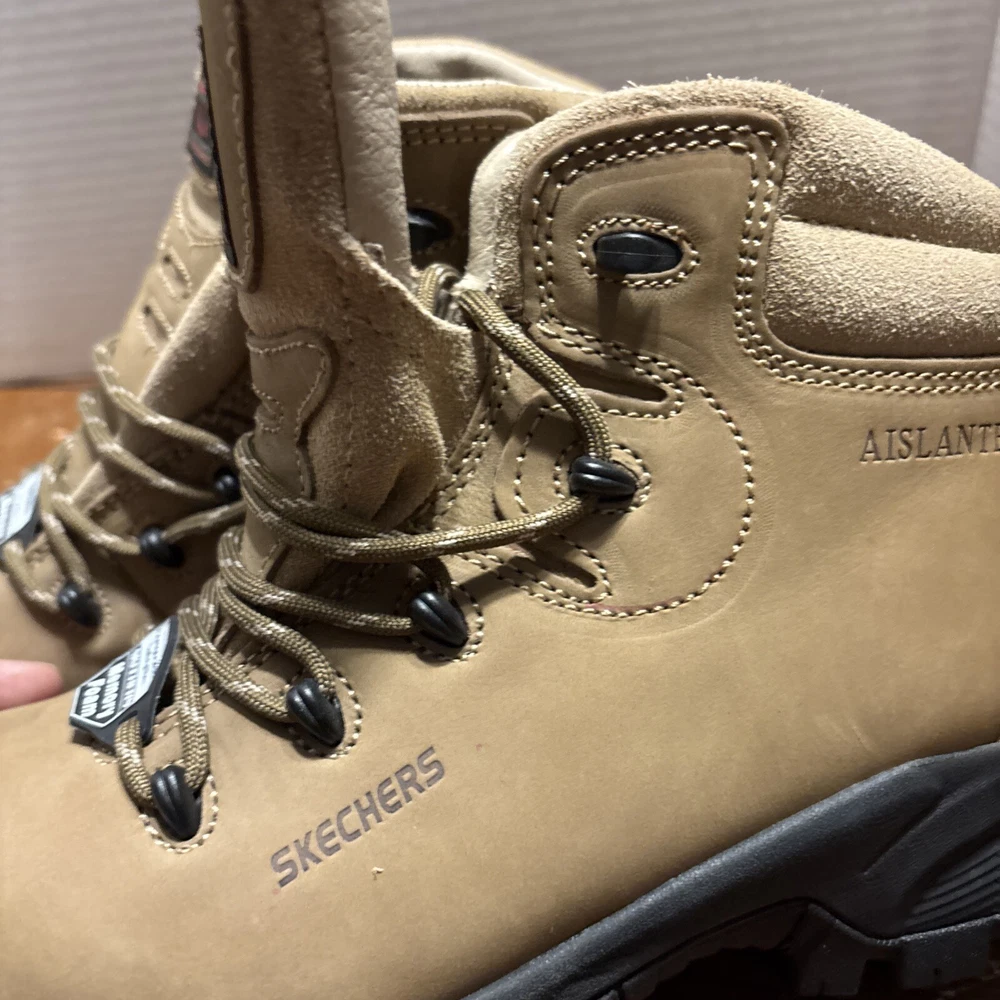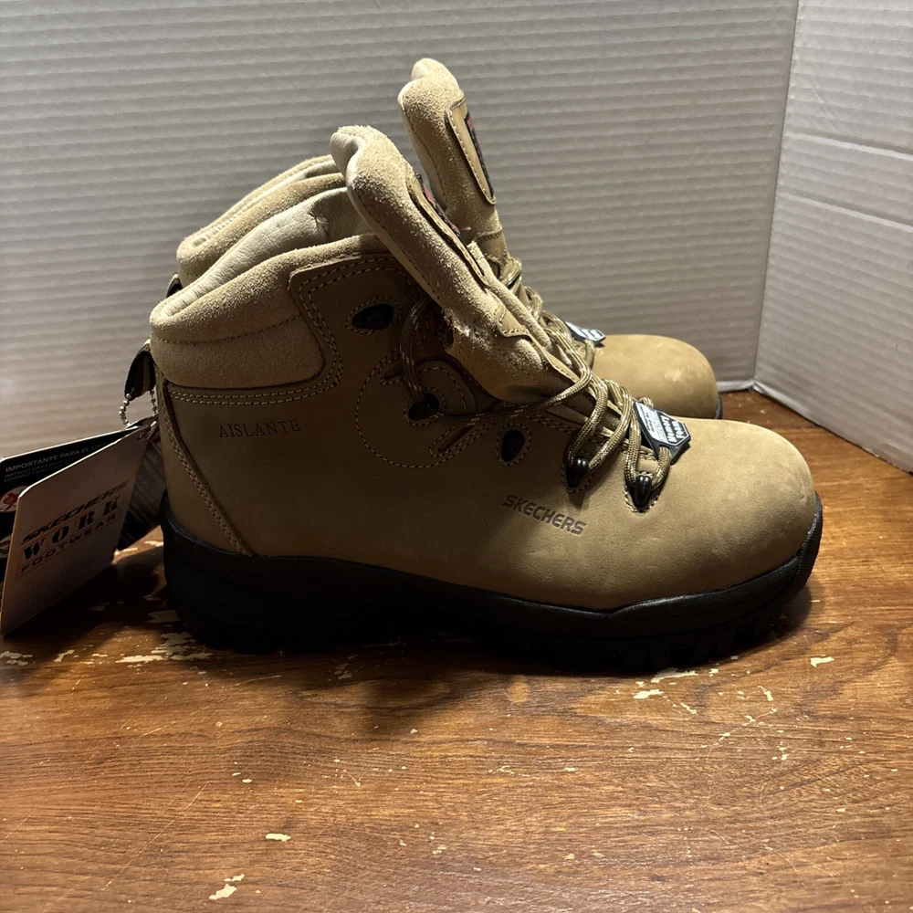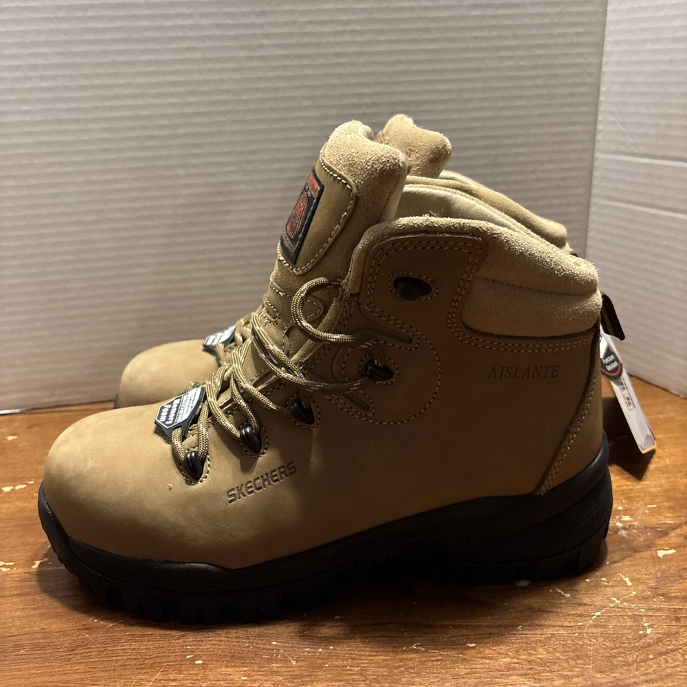 The product is a pair of SKECHERS men's work boots in size 8 with composite safety toe. They are khaki in color with a solid pattern, lace-up closure, and round toe shape. The boots feature air-cooled memory foam insoles for comfort, slip-resistant outsoles, and are oil resistant. They were manufactured in 2018 in China as part of the Skechers Memory Foam product line. Perfect for workwear in all seasons. International charges are the buyer’s responsibility. No international returns.