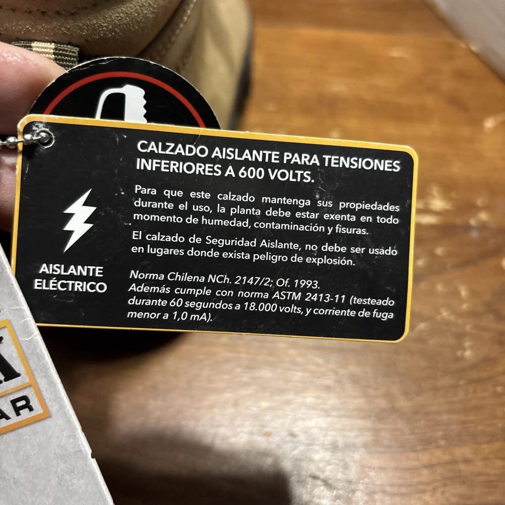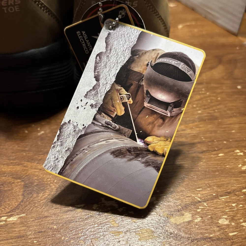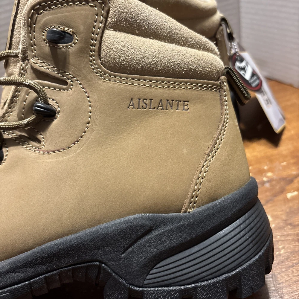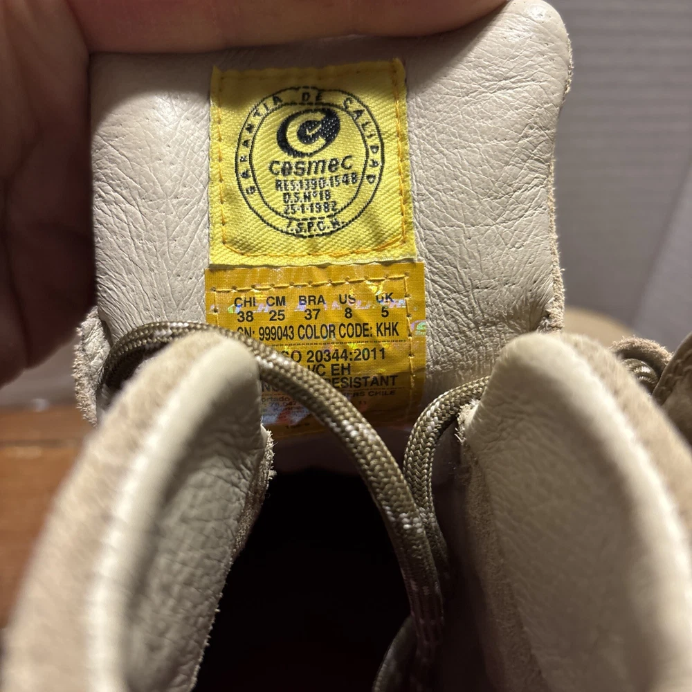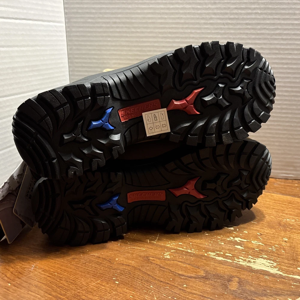 The product is a pair of SKECHERS men's work boots in size 8 with composite safety toe. They are khaki in color with a solid pattern, lace-up closure, and round toe shape. The boots feature air-cooled memory foam insoles for comfort, slip-resistant outsoles, and are oil resistant. They were manufactured in 2018 in China as part of the Skechers Memory Foam product line. Perfect for workwear in all seasons. International charges are the buyer’s responsibility. No international returns.