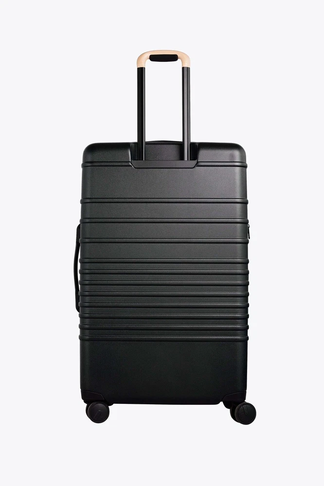 Introducing the Beis 29" Large Check-In Roller in stylish black. This luggage set is perfect for the frequent traveler who wants a reliable and stylish companion. With adjustable straps, a hard case, and lightweight design, this bag is easy to carry and navigate through crowded airports. In addition to its practical features, this bag also has a checked pattern and clothing compartment to keep your belongings organized. The Beis 29" Large Check-In Roller is TSA approved and comes with a weight sensor and shoe compartment. Expandable and with wheels for easy rolling, this bag is a must-have for anyone who loves to travel.