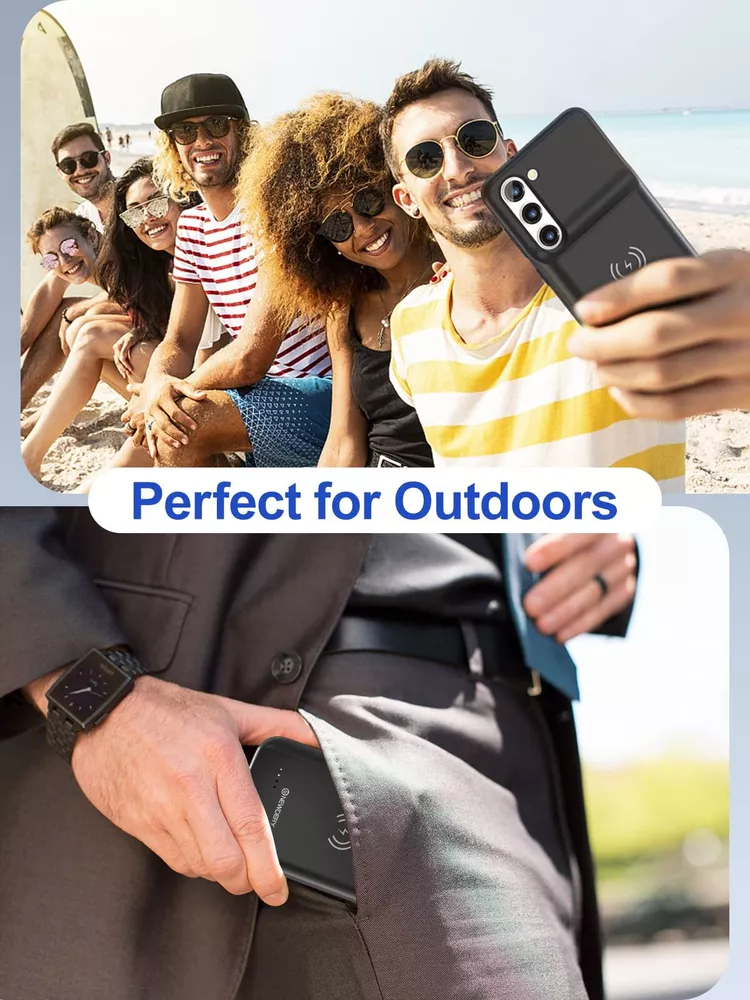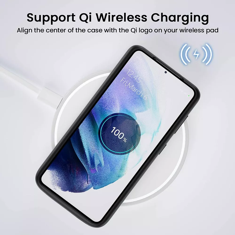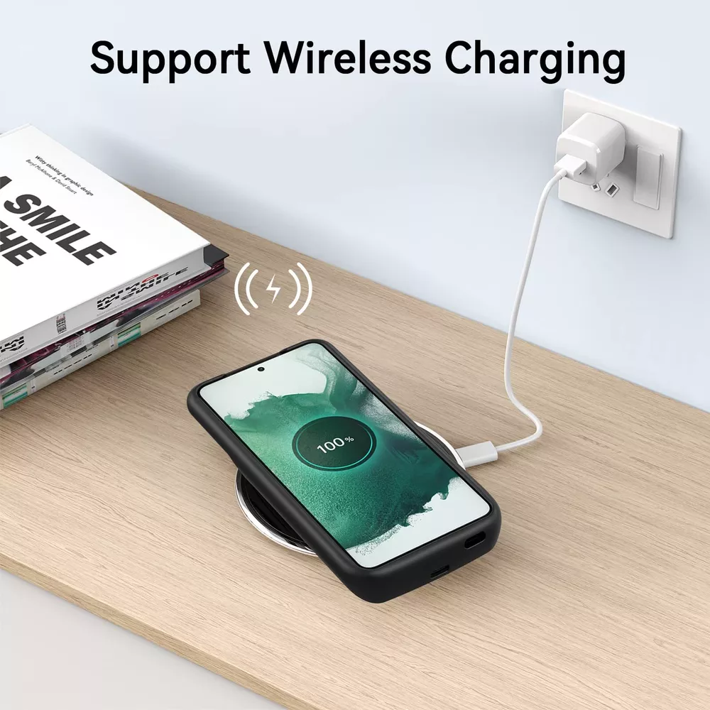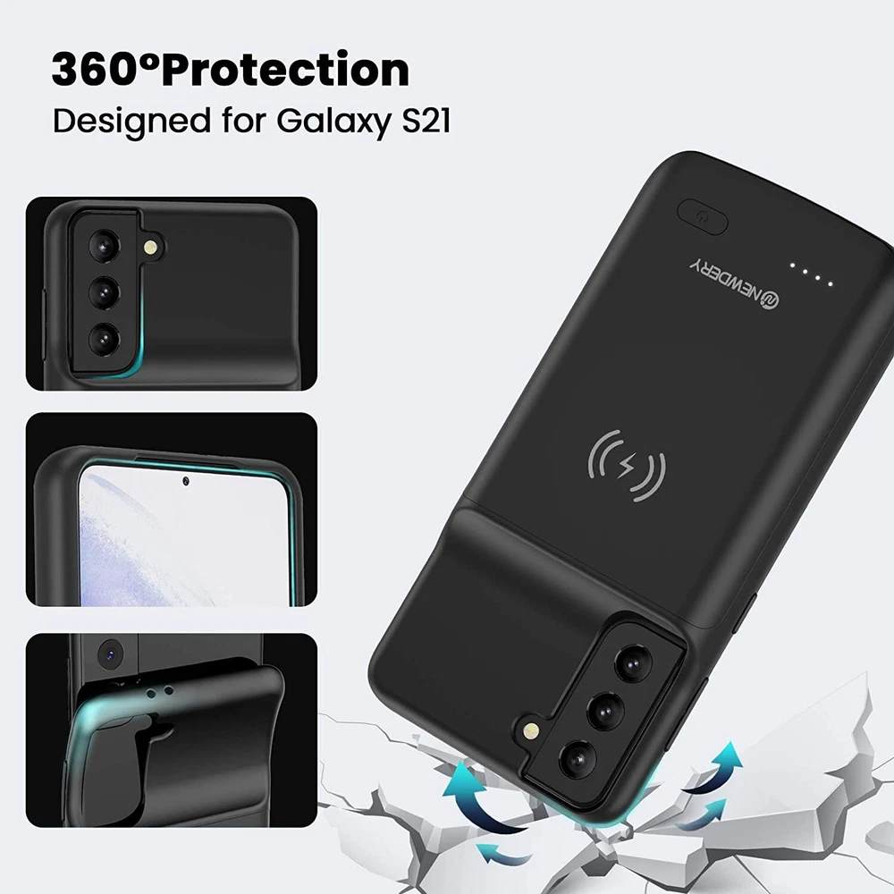 ================================ 【Qi Wireless Charging & Bluetooth headphones Supported】Newdery galaxy S21 S22 S23 S24 battery case allows you to charge the case and your phone simultaneously via Qi wireless charging pad (not included).ONLY support Bluetooth wireless headphones. 【EXTENDED 100% BATTERY LIFE】Samsung S21 S22 S23 S24 slim backup case battery with built-in 4700 or 4800 mAh rechargeable Li-polymer battery pack, doubles your battery life. The galaxy S21 S22 S23 S24 extended case is great for go shopping and travel. 【LED Indicator Light】All-in-One charging case makes convenience. If you charge your phone via Phone battery case at the first time, please hold the power button for 3s to start charging. Besides, it's convenience to track how much power left through ONE-clicking power button. 【360° PROTECT YOUR PHONE】Newdery Battery charger case is not only a portable power bank, but also a protective case for cellphone from scratches. Raised bezels help you to protect the screen to some extent. Please still add a protectors to your phone to prevent it from facing drops. Product Specifications: Capacity: 4700mAh or 4800mAh Input: USB-C DC 5V/1.8A (MAX) Wireless DC 5V/1A (MAX) Output: USB-C DC5V/1.5A (MAX) Battery case fully charges the phone: 2h To fully charge the battery case: 3.3h To fully charge the battery case via wireless charging pad: 4h To fully charge the battery case and the phone: 5.3h Dimensions:6.18*3.07*0.71 inch DOES NOT compatible with type-c headphones. DOES NOT support Data Sync/Samsung Pay/Android Auto/CarPlay. DOES NOT support magnetic/High Voltage, Quick Charge adapters. Charging via cable/Wireless station: You can charge the phone external battery case with phone via the original charging cable at the same time. And Newdery phone charging case can be charged via the Qi wireless pad without take off the case. What do you get Samsung Battery Case x 1 User Manual x 1 Card x 1 Easy to Use Slide your phone in slowly, make sure the connector of the Phone charger case with phone properly. Press the button for 3s to begin/stop charging your phone If you need to take it off, bend the top soft rubber of the case, then push your phone up slowly.