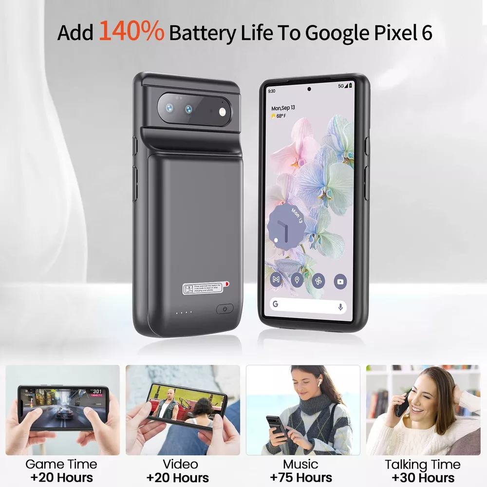 NEWDERY Battery Case for Google Pixel 6 6.4", 10000mAh Ultra Powerful Rechargeable Charging Case, Protective Extended Backup Charger Case for Google Pixel 6 5G (2021 Released) Description Features: [Battery Case for Google Pixel 6 6.4" ] NEWDERY 10000mAh battery case ONLY for Google Pixel 6 5G-6.4inch (NOT for Pixel 6 pro 6.7"). Due to it will extended 140% power to your phone, it will adds the weight and volume to the phone. Note: NOT support wired headphone, wireless charging, Android Auto or transfer data. [10000mAh Pixel 6 Battery Case] Equipped with a powerful 10000mAh built-in lithium polymer battery chip, effectively adds 140% power to your phone, never worried about your phone ran out of battery in daily life. Perfect for traveling, camping or business trip. [Smart LED Indicator] Smart LED indicator make you easy to track the battery power. The 4 LED lights on the back show the consumption of the charger case(0-25%-50%-75%-100%). One-click to start to charging your phone or track the battery, double-click to stop charging. [ Full Protection & Safe Charging] Soft rubber and hard shell plate protect your pixel 6 from scratches and collisions. Raised bezels help you to protect the screen to some extent. Pixel 6 5G battery case certificated by CE, FC and RoHS. Built-in smart chip protect your phone from overheating, short-circuit and overcharging. Provides a safe charging environment to your phone. [What you get] Package including: 1*Battery Case for Google Pixel 6, 1*User Manual. If you have any problem, please feel free to contact us via your order. You will get the professional service from our NEWDERY Customer Support Team. Product Details: Brand: NEWDERY Compatible Phone Models: Google Pixel 6 5G-6.4inch Color: Pixel 6 Compatible Devices: Google Pixel 6 Material: Rubber Product Dimensions: 6.45 x 3.18 x 0.94 inches Item Weight: 7.4 ounces Item model number: ZHX-205B Batteries: 1 Lithium Ion batteries required. Special features: Shock-Absorbent Other display features: Wireless Form Factor: Bumper Color: Pixel 6 Manufacturer: Shenzhen Zhenghaixin Technology Co., Ltd. Country of Origin: China Date First Available: September 24, 2021 Handling We will ship all orders within 3 business days of payment. Delivery We do not ship outside of the Continental US. Feedback We take our reputation seriously, we buy and sell online, so we understand the value of trust. If you are unsatisfied with your order, please contact us and we will work with you to resolve it to your satisfaction.