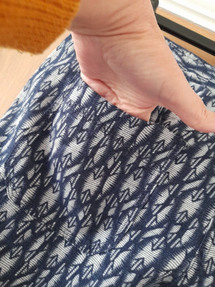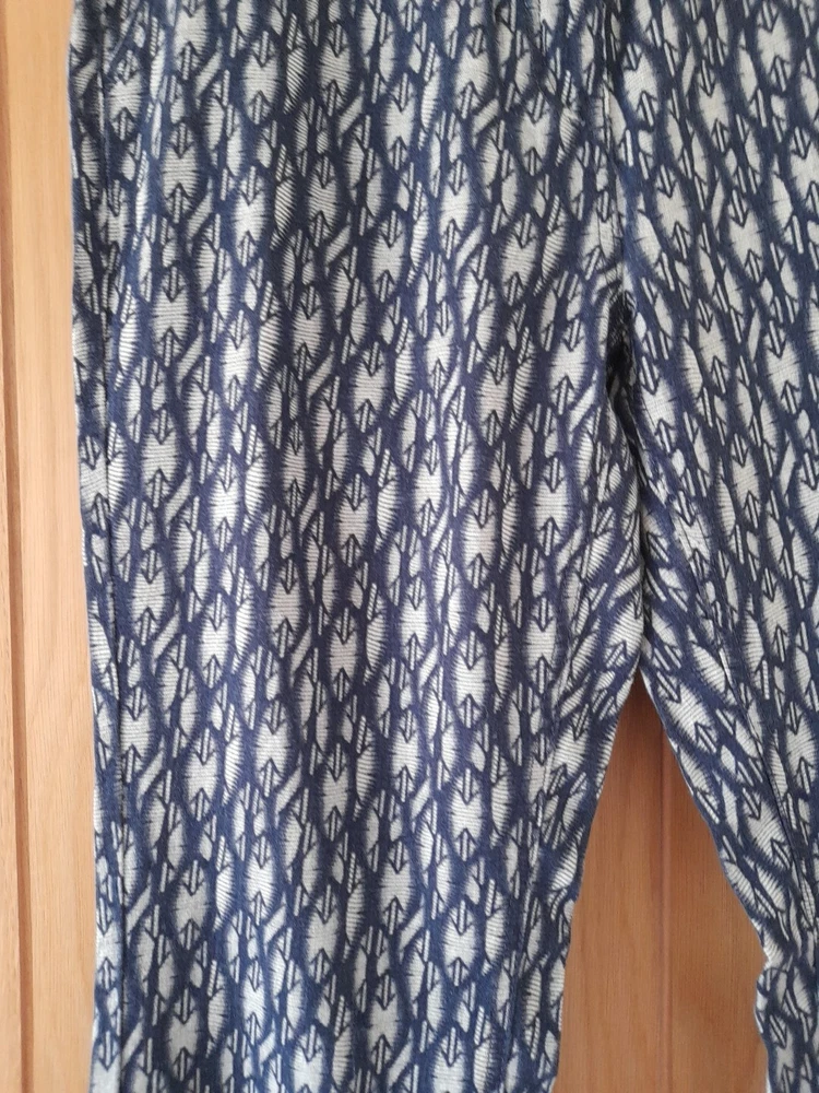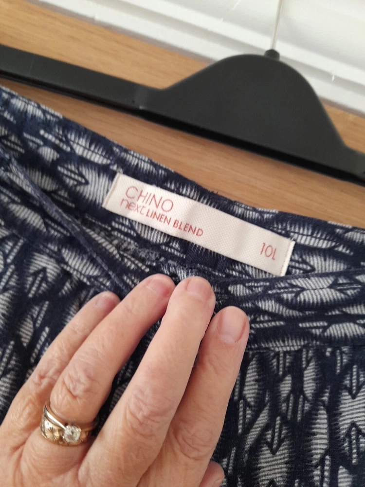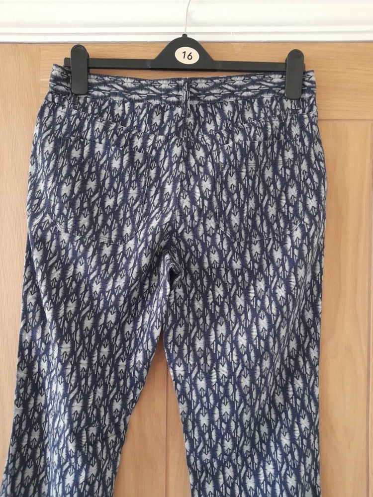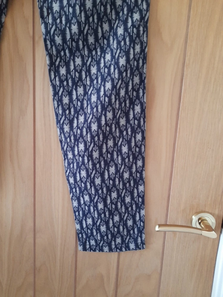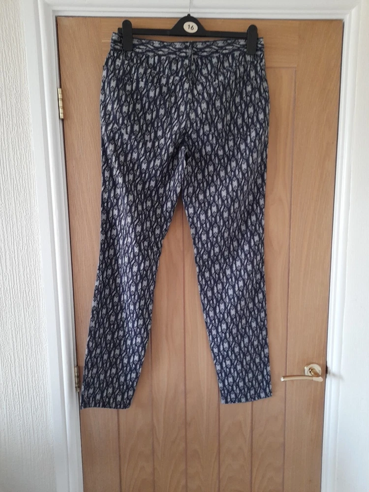 NEXT navy blue and grey patterned linen blend trousers size 10 with tapered legs. Waist 32" inside leg 31" . Two side pockets , zip front and patch back pockets. In good condition. Pet/smoke free home. Look at my other items, please message for discount and combined postage if purchasing more than one.