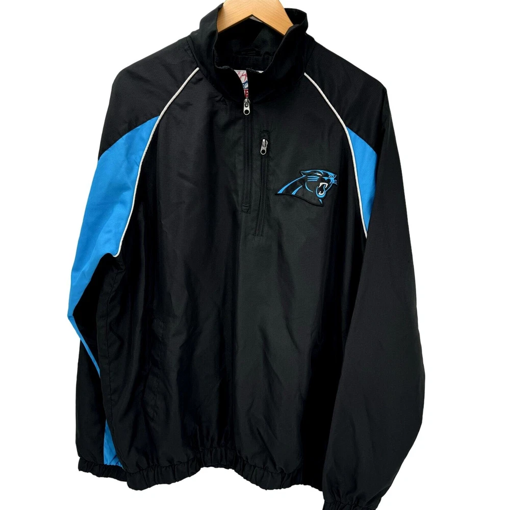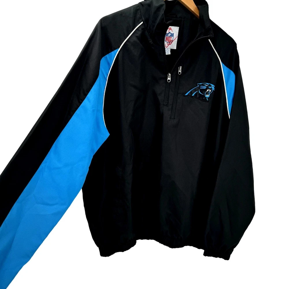 NFL Carolina Panthers Jacket Mens Large 1/4 Zip Pullover Black Blue Windbreaker Very good condition, see all pictures for views. WRITING IN MARKER ON INSIDE TAG. •Pit to pit: 24" •Shoulder to hem: 29" Ships out same day or next open postal day. Thank you for your purchase, we appreciate you!