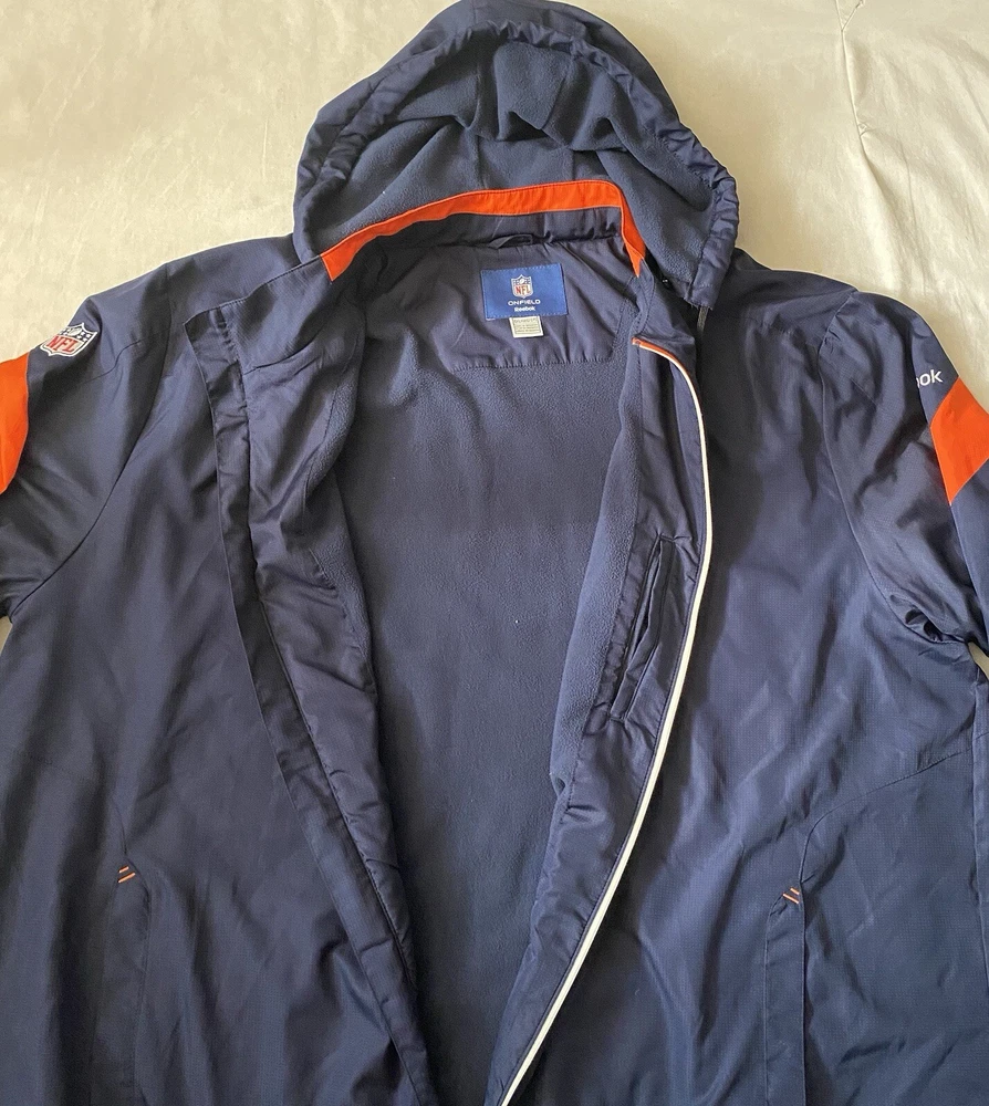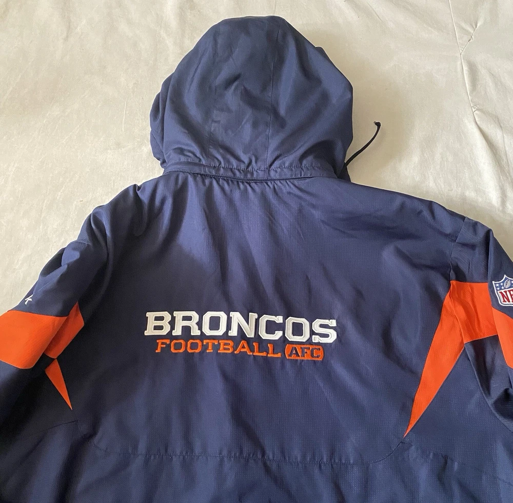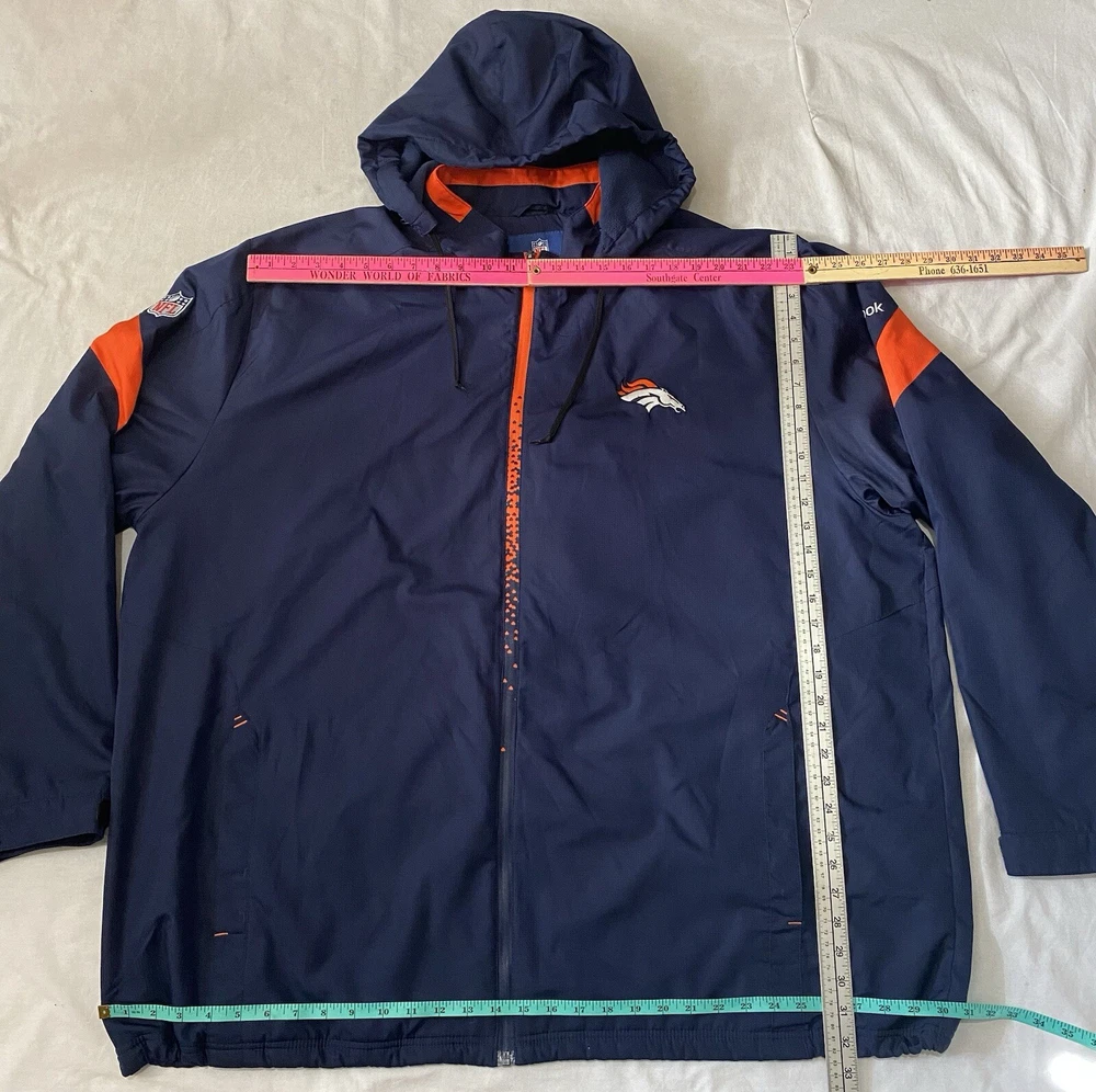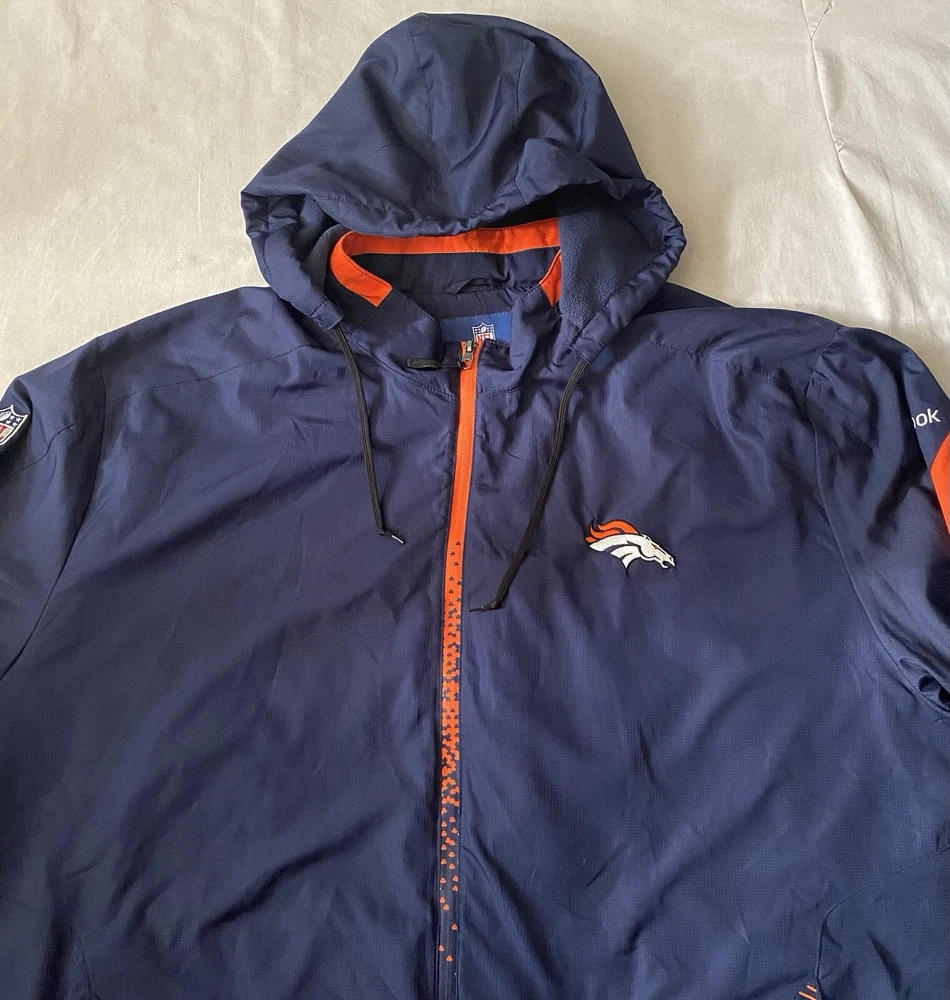 Brand:ReebokCountry/Region of Manufacture:IndonesiaFeatures:Full Zip, Hood can be removedOccasion:CasualSize:4XLInsulation Material:NoneClosure:ZipLining Material:PolyestersVintage:NoSize Type:RegularAccents:ZipperOuter Shell Material:PolyestersTheme:SportsPerformance/Activity:FootballFit:AthleticSeller Notes:“Good condition as seen in photos.”Style:WindbreakerSeason:Fall, Spring, WinterColor:Blue OrangePattern:BroncosType:JacketDepartment:Men