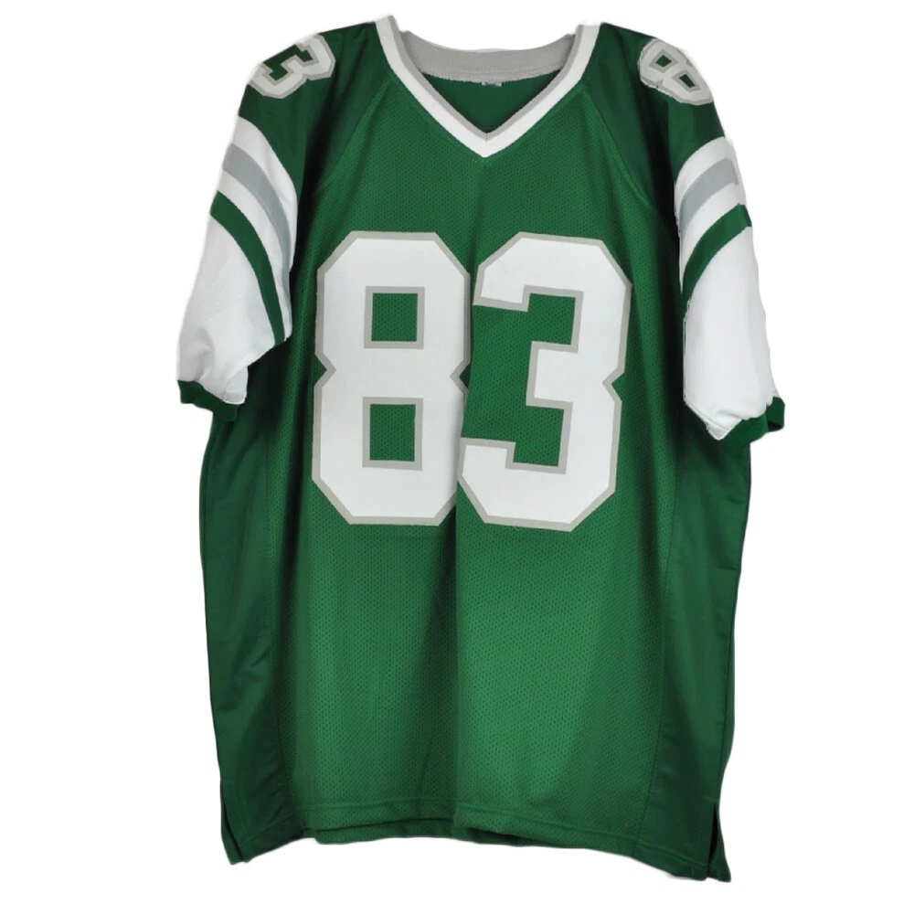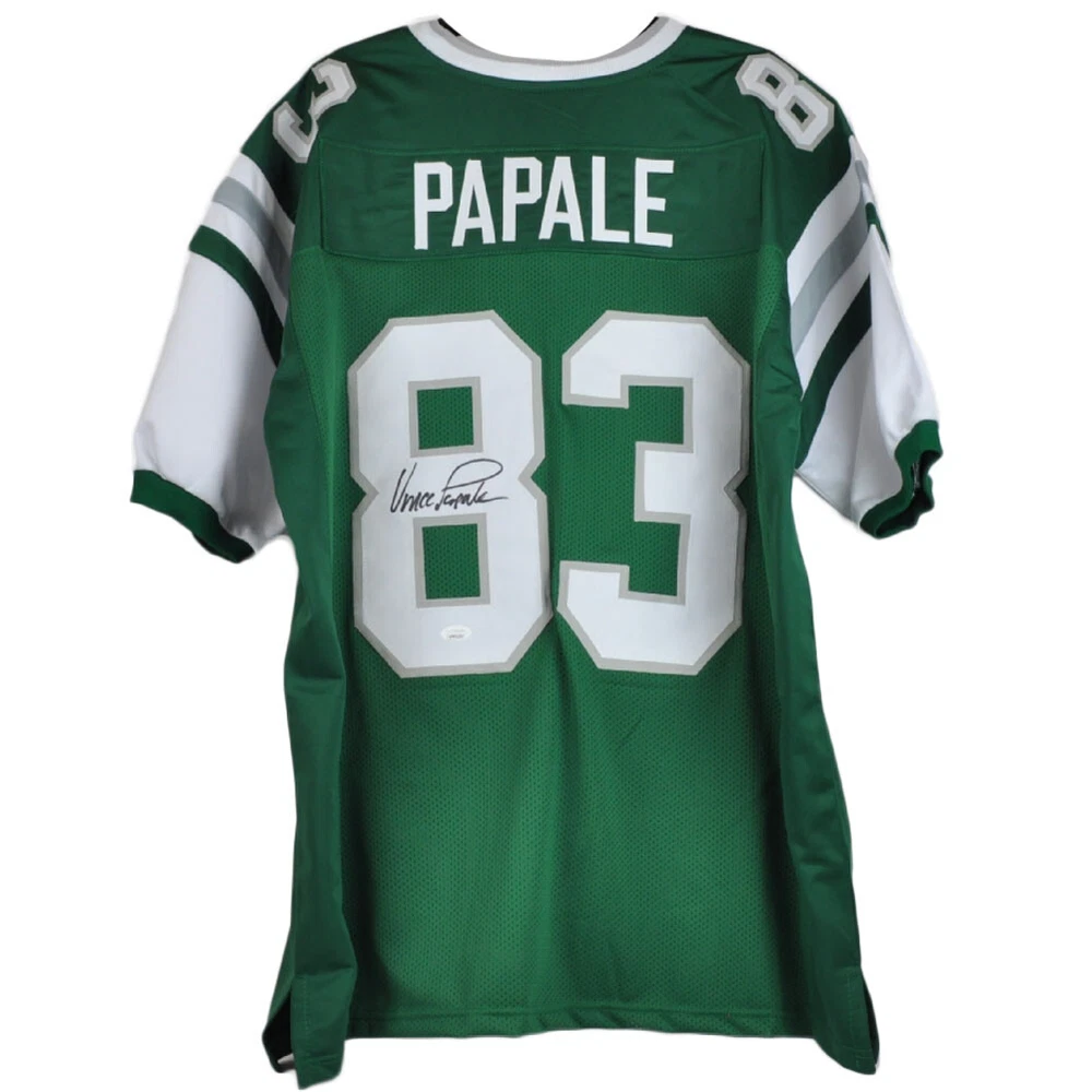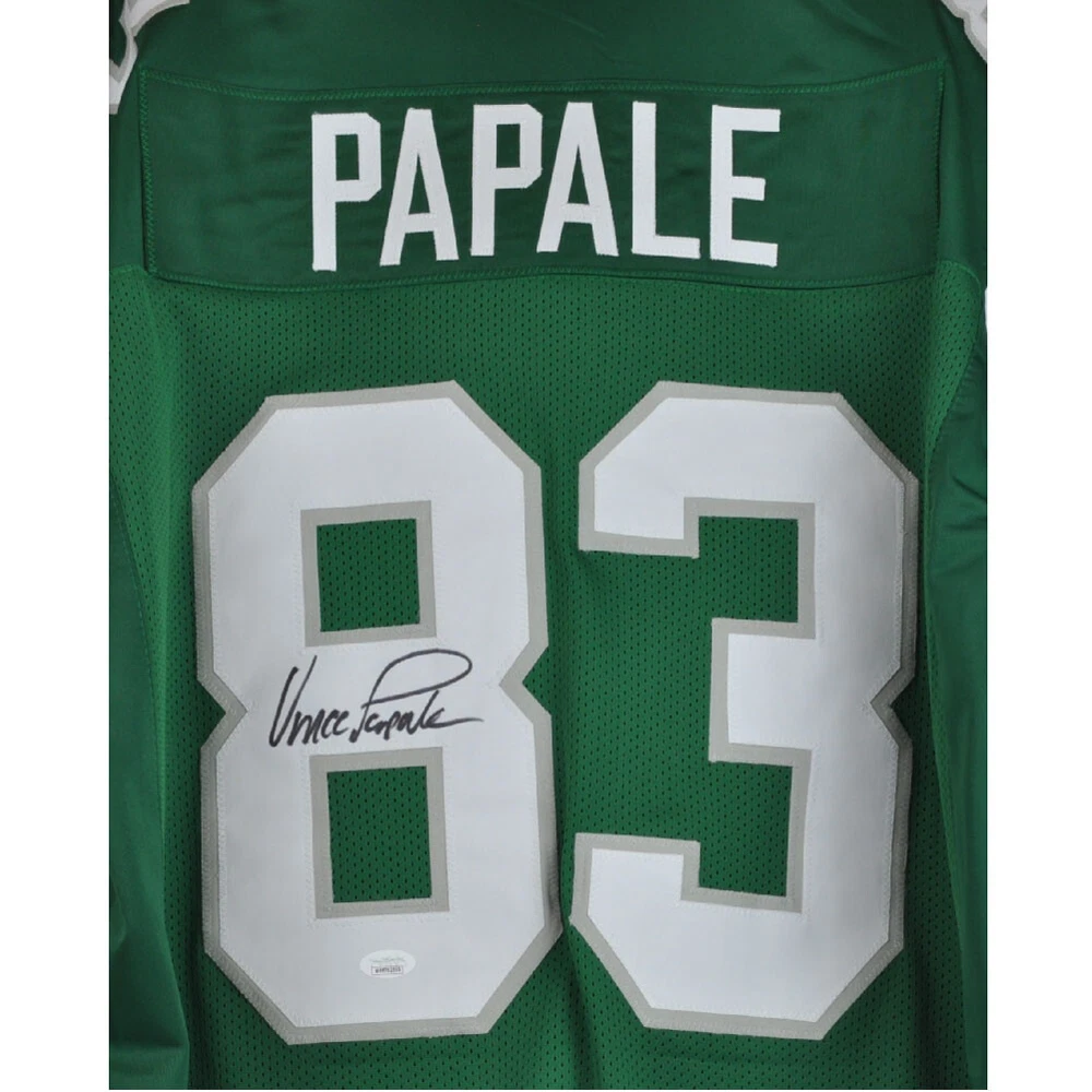 This Vince Papale #83 jersey features embroidered player number on jersey front; embroidered player last name and number on jersey back. Papale signed this jersey on the player number on the back with a black sharpie. Shop with confidence as this product has been authenticated by JSA and comes with numbered decal.