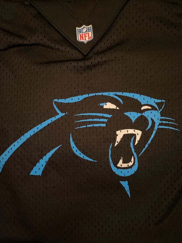 NFL~NEW~Carorlina Panthers Jersey Tote Bag~Black & Blue~NWT *Color: Black with blue & silver panther and stripes *Shoulder strap is adjustable *Bag zips across the top *One small pocket inside *Approximately 13 inches from top of tote to the bottom and 17 inches from side to side *NEW with retail tags attached *We have a smoke free home