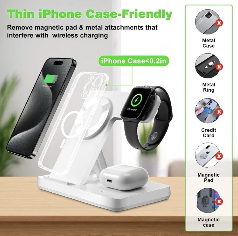 Introducing the NIB 3 In 1 Wireless Charging Station, perfect for all your charging needs. This charging dock is designed for Apple products and comes with a charging cable. The station has a matte white finish and is made of plastic. With its wireless charging feature, you can easily place your phone on the magnet and it will start charging. This charging dock is perfect for desktop or desk use and is a great addition to your cell phone accessories. Brand new in box, never opened