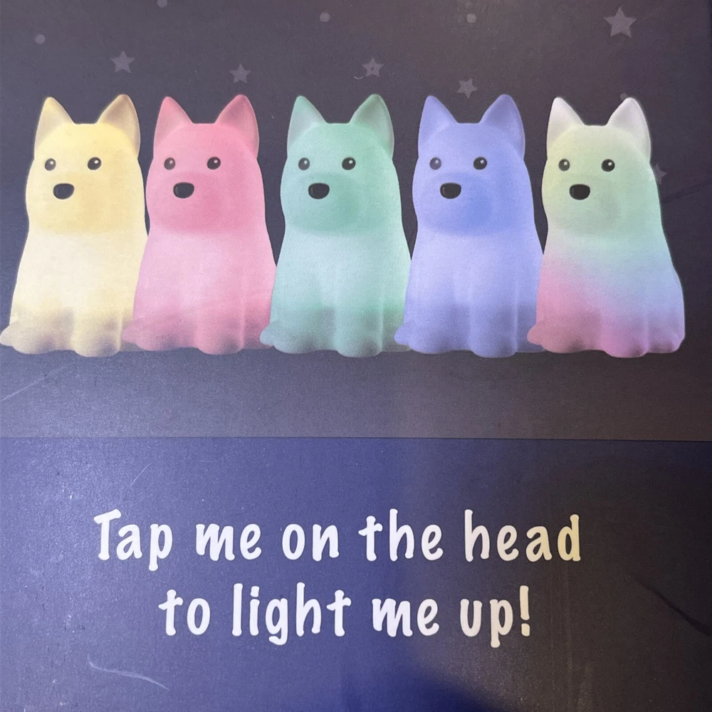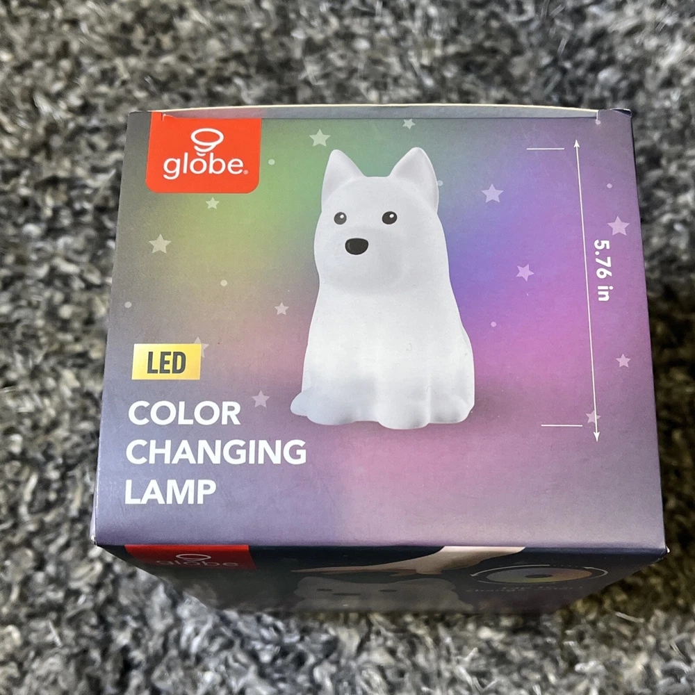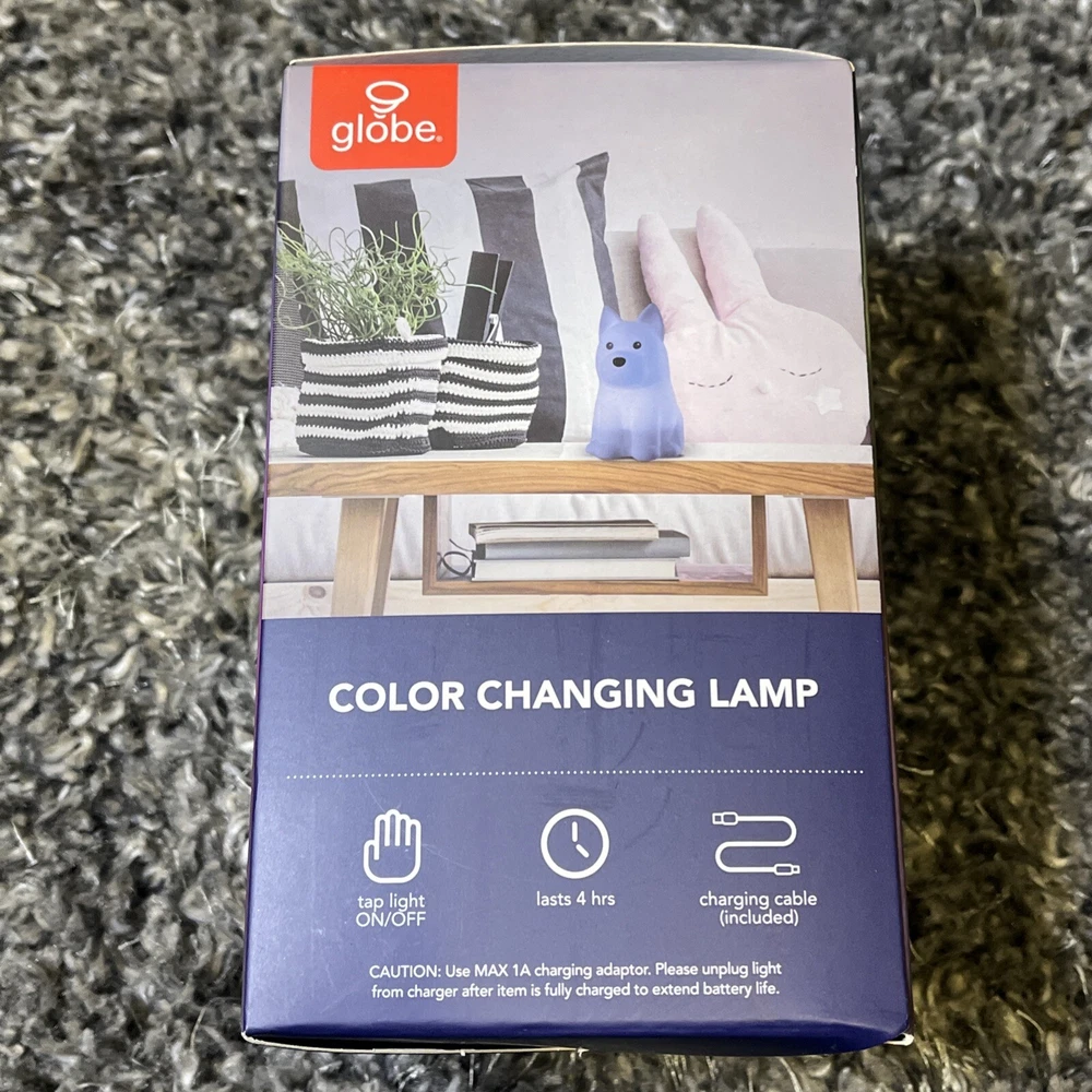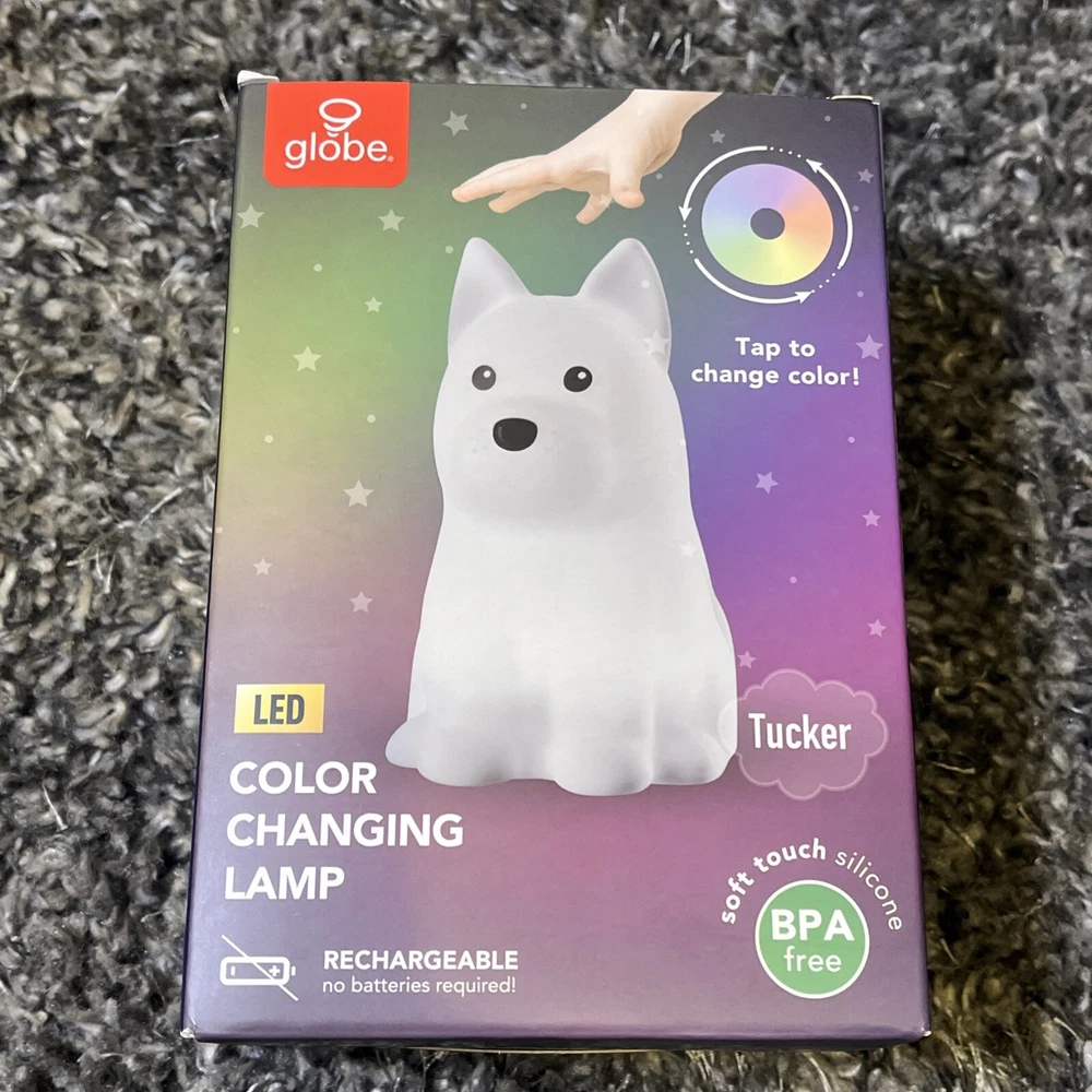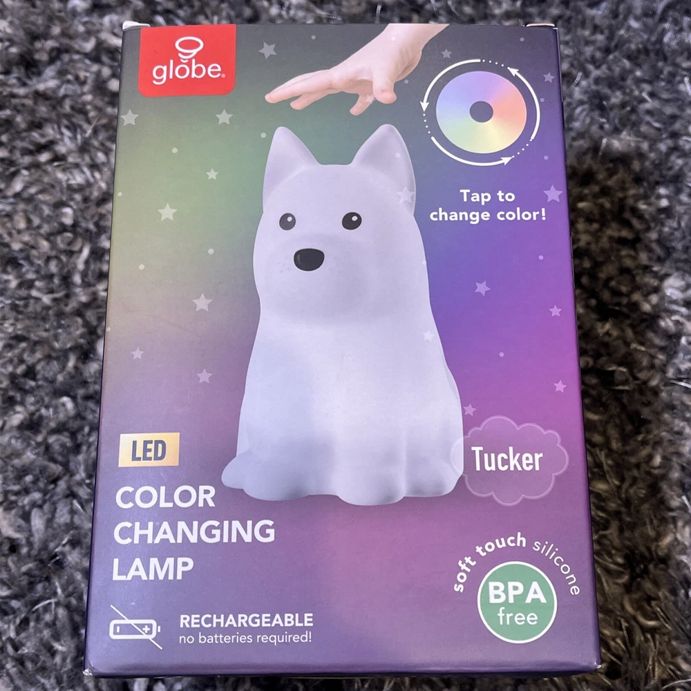The NIB Globe Tucker The Dog LED Color Changing Rechargeable Lamp is a whimsical and functional bedside lamp for kids. Made of BPA free silicone, this free-standing lamp features a touch sensor for easy on/off functionality. It emits a multicolor light through LED technology and is powered by USB for convenience. With a cute dog design and color-changing feature, this lamp is perfect for creating a cozy and playful atmosphere in a child's bedroom or any indoor space.