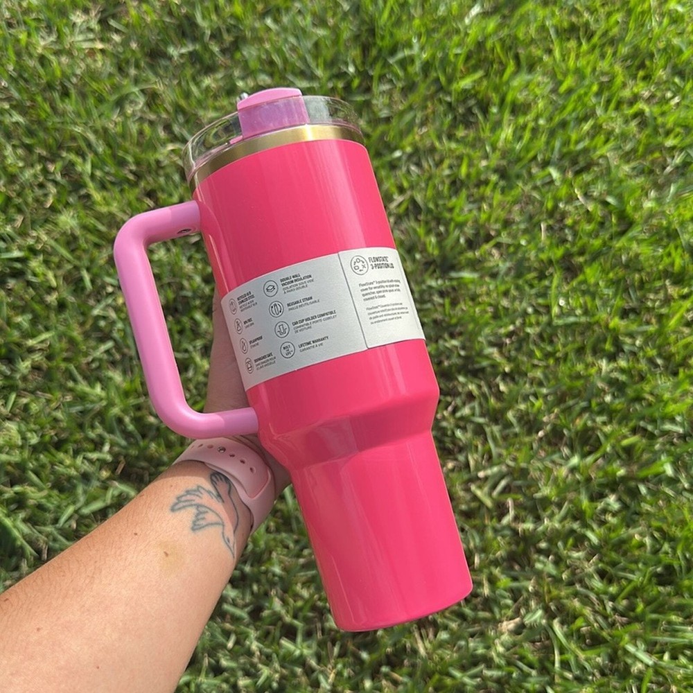 New in box Taken out for pictures 40oz - Pink Parade; Released 2023 - Pink straw included - Gold etched Stanley logo