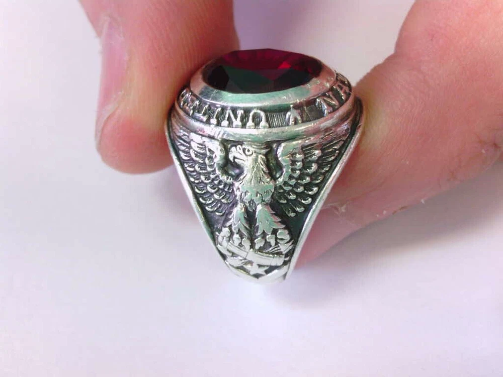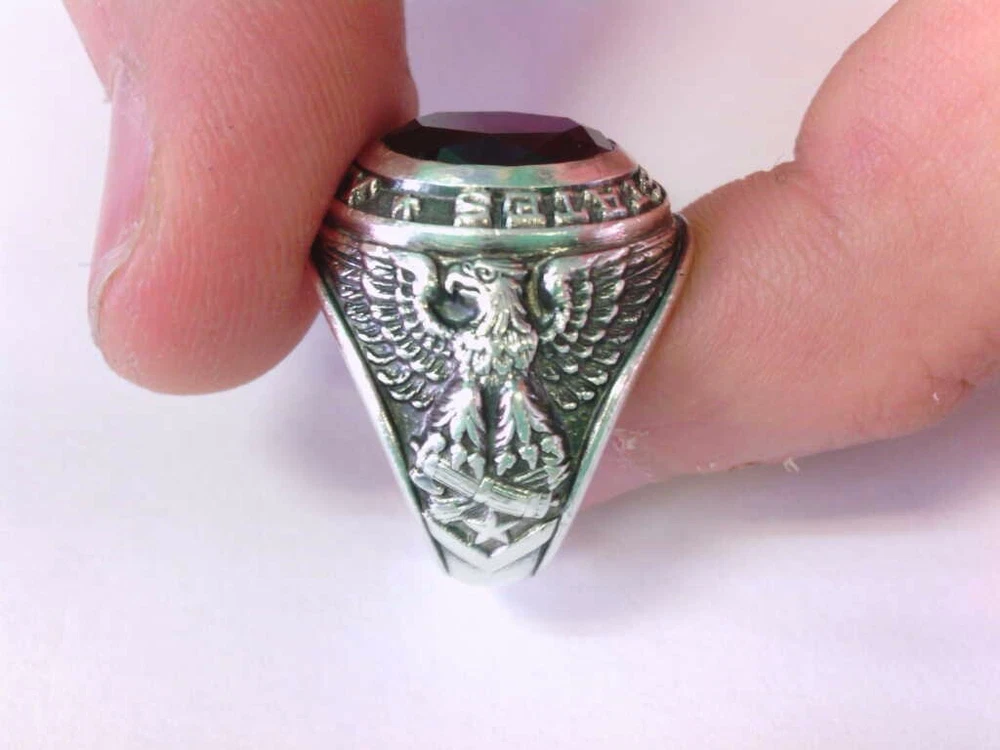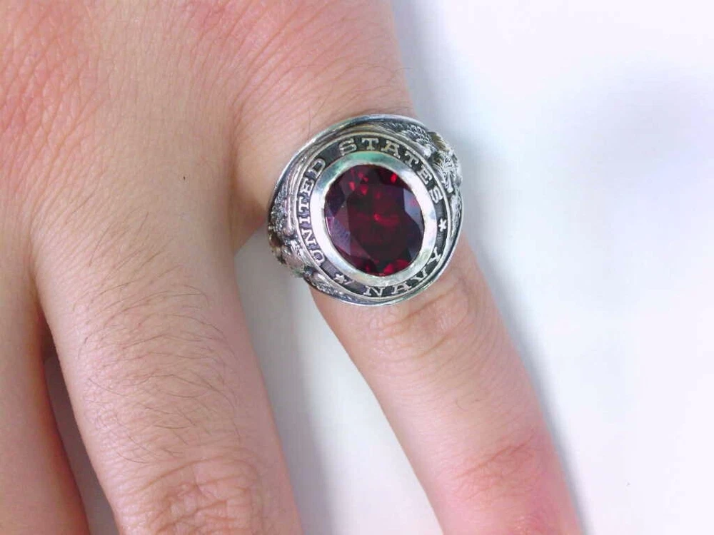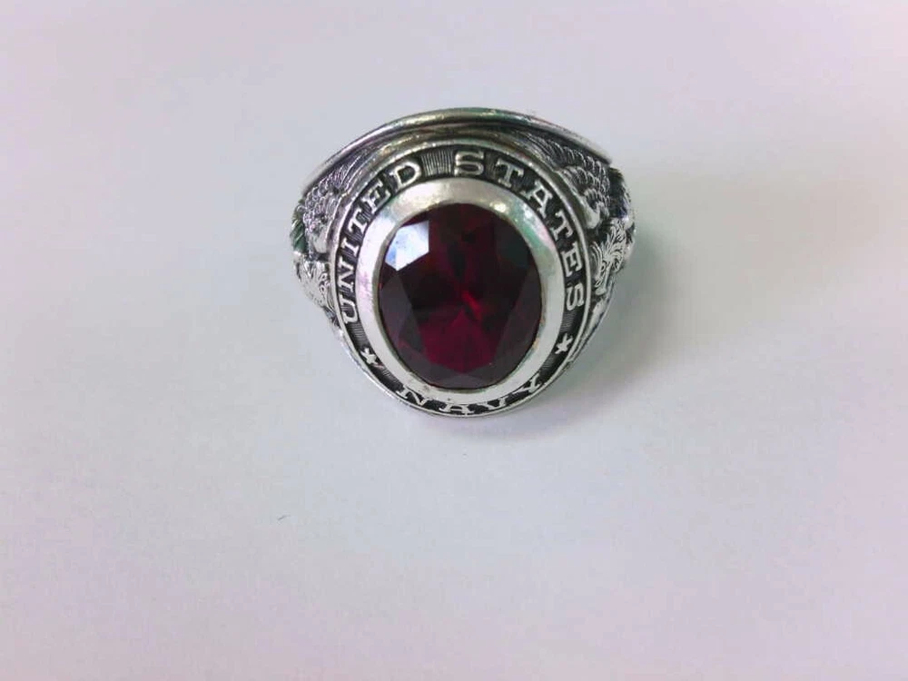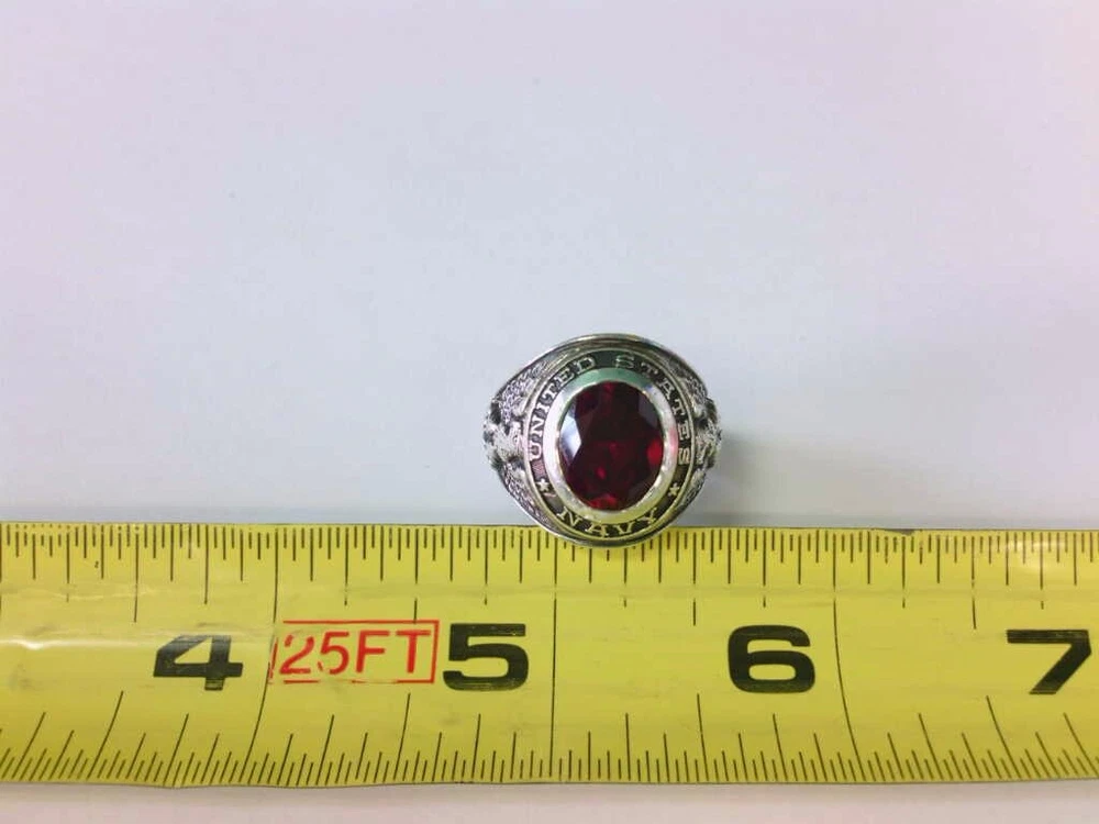 You are viewing a NICE Vintage United States Navy Eagle Sterling Silver Ruby Ring. BUY NOW! Read below for further details... Seller's Notes: I have sold and currently listing some wonderful items to the great people of eBay. This is the exact item you will receive. Overall in good- almost very good pre owned vintage shape- heavier toning, hairlines , deeper nics - I don't see any cracks or chips on the stone- nothing to mention about the aesthics of the Ruby stone. Ring says United States Navy looks like the class ring/ generic variety . Eagles on both sides of the ring. 6.25 US size - I do not know if it will fit your finger - Looks sizable but not sure by how much. I do not offer this service. YOU MAY KNOW MORE ABOUT THESE TYPES OF RINGS. Was not cleaned and prefer the new owner to do as they please. See high def pics to determine condition, style, etc. PLEASE CHECK OUT MY OTHER LISTINGS. THANK YOU!! Particulars: Total weight- 11.6 grams Hallmark- Sterling Size- 6.25 US Size. Looks sizable I DO NOT OFFER THIS SERVICE. I do not know how much you can size the ring. Please view pics for other measurements. Measurements in inches. Please convert to your specs. Ring will be in the bag you see in the pic. Foreign bidders- total shipping weight will be 2 ounces. Bidding and Shipping: I will ship to 48 states. USPS Priority with tracking and insurance. Buyer will pay a flat fee of $5.99. Alaska, and Hawaii will pay a shipping rate based on eBay. Overseas shipping using eBay Global Shipping- YES PLEASE NOTE: I WILL NOT SHIP THIS PERSONALLY- MEANING I WILL USE EBAY GLOBAL SHIP TO SHIP THIS ITEM THEREFORE OVERSEAS BIDDERS YOU WILL HAVE IMPORT CHARGES. I DO NOT KNOW OR AM I RESPONSIBLE FOR THOSE CHARGES. PLEASE CONSIDER THIS BEFORE YOU MAKE YOUR BID. THANK YOU. I WILL ALSO OFFER A 2ND OPTION - FOR THOSE WHO DO NOT WANT GLOBAL SHIP. IT MUST BE A RECOGNIZED COUNTRY THAT WILL ALLOW ME TO SHIP THRU EBAY. I WILL NOT CALL THIS ITEM A GIFT WHEN SHIPPING OVERSEAS. Please pay within 2 days after the auction is complete. I usually ship 1-2 days after receiving clear payment. Sometimes sooner depending on time constraints. Item sold "as is" We have the right to end this auction at anytime. I do not ship on Saturdays Great feedback is always appreciated!!! This is a "BUY NOW" auction. Priced to sell!!! Will combine shipping- Just let me know. Thank you!! ____________________________________________________________________________ Vintage USN Sterling ring ready to be added to your collection. If you have any questions please feel free to contact me at anytime. I usually respond within 24 hours sometimes sooner. Thank you and happy bidding!! PLEASE TAKE A MOMENT AND CHECK OUT MY OTHER AUCTIONS!!