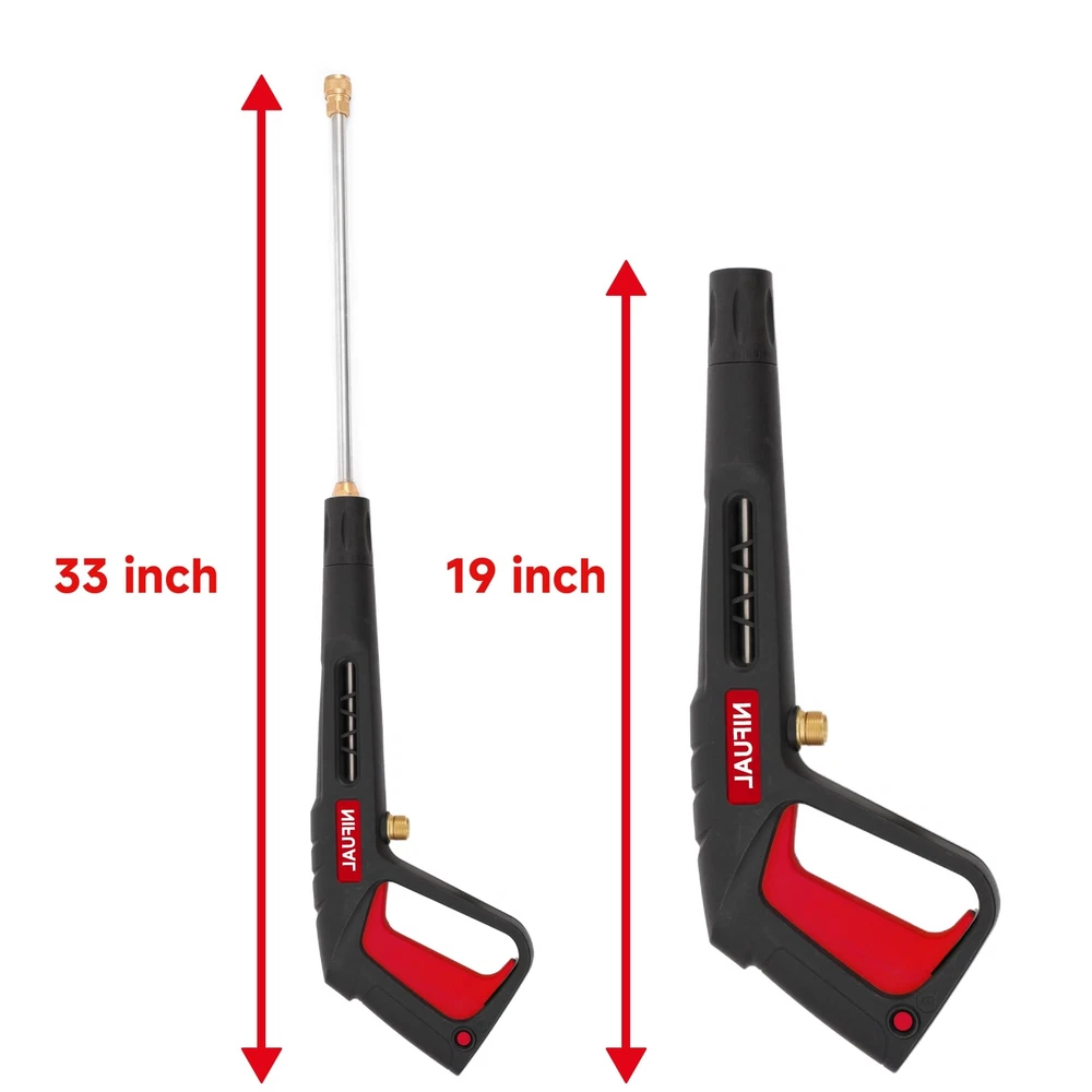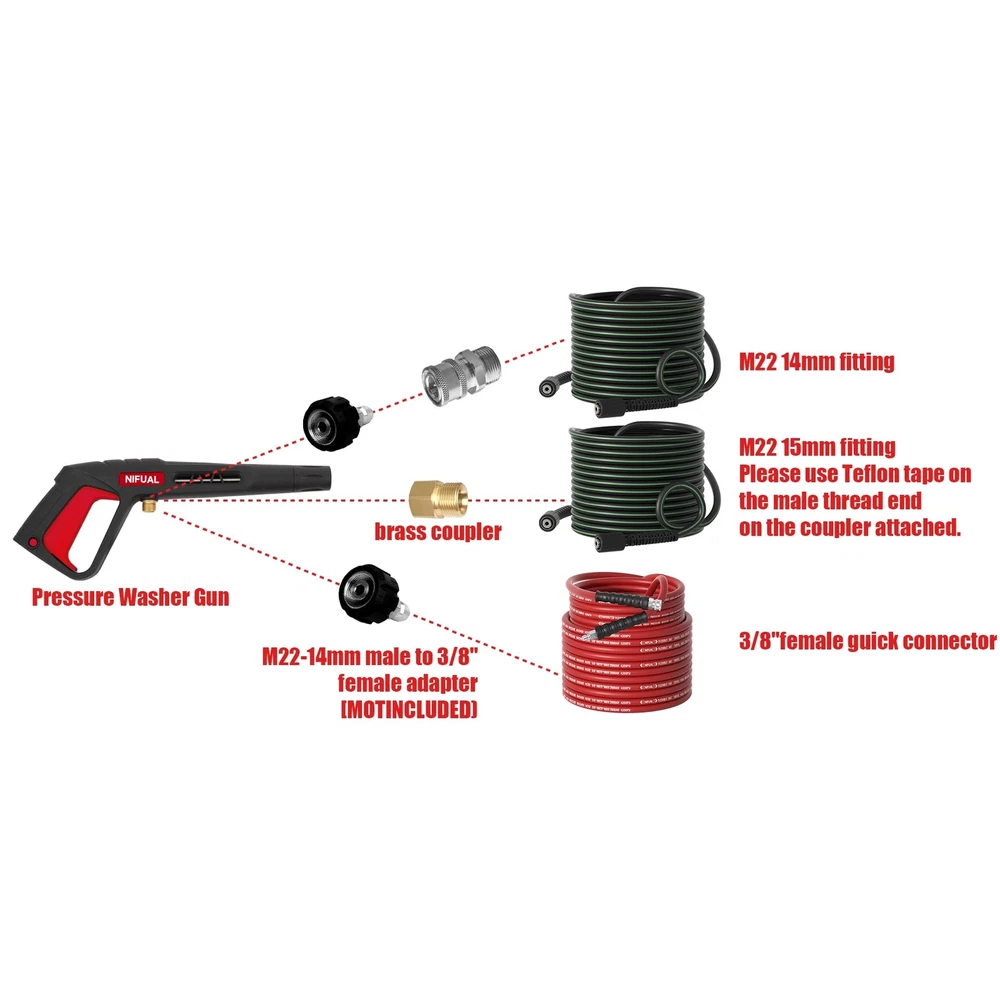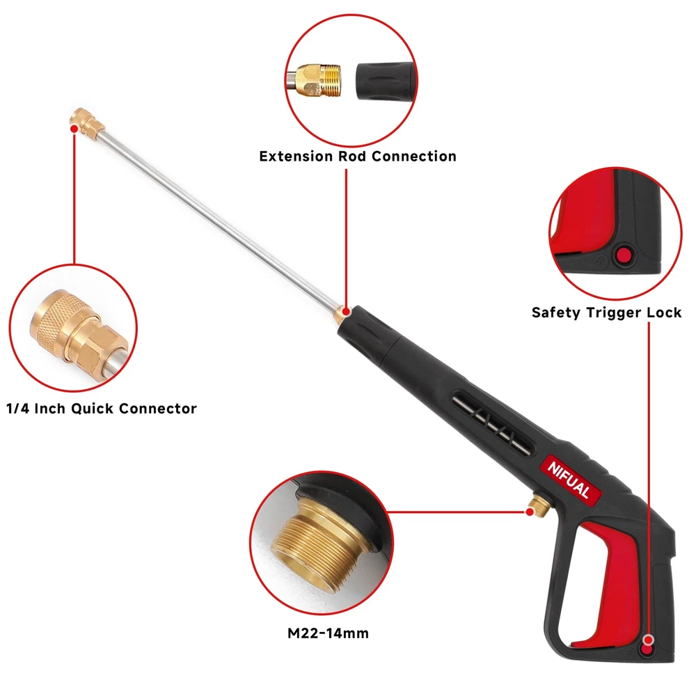 1.[Top material] This Long Pressure gun is built to last with a high-quality ABS shell and brass core. The precision connections ensure a leak-free experience and the durable construction guarantees a long lifespan. Whether you're using it for personal or professional use, our pressure washer gun is up to the challenge.Say goodbye to flimsy and unreliable power washer guns 2.Warm Tips: Not fit gardenhoses, waterhose or your faucet directly. If pressure washer hose has M22 14mm fitting with 14mm inside diameter, please connect to hose directly. If hose has M22 15mm fitting with 15mm inside diameter, please connect the brass coupler between gun and hose. otherwise it may cause Leakage. 3.360 DEGREE SWIVEL GUN: Unique 360-Degree Swivel Inlet Design, Able to Rotate Flexibly, Clean Your Goals from Top to Bottom without Hose Tangle, Make Your Pressure Washing Easy and Increasing Efficiency.Five Nozzles Contain 5 Angles: 0°、 15°、 25°、 40°、 60°. The Black One is Used with Foam Cannon to Produce Car Wash Soap. Flexible Safe Lock Key, Avoid Pulling Trigger Unexpected, Provide Safe Clean Work 4.QUICK CONNECTOR: Pressure Washer Wand Extension has 1/4 Standard Quick Connector. Connects Any Accessories with 1/4 Plug to the Gun. Such as Nozzles Tips, Pivoting Coupler, Foam Cannon, Extension Wand, Surface Cleaner, Undercarriage Cleaner, Water Broom 5.PACKAGE INCLUDE: 1pcs Pressure Washer Gun, 1pcs 14 Inch Replacement Extension Wand , 5pcs Pressure Washer Nozzles, 1Set M22-14mm to 3/8" Quick Connect set , 1pcs M22 15mm Fitting