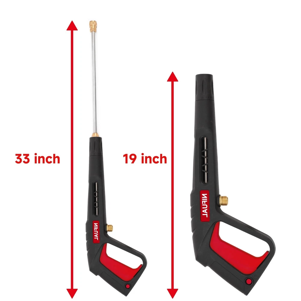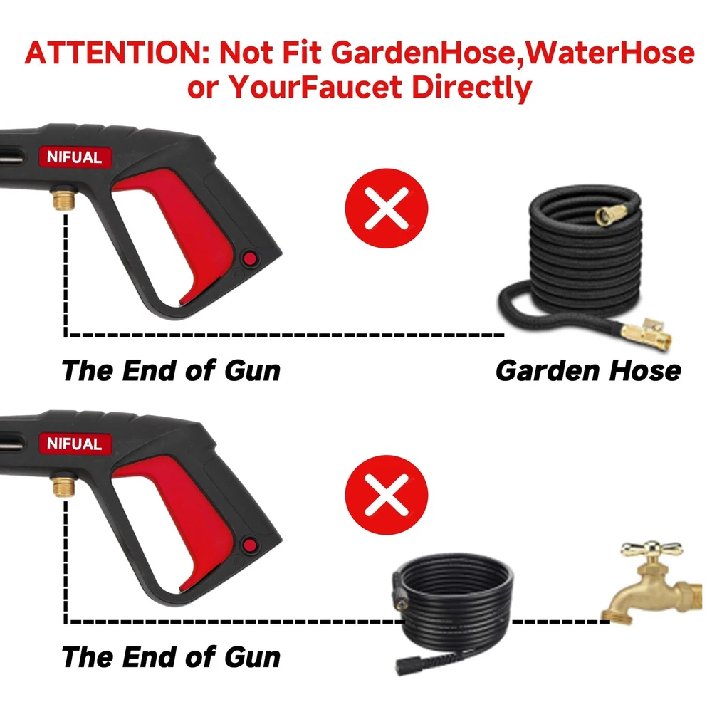NIFUAL Pressure Washer Gun with Power Replacement Extension Wand,5 Sprayer Nozzle Tips, 3/8 Quick Connect Fittings,M22-15mm Adapter, Power Washer Gun Kit for Daily and Professional, 18 Inch,3300 PSI Product Details Brand: YETIANICAL Power Source: air_powered Color: Black Maximum Pressure: 3300 Pound per Square Inch Hose Length: 20 Inches Wand Length: 14 Inches Product Dimensions: 18 x 7 x 2 inches Item Weight: 2.9 pounds Manufacturer: YETIANICAL Country of Origin: China Item model number: YETIANICAL Pressure Washer Gun 1.[Top material] This Long Pressure gun is built to last with a high-quality ABS shell and brass core. The precision connections ensure a leak-free experience and the durable construction guarantees a long lifespan. Whether you're using it for personal or professional use, our pressure washer gun is up to the challenge.Say goodbye to flimsy and unreliable power washer guns 2.Warm Tips: Not fit gardenhoses, waterhose or your faucet directly. If pressure washer hose has M22 14mm fitting with 14mm inside diameter, please connect to hose directly. If hose has M22 15mm fitting with 15mm inside diameter, please connect the brass coupler between gun and hose. otherwise it may cause Leakage. 4.QUICK CONNECTOR: Pressure Washer Wand Extension has 1/4 Standard Quick Connector. Connects Any Accessories with 1/4 Plug to the Gun. Such as Nozzles Tips, Pivoting Coupler, Foam Cannon, Extension Wand, Surface Cleaner, Undercarriage Cleaner, Water Broom 5.PACKAGE INCLUDE: 1pcs Pressure Washer Gun, 1pcs 14 Inch Replacement Extension Wand , 5pcs Pressure Washer Nozzles, 1Set M22-14mm to 3/8" Quick Connect set , 1pcs M22 15mm Fitting