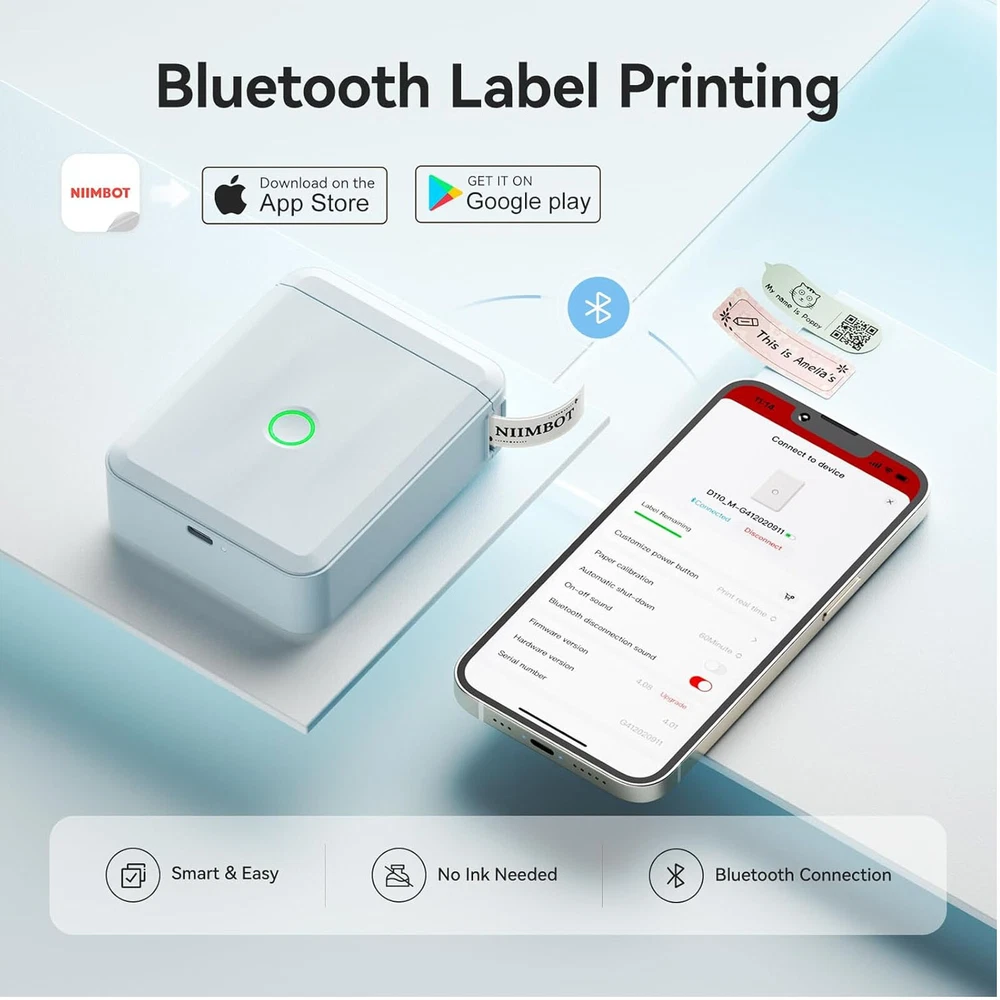 About this item 1.More Convenient RFID: All labels of our NIIMBOT use RFID tech, after replacing the new label, our printer can auto-identify the label information and size. No need to manually scan the barcode on the package to select the label type & size. 2. Portable Printer: Wireless bluetooth label maker can slip into your pocket. The compact and lightweight design makes it easy to carry store, and print labels and stickers anytime, anywhere. This label maker can keep your life and business tidy. 3. High-quality Printing: Label maker without BPA direct thermal technology equipped with 203DPI resolution print head, you can enjoy high-definition without relying on ink or toner. Built-in rechargeable battery with 1500mAh large capacity battery can print 4 hours continuously after fully charged. 4.Easy to Use: This label printer compatible with IOS & Android Phones, you can download the "NIIMBOT" APP from Google Play or App Store. The app provides multiple creative functions and templates, easy to create various design label stickers from the App to make the label you need. 5. Wide Application: The label maker printing width up to 15mm with a variety of styles of label tapes, widely used in home storage and organization, school and office file classification, and small business, such as jar stickers, food date, cosmetics, personal items, barcodes, name tags, cable identification, price tags, etc. It’s also the perfect back-to-school supplies and home helper. Product Specifications Support System: Android 8.0 / iOS 9.0 above Print Speed: max 40mm/s Print Width: 8-15mm Pixel: 203dpi Battery Capacity: 1500mAh Interface: Type-C charge Size: 95×75×30 mm Weight: 149g Kindly Note: 1. Our NIIMBOT label maker only compatible with NIIMBOT Label tape, DO NOT SUPPORT OTHER BRAND LABEL. Please purchase official and genuine label for a better printing experience! 2. All purchasers of our NIIMBOT label maker will receive a free roll of label and 6 months of "NIIMBOT APP" VIP for free!