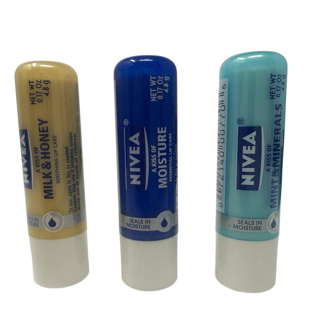 This rare set includes three original NIVEA lip balms from the “Kissable Moments” collection, each manufactured in Germany and no longer in production. These formulas are highly sought after by collectors and fans of the original Beiersdorf blend. Each stick is factory-sealed and retains the original ingredients known for their intense moisturizing properties. You will receive: 1x A Kiss of Milk & Honey (Soothing Lip Care) 1x A Kiss of Moisture (Essential Lip Care) 1x A Kiss of Mint & Minerals (Refreshing Lip Care) Features: Discontinued German-made NIVEA formula Sealed and Brand New (Outside box shows wear but each stick is factory sealed) Soothing and essential moisture blends Collector's set, no longer sold in stores Made by Beiersdorf AG, Germany Shipping & Returns: Free US Shipping 30 day returns (must be returned in original condition) Price: $24.99