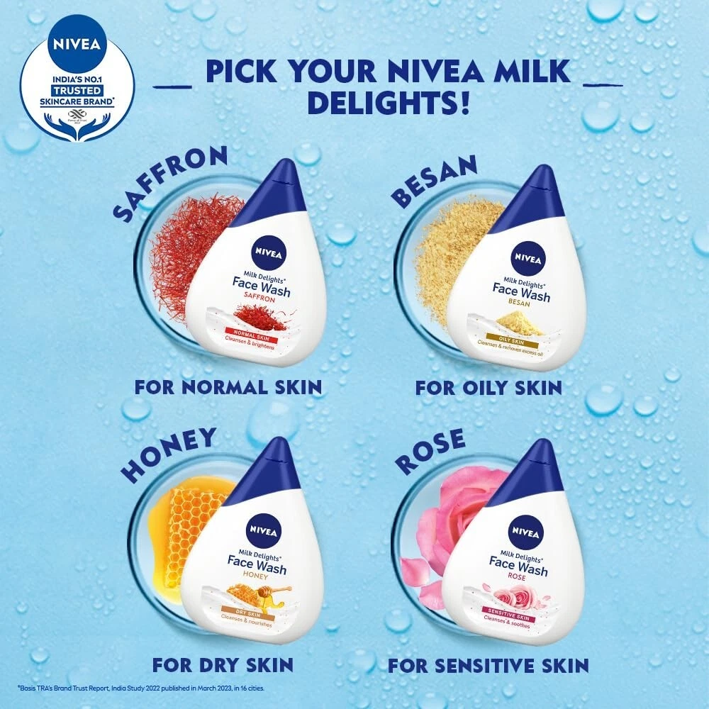 About this item Purifies, cleanses and soothes for a soft skin feeling This unique formula is specially designed for acne-prone skin and helps reduce pimples Milk acts as a natural cleanser that removes dirt & impurities and nourishes your skin for a healthy glow Milk Delights' ph is best suited for skin Turmeric is anti - bacterial & anti-inflammatory, it helps reduce 99.9% acne causing bacteria Ingredients: turmeric Product description NIVEA Milk Delight face wash cleanses the skin & helps to remove impurities, refines pores, reduces shine & provides 8 hours sebum control. Milk Delight Face wash does not dry out the skin & moisturizes. NIVEA understands skin like no one else. That’s why we have created products that cleanse, nourish and protect your skin, while giving it exactly what it needs – gentle yet effective care that keeps your skin smooth, supple and radiantly beautiful. Wet your face, gently massage avoiding the eye and lip area, and rinse off. Enjoy it up to 2 times a week for refined, soft and radiant skin with NIVEA Milk Delight Face Wash.No matter what you do, or where you live, we’re here to help you enjoy better skincare for life. From the manufacturer