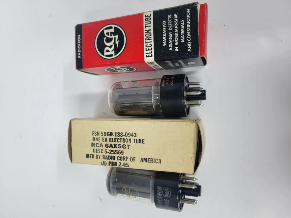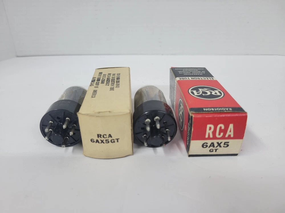 Vintage pair of new old stock. RCA 6AX5GT vacuum tubes. Acquired as new from an estate sale of a closed down repair shop. Both test good. Item will ship within one business day of completed sale. I DO NOT ship media mail. All items will be securely packaged and will ship USPS Ground Advantage, Priority mail, UPS or Fedex depending on weight and size. I do offer a 30-day money back guarantee on almost every item I sell. If there are issues with your item, please return it for a refund. Refund will be issued upon return of item. Some restrictions may apply. It is always appreciated if you contact me before starting a return so that I can try and assist without the hassle of a return.