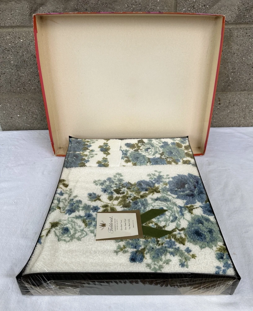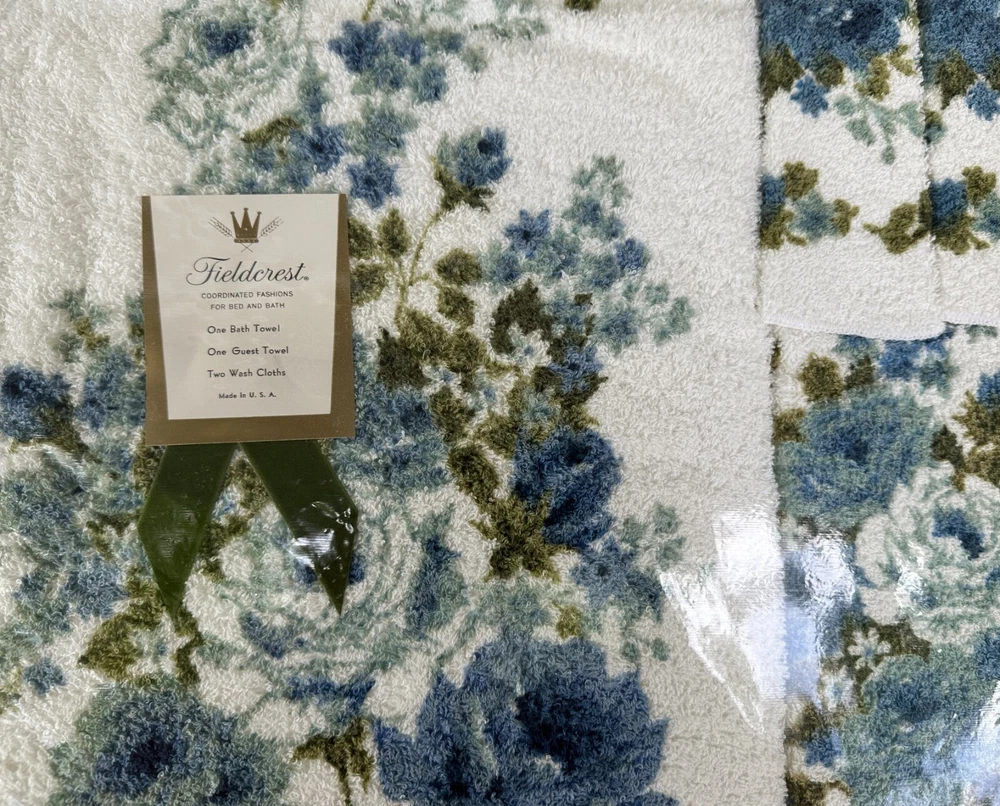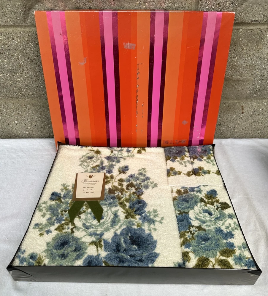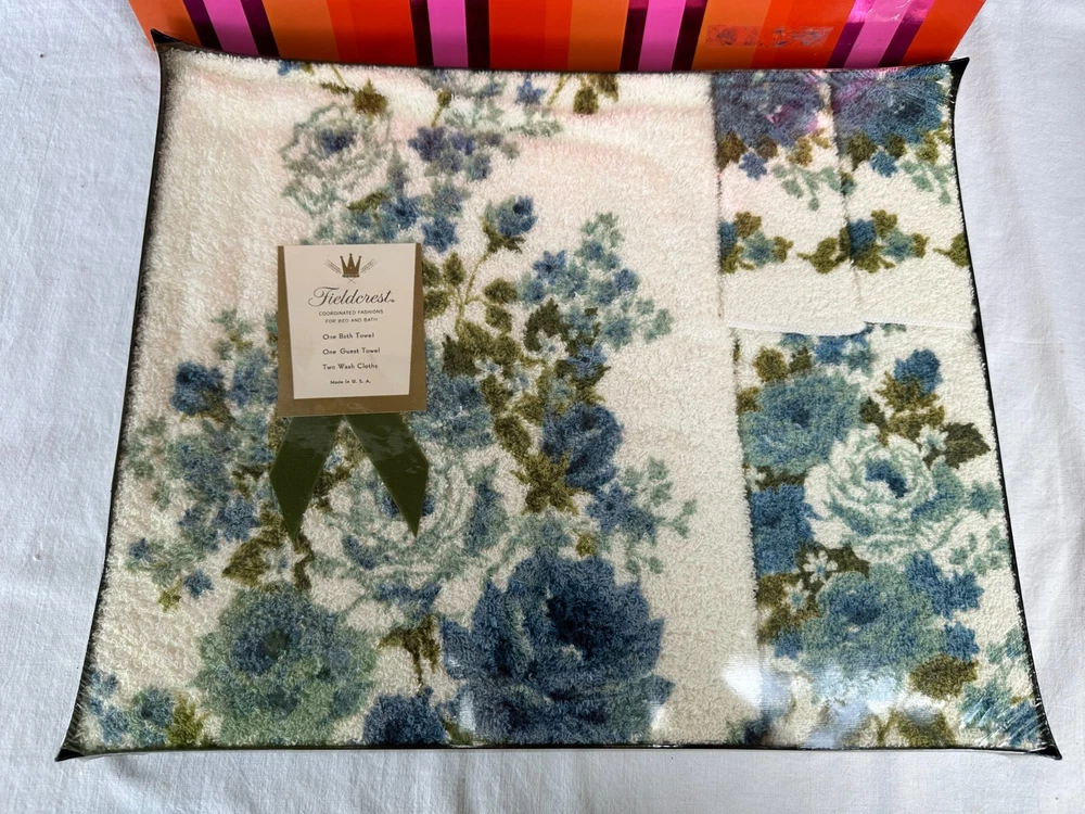 ITEM: NOS sealed Vintage Fieldcrest 4 piece Bath Towel set in original gift box. Towels are all Terry Cloth with a Mid Century blue roses pattern. Set includes a Bath Towel, Guest Towel and (2) Wash Cloths. Original descriptive Filedcrest product tag label sealed/visible inside the shrink wrap. Made in the U.S.A. Appear to be from the late 1960s or early 1970s. SIZE: Box is approximately 17.5" x 14.5". Weighs 2 lbs 12 oz before packaging CONDITION: NOS, unused, sealed in original gift box. Towels are free of damage. Box has minor wear from storage. Original shrink wrap plastic has wear on one corner and is still securely sealing the towels. No odors or stains. Comes from a very clean, smoke-free living estate, one owner. Any light spots are reflections from lighting. PLEASE VIEW ALL PHOTOS AS WE CONSIDER THEM TO BE PART OF THE CONDITION DESCRIPTION. We will gladly combine items to save on shipping! Thanks for looking and Good Luck Bidding!!!! If you have questions, please ask before bidding/purchasing. Please Note: Many of our items are pre-owned. Please be sure to check out our Condition Description. PLEASE NOTE: In order to be fair to all bidders, we do not end auctions early or change them from auction format to a Buy It Now format. RETURN POLICY: We describe our listings as carefully as possible and will accept returns only for flaws not mentioned in the description. The items we sell are largely antique or vintage and, as such, have been used during their lifetime. If there is something we have missed or a detail we have not addressed in the listing, please contact us through e-Bay and we will do our best to address any concerns that you might have. When refunds are appropriate we will happily refund your purchase amount. INSURANCE: We insure all items that we ship. If a claim is necessary, buyers are expected to assist in the claim process. INTERNATIONAL BIDDERS: We use eBay's International Shipping service for all international sales
