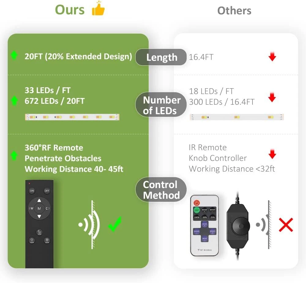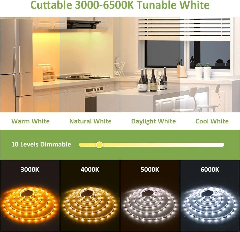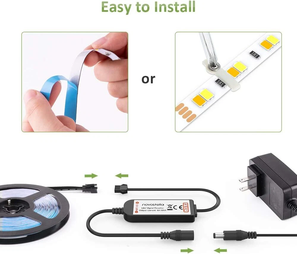 NOVOSTELLA 20ft Tunable (Non-waterproof), Warm White+Daylight White Product Details Color: Warm White+Daylight White Brand: NOVOSTELLA Indoor/Outdoor Usage: Indoor Special Feature: Instant On, 3000k-6000k, Cuttable, RF Remote, dimmable Light Source Type: LED Power Source: Corded Electric Light Color: White Theme: Easter, Christmas, Thanksgiving Occasion: Engagement, Christmas, New Year, Wedding, Birthday Style: Modern Material: Plastic Color Temperature: 6000 Kelvin Controller Type: Remote Control Connectivity Technology: Radio Frequency Number of Light Sources: 720 Voltage: 24 Volts Wattage: 24 watts Included Components: Power Adapter, RF Remote, 20 ft Tunable White Led Tape Light, Controller, Fastener Item Weight: 8.78 ounces Number of Items: 1 White Brightness: 1200 Lumens Control Method: Remote Water Resistance Level: Waterproof Wireless Communication Technology: Radio Frequency UPC: 793610627018 Form Factor: Strip Manufacturer: Novostella Part Number: oYangic Item Weight: 8.8 ounces Package Dimensions: 5.51 x 5.31 x 2.4 inches Item model number: Flexible Led Shape: Strip Specific Uses: Living room Lights, Led vanity mirror lights, under cabinet lights, path lighting, Christmas lights decoration, room lights Special Features: Instant On, 3000k-6000k, Cuttable, RF Remote, dimmable Shade Material: Plastic Light Direction: Up/Down Light Switch Installation Type: Led tape light with sticker Batteries Included?: No Batteries Required?: Yes Package Dimensions : 5.51 x 5.31 x 2.4 inches; 8.78 ounces Item model number : Flexible Led Manufacturer : Novostella Color: Warm White+Daylight White Brand: NOVOSTELLA Indoor/Outdoor Usage: Indoor Special Feature: Instant On, 3000k-6000k, Cuttable, RF Remote, dimmable Light Source Type: LED Power Source: Corded Electric Light Color: White Theme: Easter, Christmas, Thanksgiving Occasion: Engagement, Christmas, New Year, Wedding, Birthday Style: Modern Dimmable LED Strip: 6m/20ft LED light strip with 672 LEDs provides Daylight White 6500K, Neutral White 4500K, Warm White 3000K, 10 brightness levels for versatile lighting. RF Remote Control: Upgraded RF remote controller allows 360° control with a range of up to 40-45ft for precise lighting. Easy Installation: Self-adhesive back and included screws make it easy to install in seconds for safe and secure lighting. Wide Indoor Use: The flexible LED strip is suitable for indoor lighting and decor like living room, kitchen, bedroom, stairs, and more. Standard Kit: Comes with 20ft LED strip, UL listed power adapter, RF remote, controller cable, and mounting brackets for versatile lighting solutions.