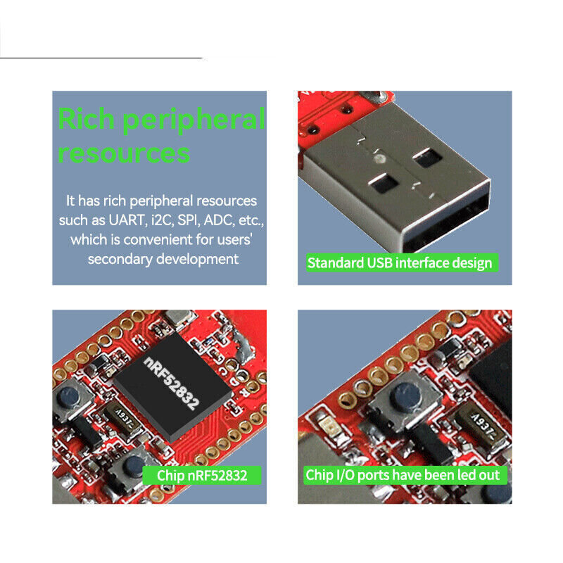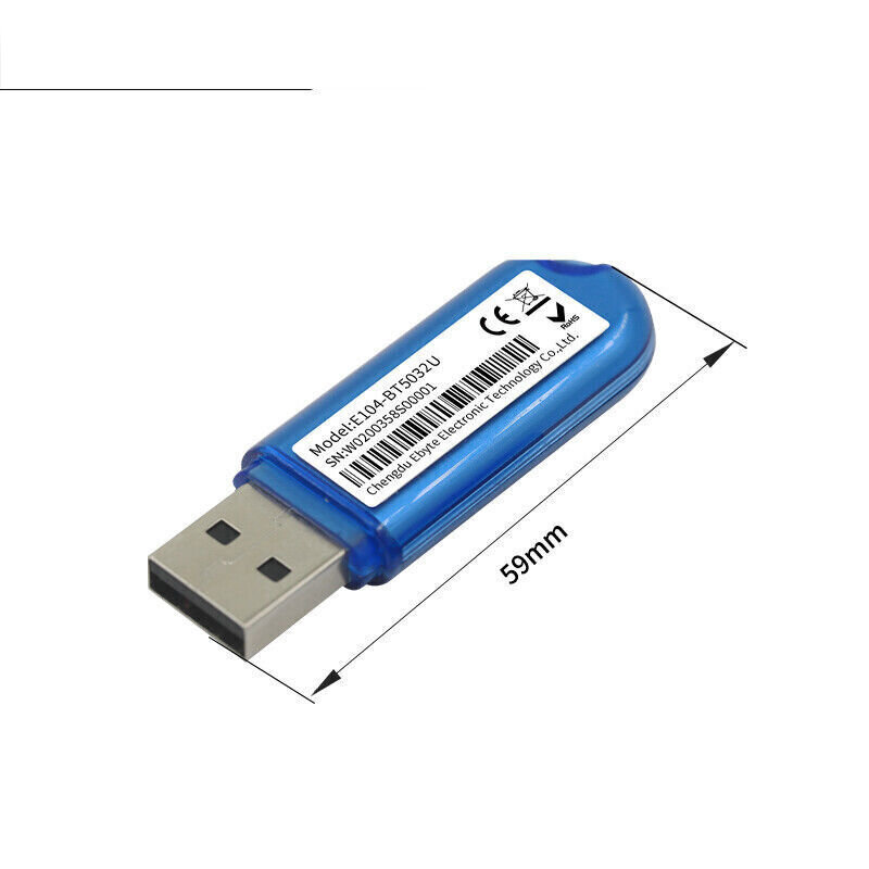 E104-BT5032U nRF52832 supports Bluetooth soc packet capture protocol scheme Chip solution: nRF52832 Operating frequency: 2400~2480MHz Supported protocols: BLE 4.2 / BLE 5.0 Communication distance: 80m Product size: 59*18mm Product introduction: E104-BT5032U is a small-sized USB interface Bluetooth wireless packet capture tool produced by Ebyte; it comes with a high-performance PCB on-board antenna, and adopts a Bluetooth low energy (BLE) SOC solution. The E104-BT5032U adopts the original imported nRF52832 radio frequency chip from Nordic, which supports Bluetooth 4.2 and Bluetooth 5.0.