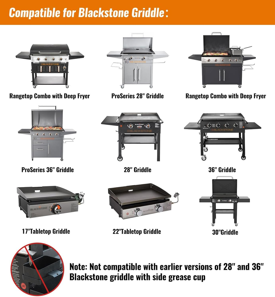 Store New Arrivals Add to Favorite View Feedback NUPICK 60-Pack Blackstone Griddle Accessories, 5017 Grease Cup Liner for Blackstone 17"/22"/30"/28"/36" Griddle, Drip Pan Grease Catcher Cup Liner, Disposable Aluminum Foil Drip Pan Liner Description Color Sliver Brand NUPICK Material Aluminum Is Dishwasher Safe Yes Item Weight 1.5 Pounds Size 60 Pack Material Type Free Aluminum Free Product Dimensions 8"L x 3"W x 3.7"H Manufacturer NUPICK 60 PACK disposable drip liners compatible with these Blackstone REAR Grease Griddle Units: 36 Inch, 28 Inch, 17 Inch, Range Top Combo, and ProSeries. Each measures 8-Inch x 3.7-Inch x 3-Inch holds up to 27 fl oz; Fits the 7 x 3 rear grease pan. Once the aluminum foil liner is full, simply discard it and replace it with a fresh one to make clean up a breeze. Please note, this grease tray liner is not compatible with earlier versions of the 28-Inch and 36-Inch griddle with 5-1/2-inch by 3-1/2-inch side grease cup NUPICK aluminum foil series provide quality cooking experiences without the need to clean up. Our aluminum pans are disposable and 100% recyclable. Product Description ENJOY HIGHER QUALITY Product Dimension: 8" x 3" x 3.7" Holds Up To 27 fl. oz. Durable Aluminum Foil Construction Sturdy Design With A Full Curl Rim Embossed Bottom MADE BY NUPICK Sturdy, quality package crafted and very functional product that makes your Blackstone experience even better. NO BAD PRODUCT Some bad product may not strong enough and flimsy. NUPICK product will stay strong throughout the entirety of your event while providing a polished look. ABOUT US We offer the best prices around on high quality products. Our E-store includes media such as books, movies, music and games while offering electronics, toys, sporting apparel, clothing, tools, general home, garden items and more. SHIPPING We are always working hard to ensure your package arrives as soon as possible. Please understand that some factors like weather, high postal traffic, and the performance of shipping companies are outside of our control. We offer free shipping to the lower 48 states and ship within 2 business days of payment, usually sooner. We do not accept P.O. Boxes. Please provide a physical address. RETURNS We offer a 30-Day Return Policy on items which you are not completely satisfied with. You have the option for a full-refund or an exchange of the item. No returns are available on items shipped outside of the USA. PAYMENT We accept PayPal. CONTACT US This page content is yet to come Please ad us to your favorite seller and visit again later Thank You