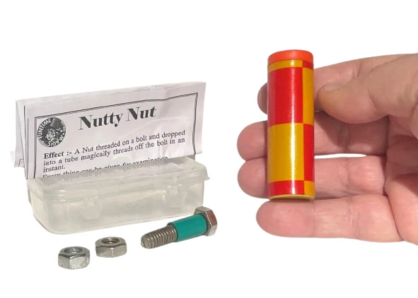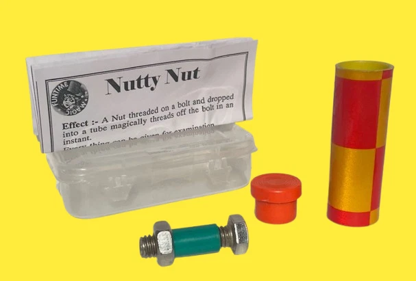 New Nutty Nut! A metal nut is threaded on a metal bolt with a collar and dropped into a 2.5" tube. A shake of the tube, and the contents of the tube are tipped to show the nut has magically threaded right off the bolt. Everything can be immediately handed out for thorough examination. This model is very well made, and comes to you at an amazingly low price, making it an excellent value. Complete with illustrated instructions. A great trick to demonstrate to some real nuts! A perfect pocket trick! A real fooler and easy to perform! Includes nut, bolt and plastic tube/cap. WOW FREE SHIPPING! NOW ON SALE! BEST PRICE ON EBAY or anywhere else! Robb. - G - 1
