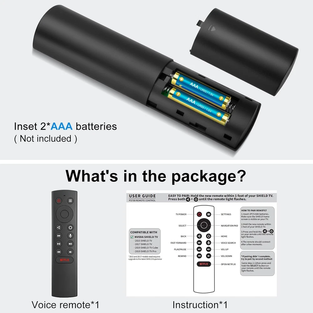 【TV SPECIFICATION】Remote Works with SHIELD TV 2015/2017/2019 all models Streaming Media Player(Base on requires upgrade to the latest SHIELD Experience),compatible models including for 2015 NVIDIA SHIELD TV,for 2017 NVIDIA SHIELD TV,for 2019 NVIDIA SHIELD TV Cube,and for 2019 NVIDIA SHIELD TV Pro. 【VOICE FEATURES】Press and release the Voice Search button and then say your command. Voice search feature making navigation a breeze.Simply speaking into the remote to find your favorite TV shows, launch apps, and control your TV's volume.voice remote adds a level of convenience that becomes indispensable. 【EASY TO PAIR】Hold the new remote within 2 foot of your SHIELD TV.Press and hold the Select button on your remote until the remote light flashes. The remote should connect after a few moments. 【BATTERY TYPE】This remote control requires two AAA batteries,but batteries not included batteries,please prepare by you,You will get Voice Remote and User Manual 【REMOTE ADVANTAGE】Great sense of touch, good form factor, this remote is super in hand, good pressure point for keys. The voice control is very accurate, and it usually understands what you're saying even in noisy environments.And it is possible to use 2 or more remotes on the TV at the same time, including the original remote control. Product Description