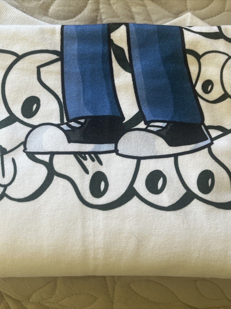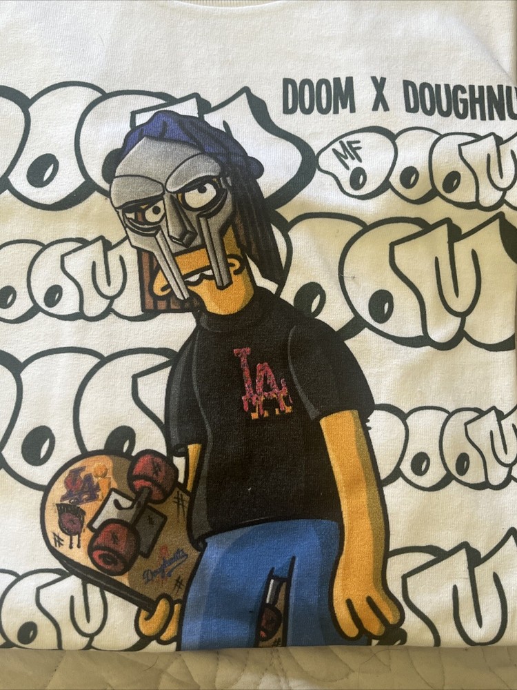 Elevate your streetwear game with this Jim Jones X MfDoom graphic tee. The white cotton material is comfortable and durable, perfect for everyday wear. The short sleeves and regular size make it a versatile addition to any wardrobe. The original and authentic design is a must-have for fans of vintage clothing. This shirt is made in the United States, adding to its quality and appeal. Brand new with out tags. Sold as is. Great fitted style. Local streetwear brand. Cross posted. Los Angeles doughnuts is the brand look it up on instagram.