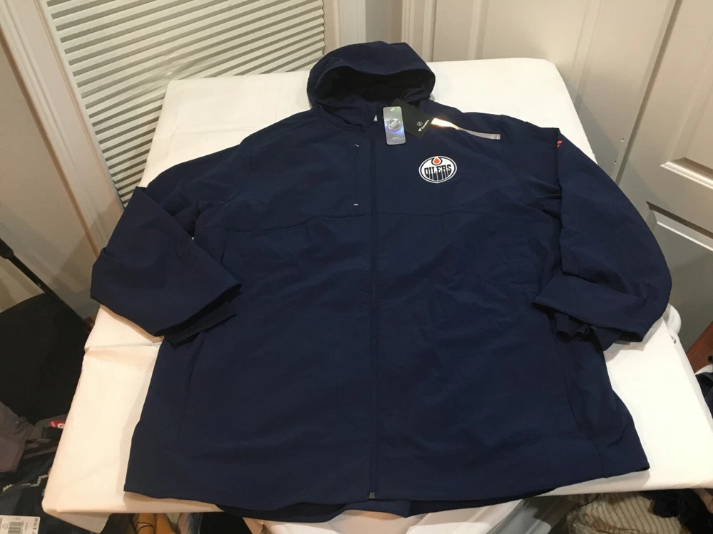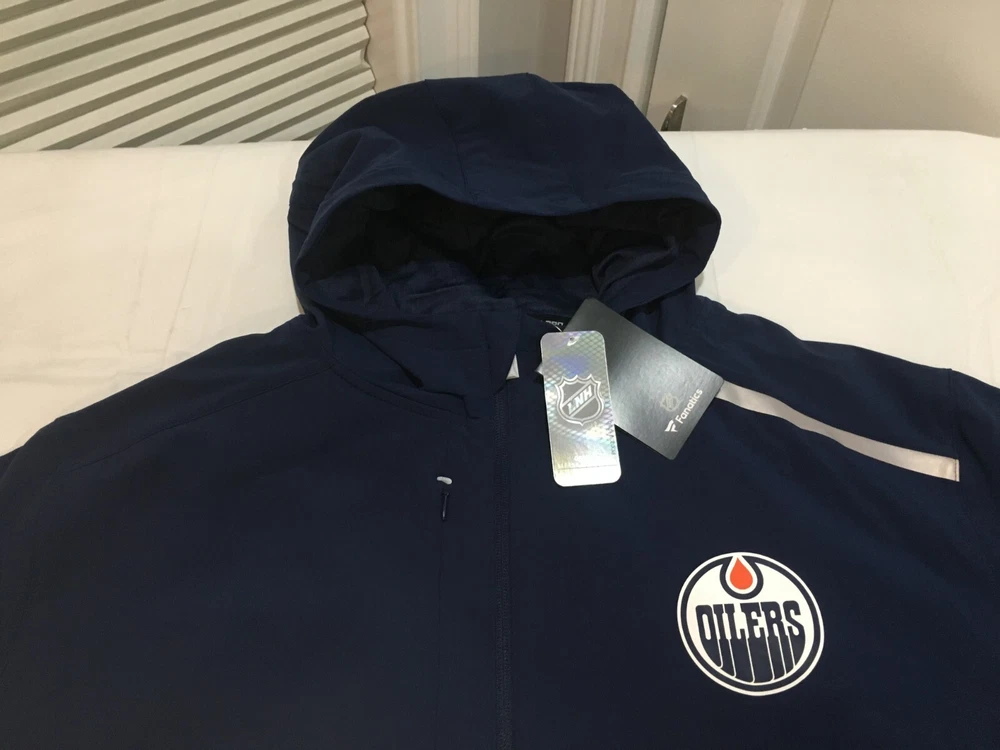 Welcome to my listing for a Brand New With Tags Fanatics Mens NHL Authentic Pro Edmonton Oilers Clutch Full Zip Jacket. This awesome jacket features: Product ID: 3693267 Brand: Fanatics Imported Heat-sealed graphics Lightweight jacket suitable for mild temperatures Lined Liquid chrome NHL shield Reflective stripe and back design Rounded droptail hem Scuba hood without drawstring Two front pockets with hidden zipper Zipper garage Machine wash, tumble dry low Full Zip Hooded 93% polyester / 7% elastane Officially licensed This jersey is navy blue in color with the Oilers logo on the chest. This listing is for a Size EXTRA LARGE XL (Picture may be of different size). This jacket retails for $175.00. Winning bidder to add $10.00 for shipping ($40 for international). Please check my other auctions and excellent feedback. Thanks and good luck bidding!