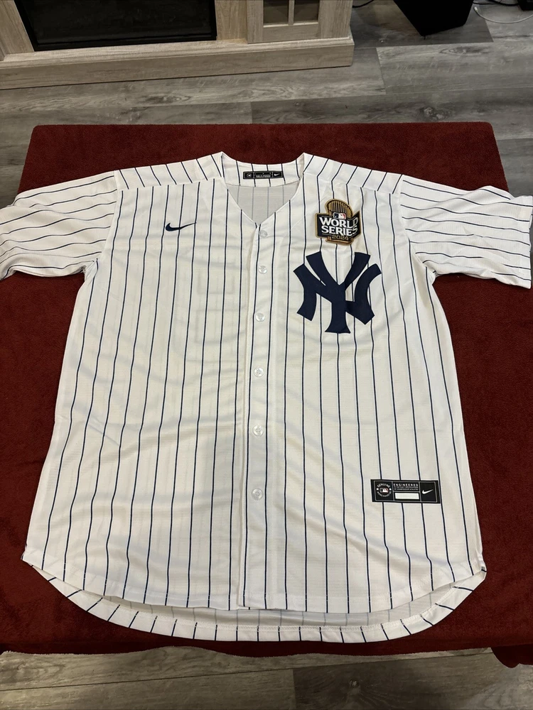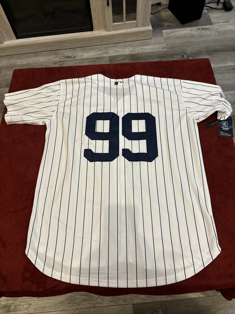 Show your support for the New York Yankees and Aaron Judge with this Nike pinstripe jersey. The white jersey features the number 99 and is perfect for any fan of the Major League baseball team. The jersey is officially licensed and made for men, with a size of large. This jersey is perfect for the World Series or any other exciting event in the team's history. The Nike brand ensures that it is made with high-quality materials and will last for a long time. Get ready to cheer on the Yankees with this stylish and comfortable jersey.