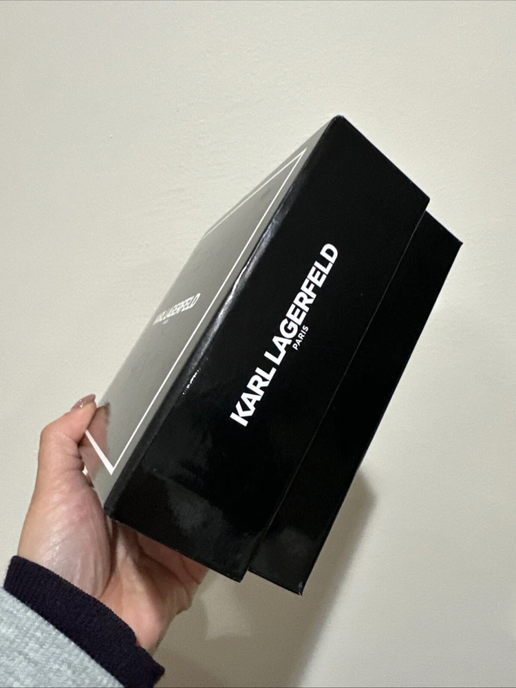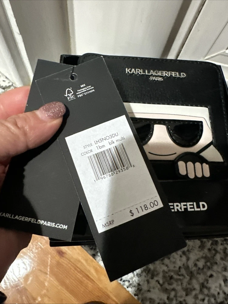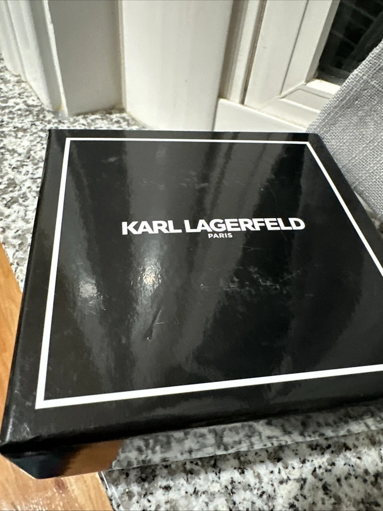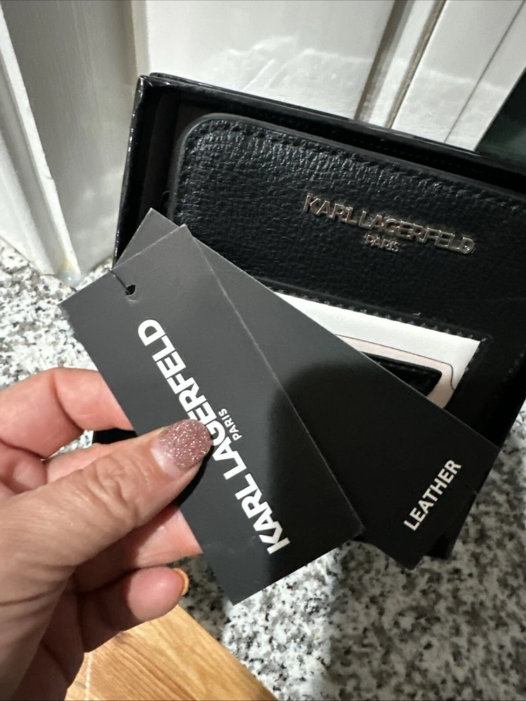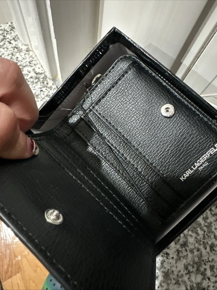 This is a Karl Lagerfeld small wallet in 100% real black leather. The wallet features a zipper closure and a designer logo accent. It is designed for everyone and includes credit card slots for organizing essentials. The wallet measures 4 inches in both length and width, making it compact and convenient for carrying in a purse or bag. It comes brand new in the original box with a retail value of $118, making it a highly sought-after item for fans of designer accessories. great price! brand new in a gift box! see our store for more
