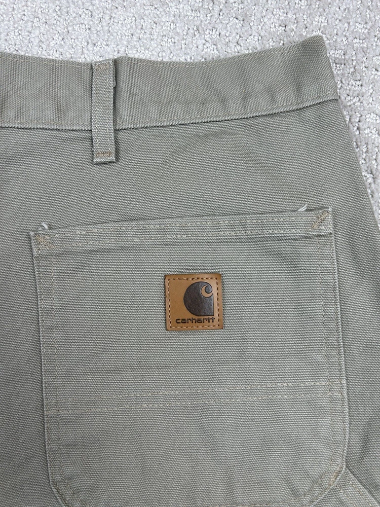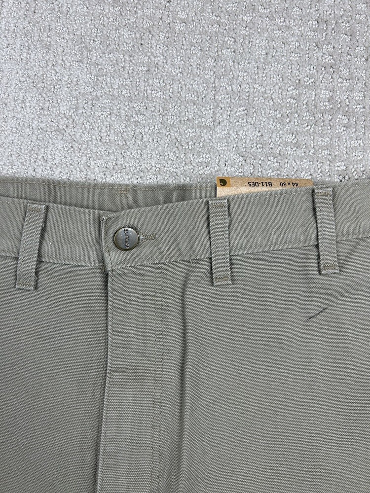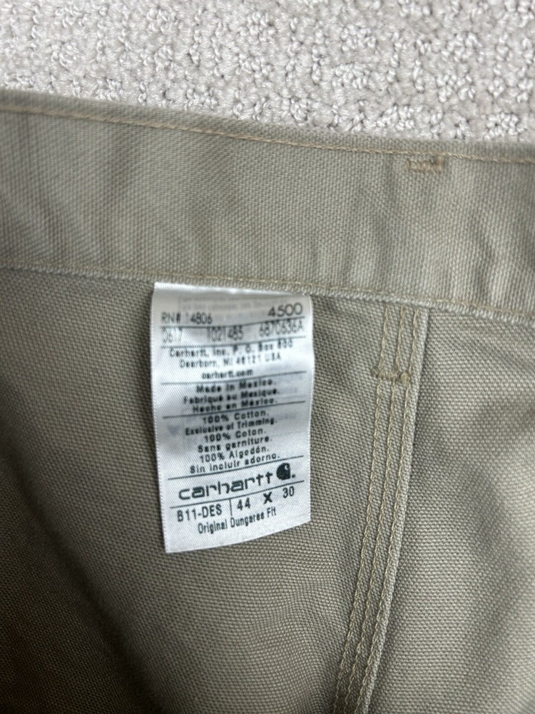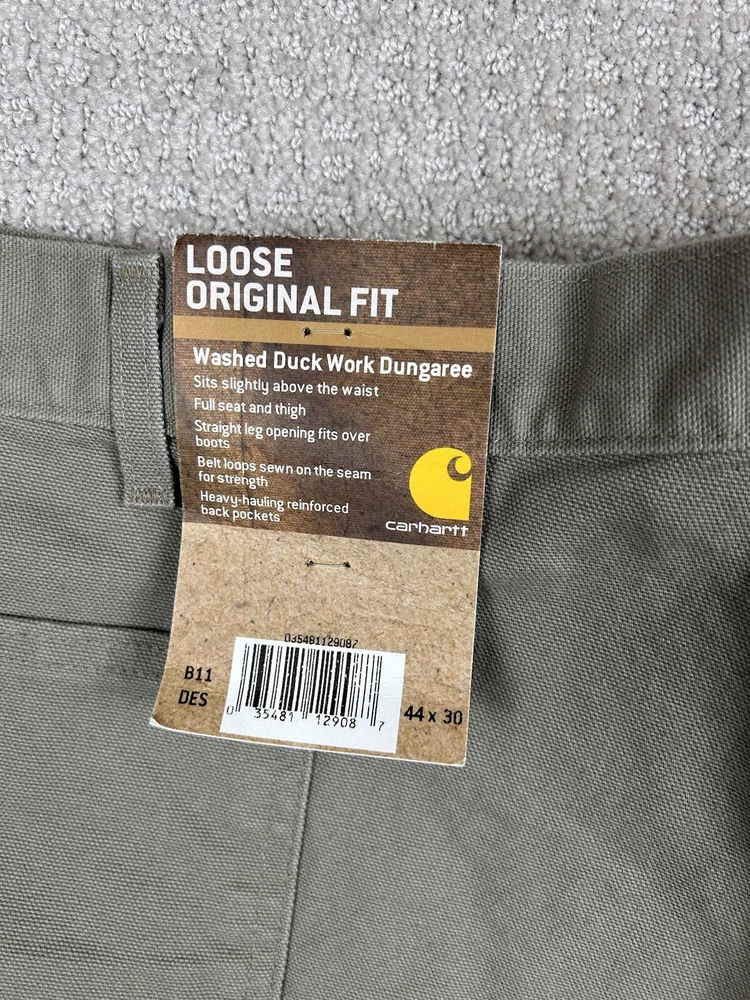 Small black mark on the front from what looks to be a pen. See the photos. Otherwise new with tags condition. Embrace the durability and comfort of Carhartt with these Men's Washed Duck Work Dungaree Pants in a versatile beige. Designed for the demanding workplace and beyond, these pants feature a robust cotton canvas construction, ensuring they stand up to the rigors of daily wear while maintaining a relaxed fit for all-day ease. Size 44 with a 30-inch inseam, these carpenter-style pants offer ample space for movement and are tailored to fit seamlessly into the regular size profile. Adorned with the classic Carhartt logo and a grunge-inspired theme, they marry functional appeal with a touch of casual style. Whether it's for work or casual wear, these pants are a testament to the fusion of utility and trend.
