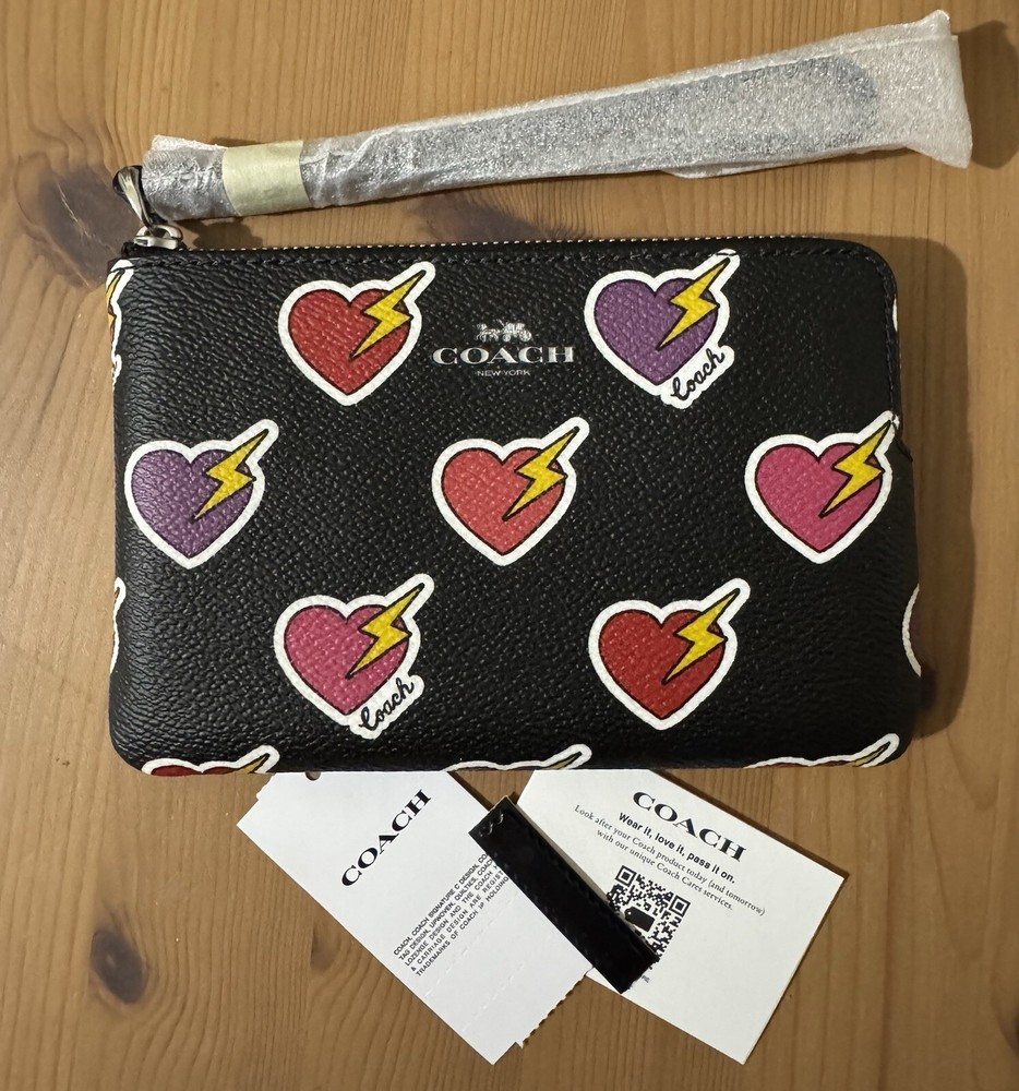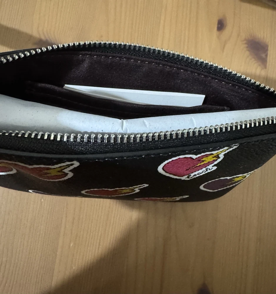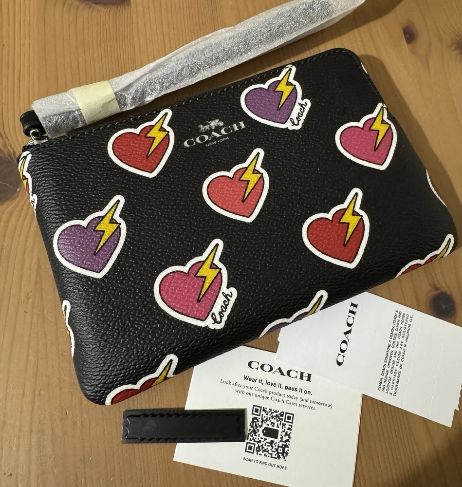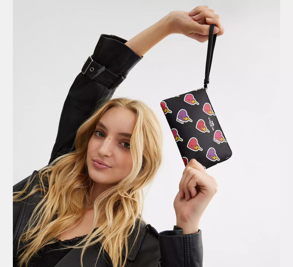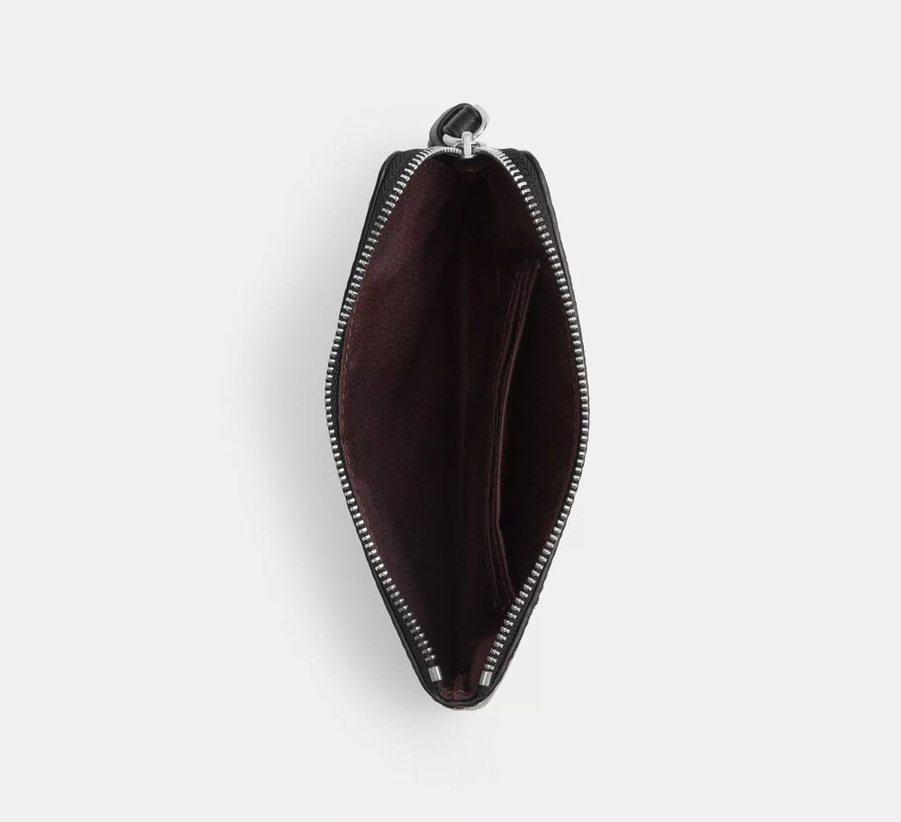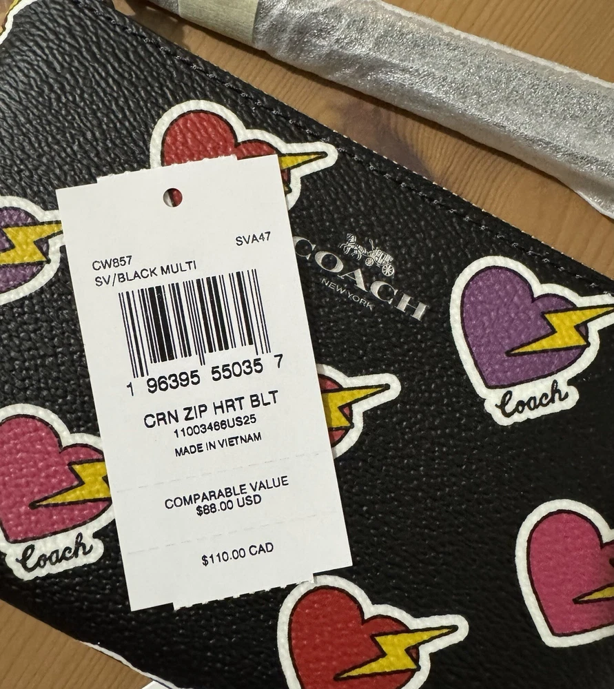 Style Number: CW857 Measurements: Length: 6.25"Height: 4.0"Width: 0.25" Materials: Printed coated canvasFabric liningStrapWrist strap attached Features: Two credit card slotsZip-top closure