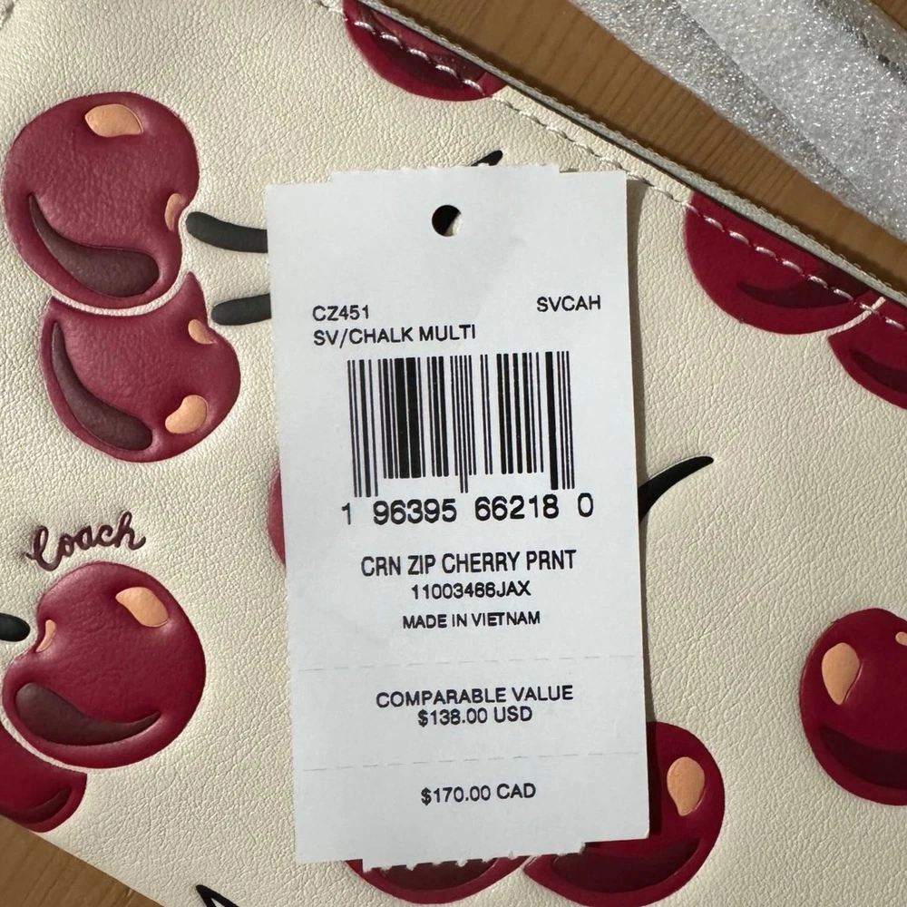 This cute Coach wristlet is the perfect combo of style and function! The cherry print is adorable, and the smooth leather feels so luxe. Fits essentials with two card slots and a zip-top to keep everything secureβlove the attached wrist strap for easy carrying. Compact yet surprisingly roomy, it's a must-have for quick errands or nights out!