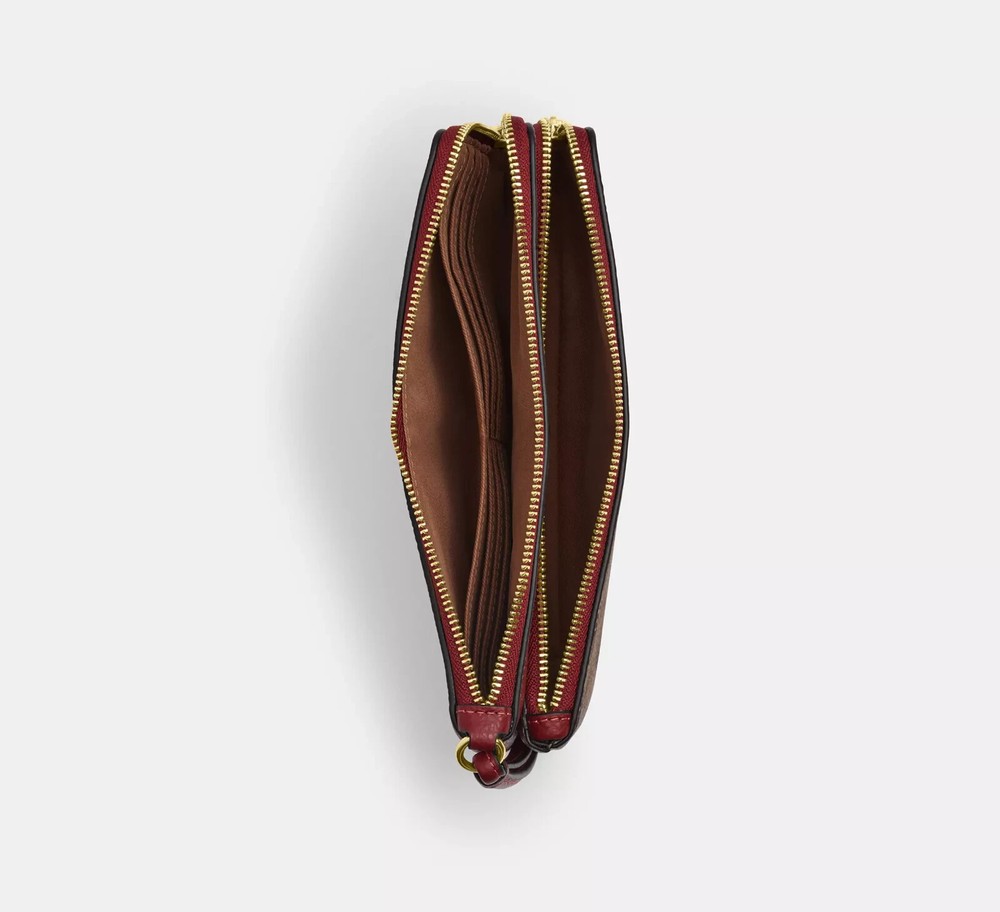 tyle Number CZ763 Measurements Length: 7.25" Height: 4.5" Materials Smooth leather Features Eight credit card slots Double zip closure Wrist strap attached Fits all phone sizes up to an iPhone X and Samsung S7 Edge Packaging may vary