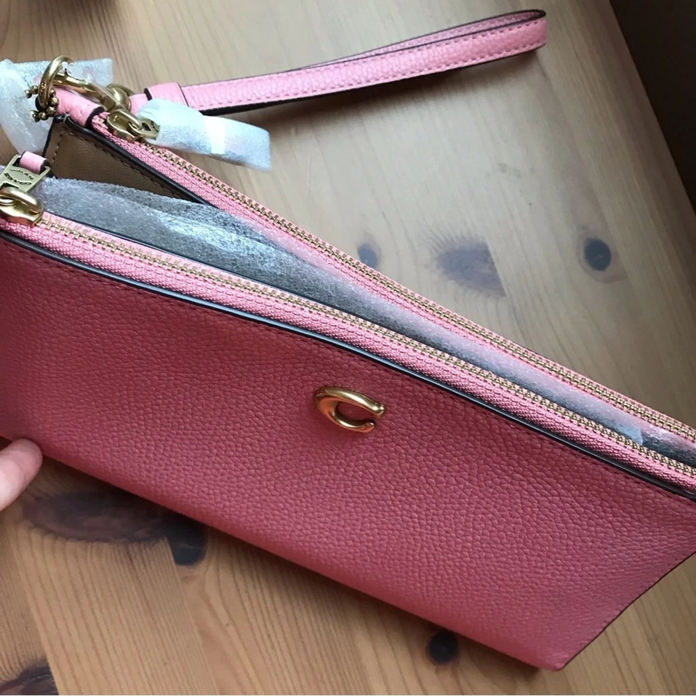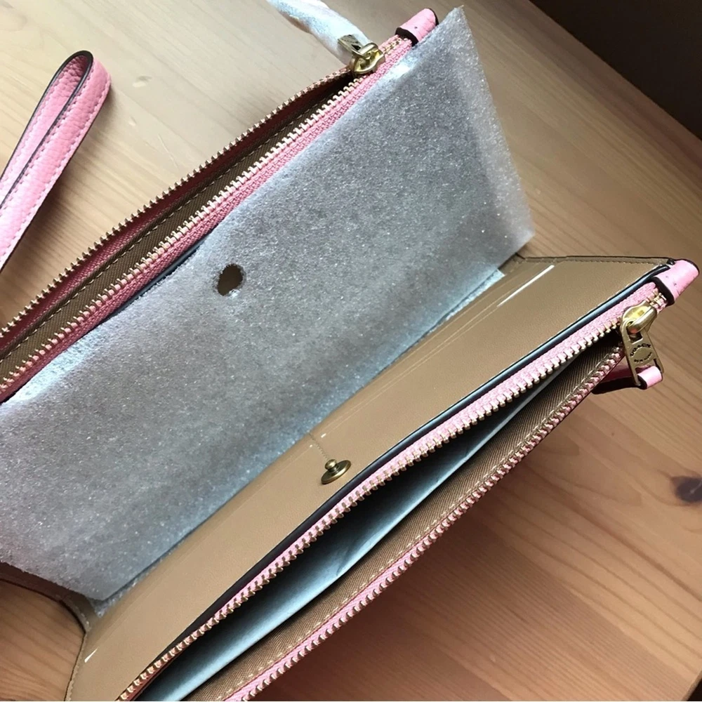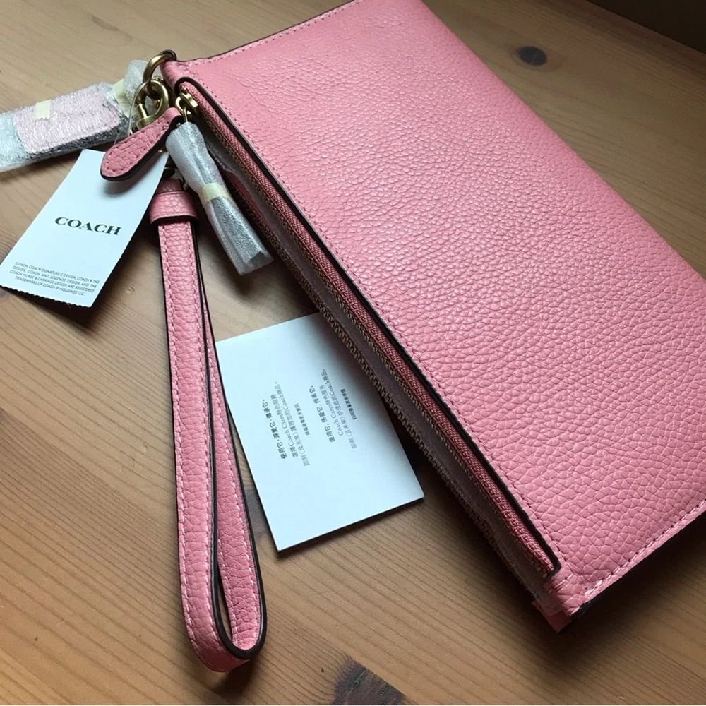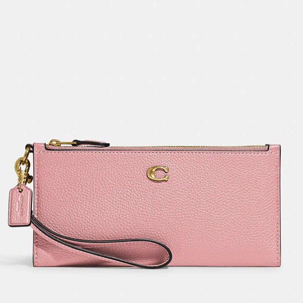 Brass/Bubblegum Polished pebble leather Twelve credit card slots Inside multifunction pockets Snap closure Two zip pockets Detachable wrist strap 8 1/4" (L) x 4" (H) x 1/2" (W) Style No. CC553