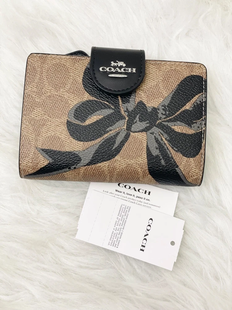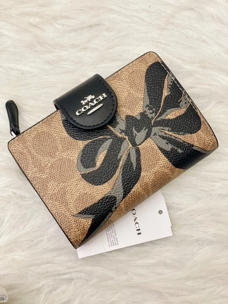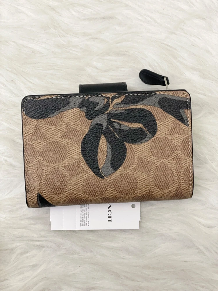 NWT COACH SIGNATURE BOW CORNER ZIP MEDIUM WALLET Fast shipping Brand new with tags 100% Authentic Style Number CZ340 Measurements Length: 5.0" Height: 3.5" Width: 0.5" Materials Signature coated canvas Features Zip coin pocket Seven credit card slots Snap closure Bill compartment Additional Details ID window Price is firm *NOTE: Bow print is randomly arranged, so each wallets may look slightly different m