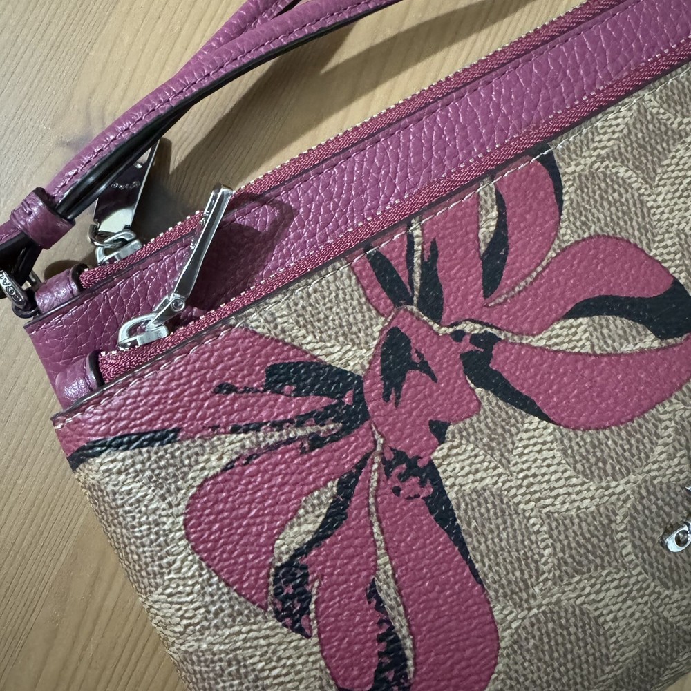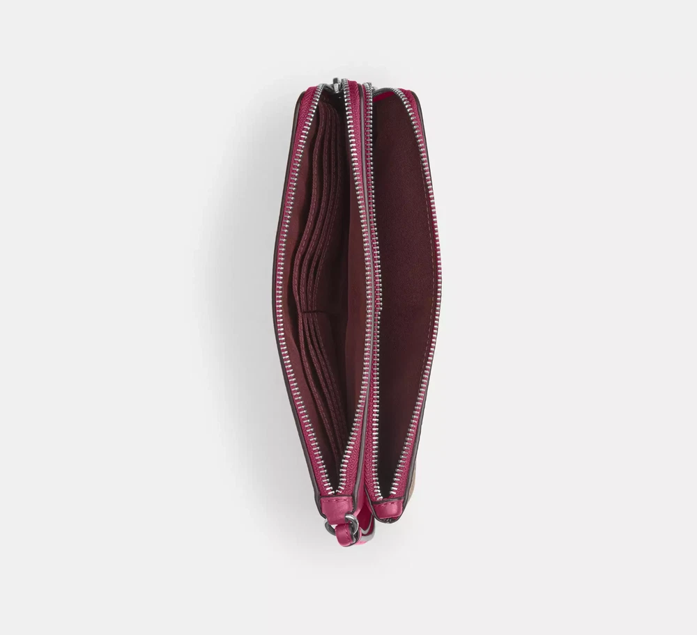 Silver/Tan/Pink Multi Product Details Style Number CAA84 Measurements Length: 8.0" Height: 4.75" Width: 1.0" Materials Signature coated canvas and refined pebble leather Fabric lining Strap Wrist strap attached Features Eight credit card slots Double zip closure Fits all phone sizes up to an iPhone X and Samsung S7 Edge The placement of the bow prints may vary