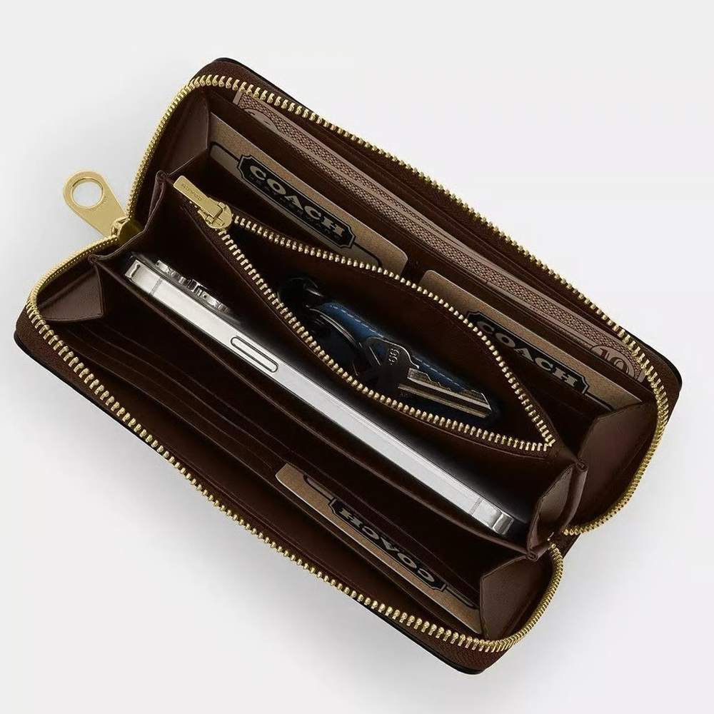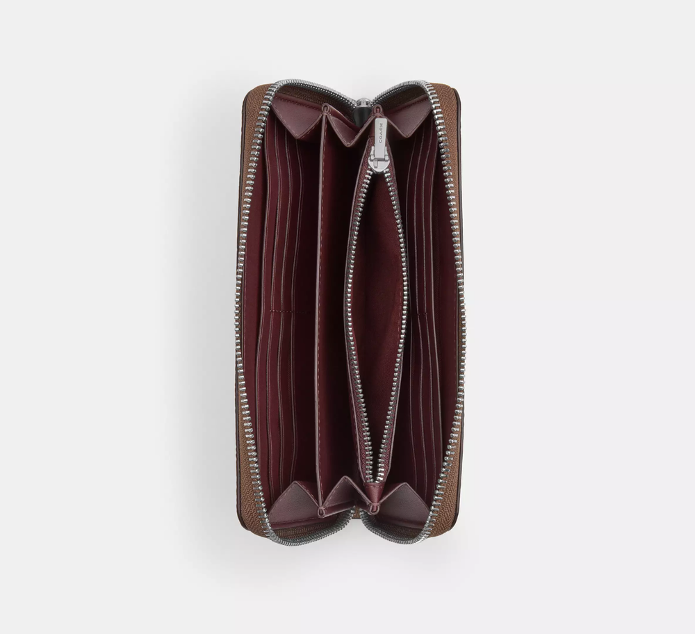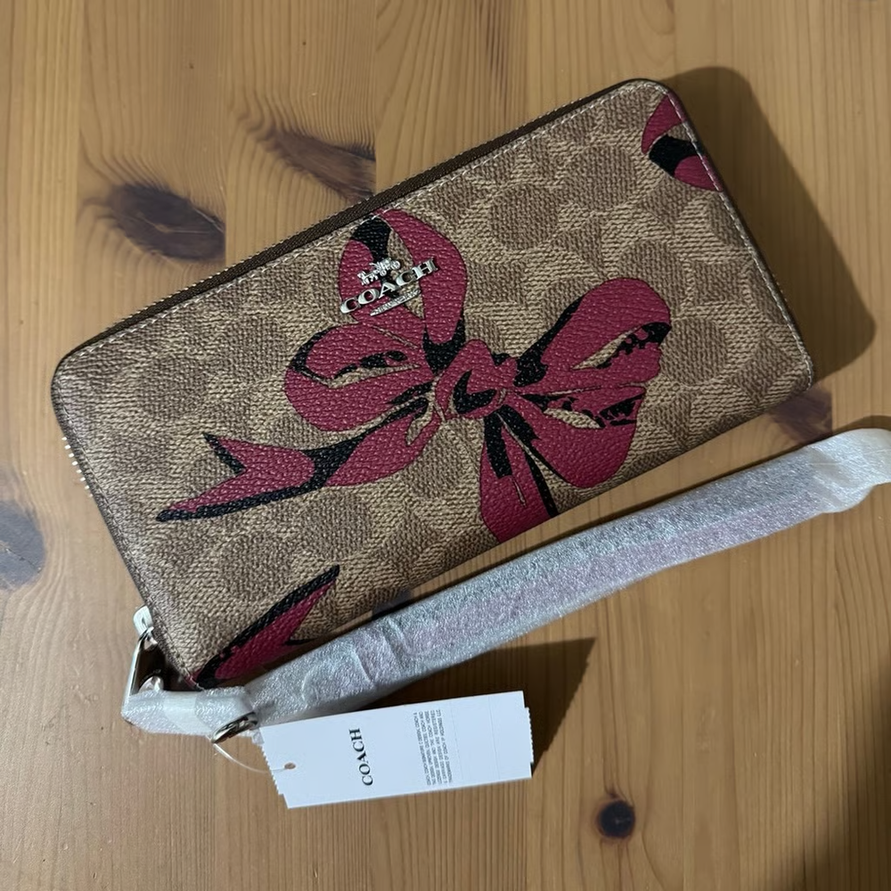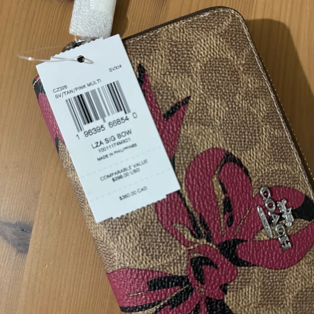 placement of the ribbon prints may vary Silver/Tan/Pink Multi Style Number CZ326 Measurements Length: 7.5" Height: 4.0" Width: 1.0" Materials Signature coated canvas Strap Detachable wrist strap Features Inside zip coin pocket 12 credit card slots Zip-around closure Full-length bill compartments Fits all iPhone and Samsung Galaxy phones