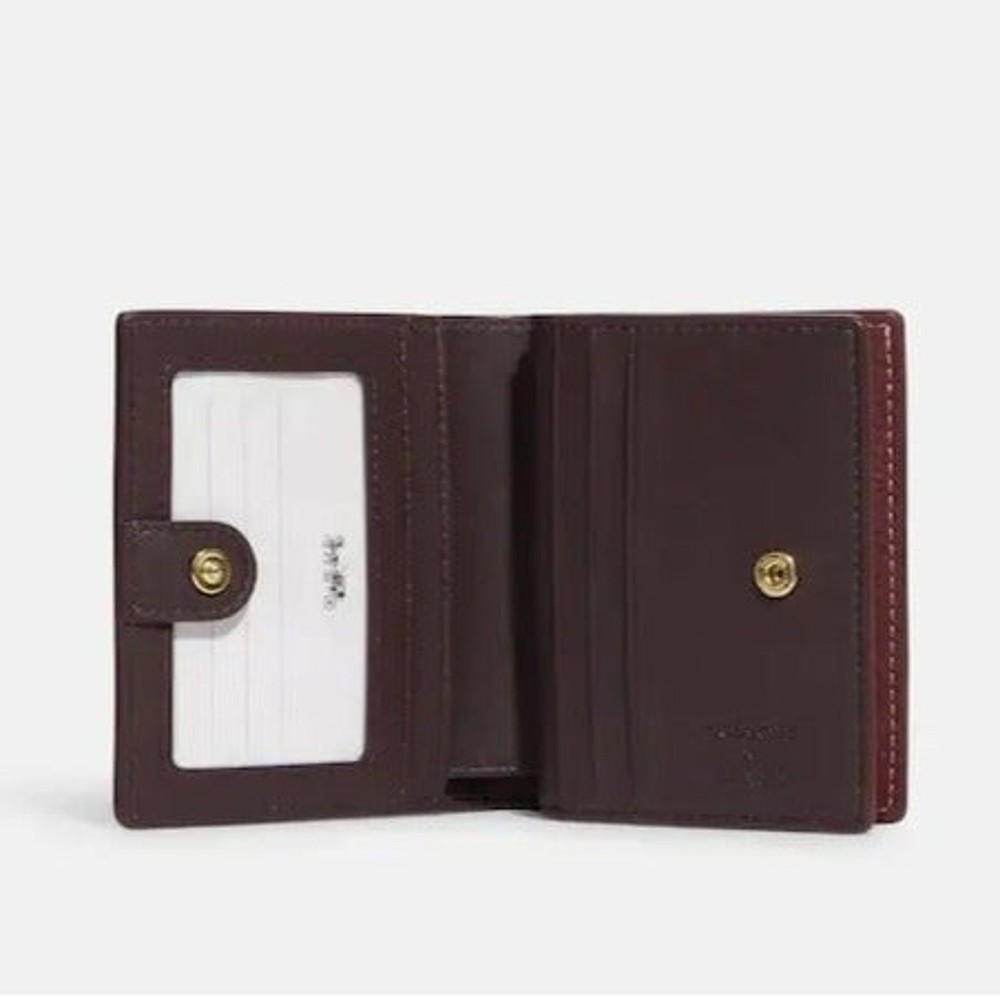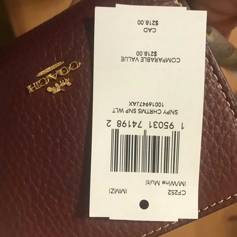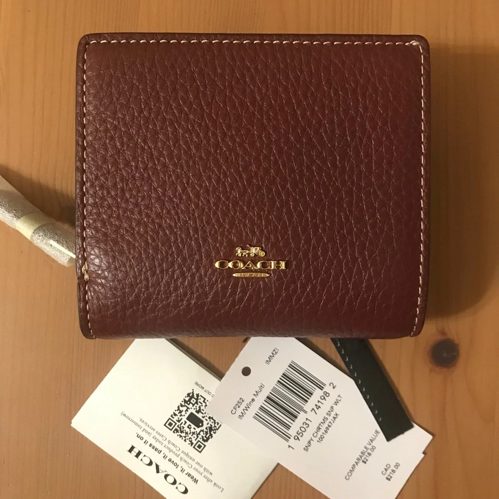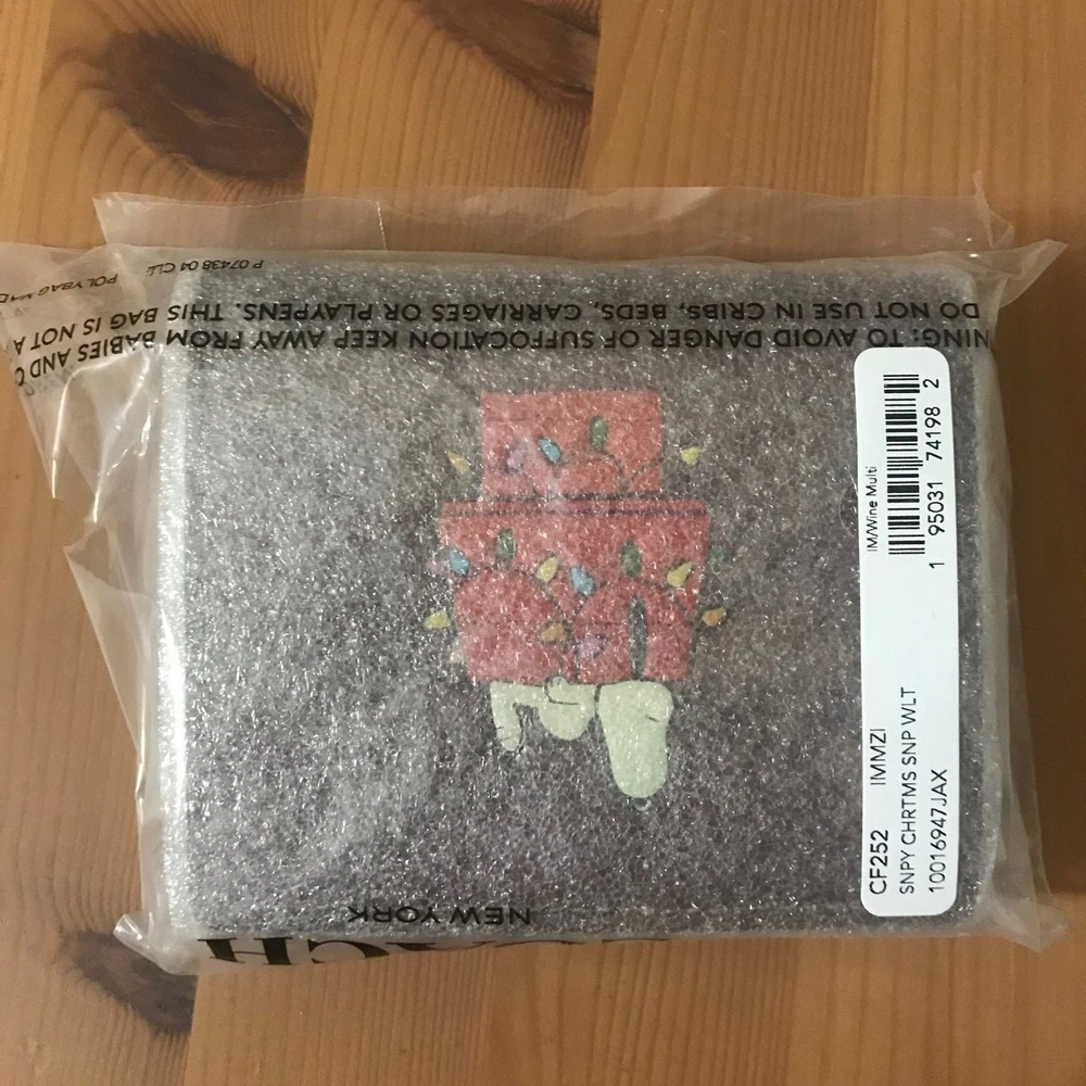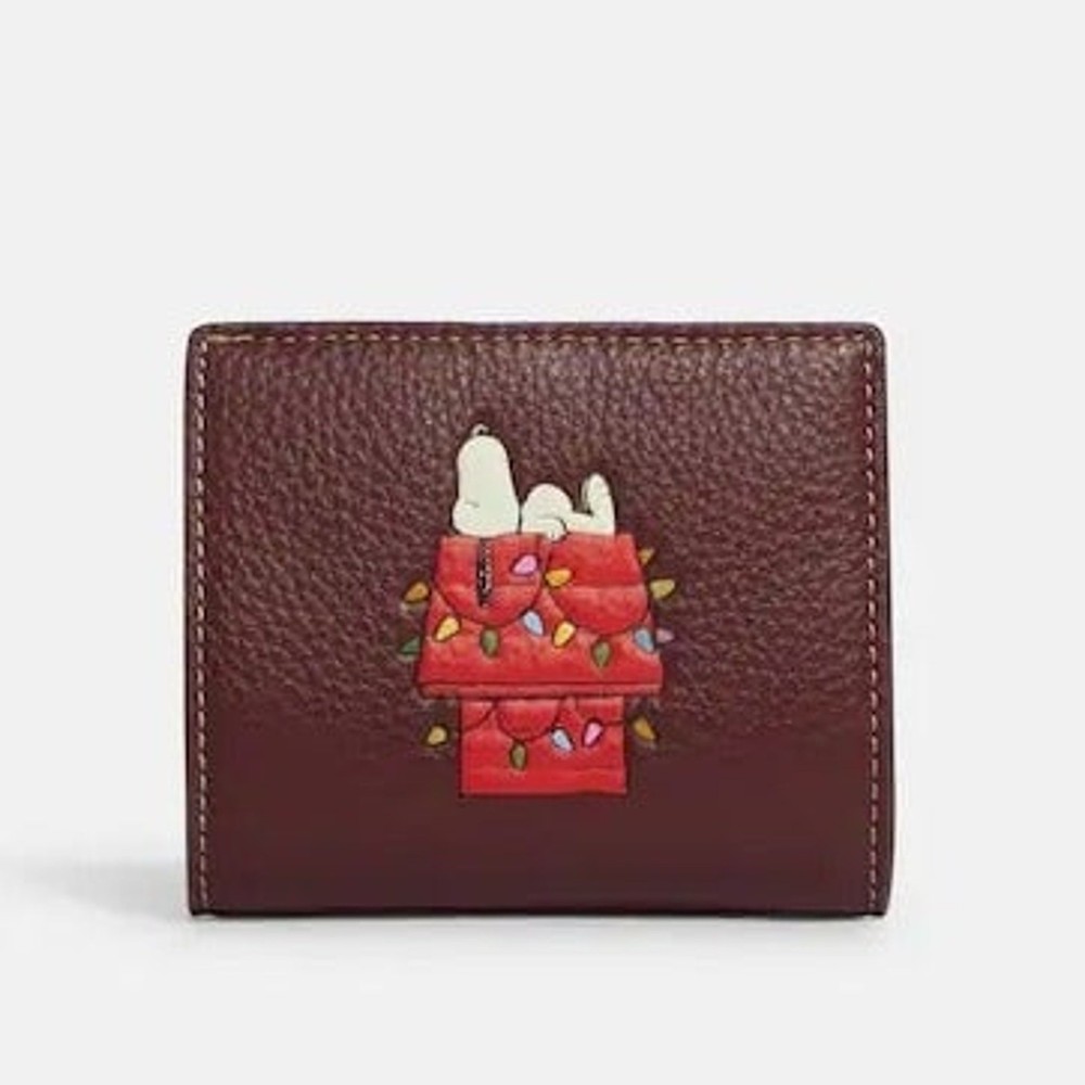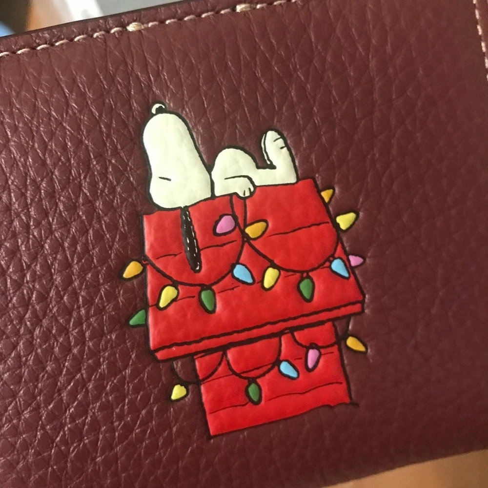 Absolutely love this Coach x Peanuts wallet! The pebble leather feels luxurious, and the playful Snoopy lights motif adds a fun touch. Perfect size with three card slots, an ID window, and a handy zip coin pocket—so practical yet stylish. The gold and wine color combo is classy, and the snap closure keeps everything secure. A must-have for Peanuts fans who appreciate quality!