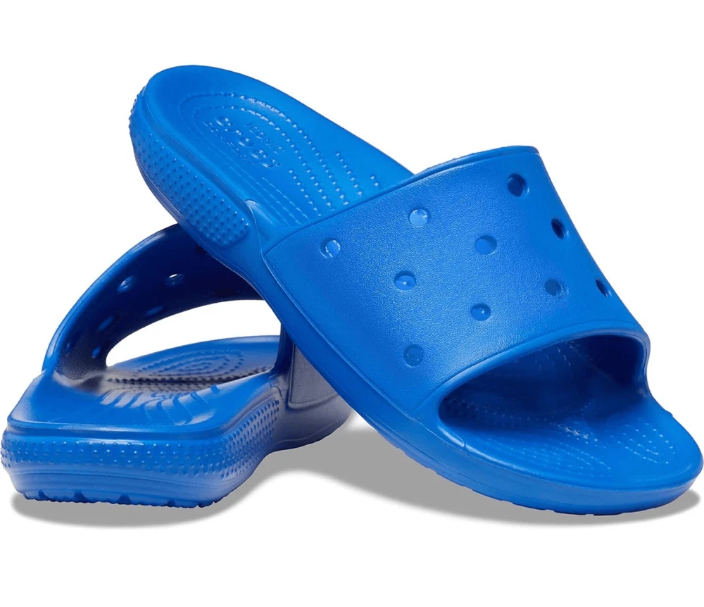 The product is a pair of Crocs Unisex-Adult Blue Classic Slide Sandals size M5/W7. These casual slip-on sandals feature a classic Crocs design with a blue exterior made of Croslite material. They are suitable for men and women in size 5 for men and size 7 for women. The sandals offer comfort and style for everyday wear, making them versatile for various casual occasions. • Jibbitz in the picture INCLUDED • Please review the size and pictures closely before purchasing. • NO RETURNS Product color may vary slightly due to photographic lighting sources or your monitor settings! ***Item: S4 All items are loaded with clear, detailed pictures, pre-checked, firmly well packed, bagged or covered with foam/bubble wrap, and sealed with extra taping. Images and recorded support items with a video before packaging and after for your security protection and mine! Tags- absorbing, adjustable, accent, accessories, aesthetic, air, airy puffed, ankle, ankle wrap, artificial, authentic, autumn, back zipper, basket, bean, birthday, boho, bohemian, bold, booties, boots, now, boy, buckle, butterfly, buttery-soft, cage, canvas, casual, certified, chain, chain-tread, character, characterized, cheetah, chic, Christmas, chunky, cinderella, classic, classy, clogs, closed-toe, closure, cocktails, collection, combat, comfy, compliment, costume, country, cowboy, cowgirl, cozy, crafted, crazy, criss-cross, crochet, crocodile, crocs, Croslite foam, custom, customizable, daily wear, date night, decor, design, designer, dinner, duck, durable, earth, eclectic, edgy, elegance, elegant, embellishments, EVA, evening, cozy, event, extraordinary, eye-catching, fabric, fall, fashion, faux fur, felt, feminine, flat-heel, flats, fleece, foam, fur, fuzzy, genuine leather, genuine suede, gift, girl, girly, glam, glitter, going out, go-go boots, gold-tone, golf gothic, grippers, grain, grunge, handles, hawt, hearts, heels, high, high quality, high-tops, hiking, hippie, holiday, hot, ice, indoors, infused, insulated, isotoner, Jibbitz, khaki, kids, knee-high, lace, lace-up, leather, light-up, lightweight, limited edition, loafers, luxe, luxurious, luxury, maine-made, man-made, manufactured, mary Jane, mesh, Mexican, mid-calf, modern, moto, motorcycle, mules must-have, night, night out, nubuck leather, oasis, office, ombre, ortholite, outdoors, outsole, padded, padded collar, party, patched, patten leather, pattern, parties, peep toe, pewter, PINK, pivoting heel strap, platform, pleated, pleather, polka dots, popular, premium, present, printed, PU leather, pumps, punk, PVC, rain, rainbow, rare rave, retro, round toe, rubber, ruffle, running, sandals, secure footing, sex appeal, sexy, sheer, shiny, shock-cushion, shoes, simple, skate, skateboarder, skimmer, slippers, slipper socks, slip-off, slip-on, slipper booties, slipper, snake skin, sneakers, socks, snow, socks, solid hue, sport, side buckle, side strap, side zip, Signature's, silhouette, slide, steel toe, steel shank, stitching, stilettos, strap, strappy, streetwear, stripe, stunning, stylish, suede, summer, superhero, sweater, synthetic, tennis, texture, thermolite, tie, tiger, toddler, traction, traditional, translucent, trendy, trending, triple needle, tropical, tumbled, two pull handles, the two-toned, unique, unisex, upper-class, upper layer, urban style, vast, vegan, velvet, versatile, vibes, vibrant, vintage, walking, warm, washable, waterproof, water repellent, water resistance, wedding, wedge, western, wide, winter, women, woman, work, wrap, woven, Y2K, yoga, zipper, zipper back