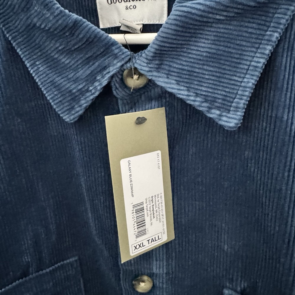 This is a Goodfellow & Co button-down shirt designed for men in size 2XL. The shirt is a casual style with long sleeves and a collared neckline. It is made of 100% cotton corduroy fabric in a classic blue color. The shirt features a button closure and a regular fit, suitable for big and tall individuals. Easy to care for as it is machine washable. Perfect for adding a stylish touch to a casual outfit.