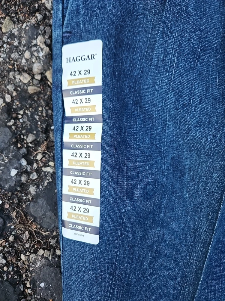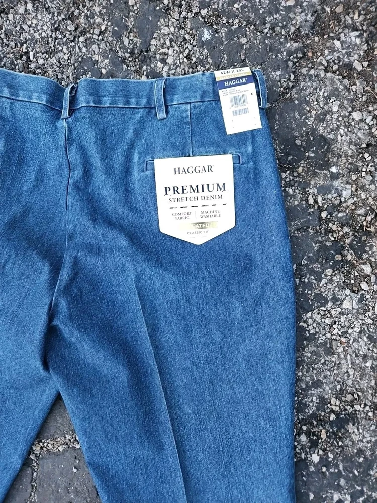 NWT HAGGAR Men’s PREMIUM STRETCH DENIM PANTS Jeans PLEATED CLASSIC FIT 42 x 29 Style: hc00280 Color: 422 med blue Premium stretch denim Product will be shipped timely and packaged with care. Offers are encouraged. Please feel free to reach out with questions. Please see pictures. Thank you. New old stock jeans. See pictures. These are NWT Haggar men's premium stretch denim pants in a classic fit size 42 x 29. The jeans are pleated with a straight leg style in a blue color. Made of denim fabric with added stretch for comfort. Sku: ghang