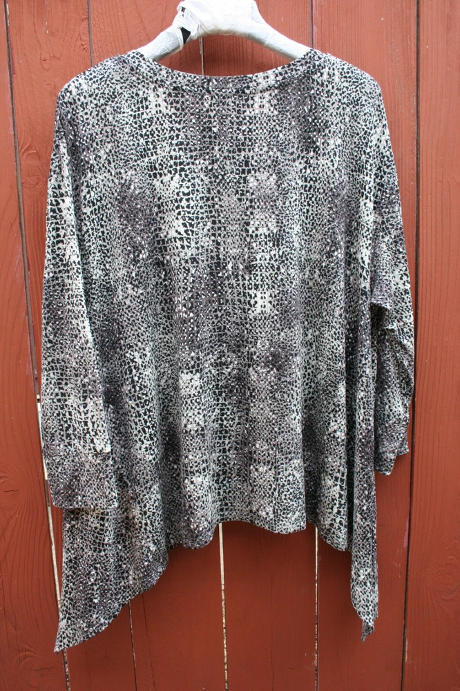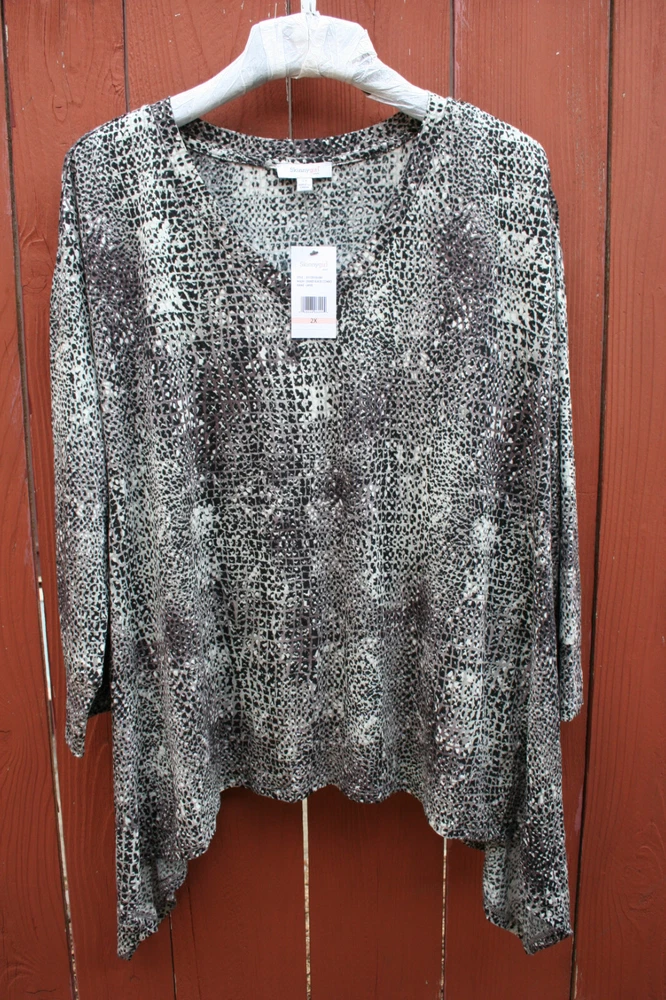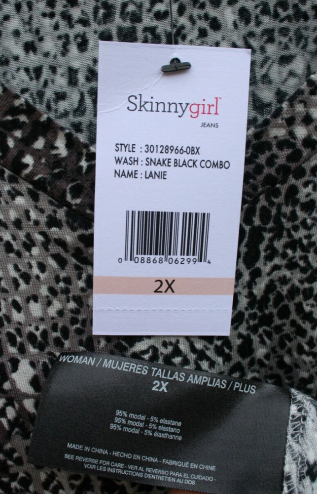 PURCHASE BY 2/19 or it goes to charity! Skinnygirl 2X Lanie Snake Black Combo Sharkbite Stretchy Top New With Tags . $25.74 on Amazon but they don't have this print! Light weight travel ready knit pullover blouse. Approx. measurements laid flat: armpit to armpit: 25" - armpit seam to sleeve end: 14" - overall length 25" from back of neck seam to hem. Natural shoulder to sharkbite hem is 33." Happy to combine shipping with my other listings, see below for instructions. I offer free local pick up on Chicago's far NW side in addition to regular shipping. From my smoke and chemical-free good karma home. Questions? Please contact me before bidding/purchase. If purchasing several Buy It Now items, use the cart feature. Add items to cart one at a time, then click Request Total/Invoice from seller. I will send a correct invoice with combined shipping. I ship USPS within 2 business days. I use recycled boxes/packing materials to help the planet. Items packed with utmost care. Return shipping costs not refundable. I aim for a positive experience. I appreciate 5-star feedback! I leave feedback after receiving yours. Thanks for reading this far!