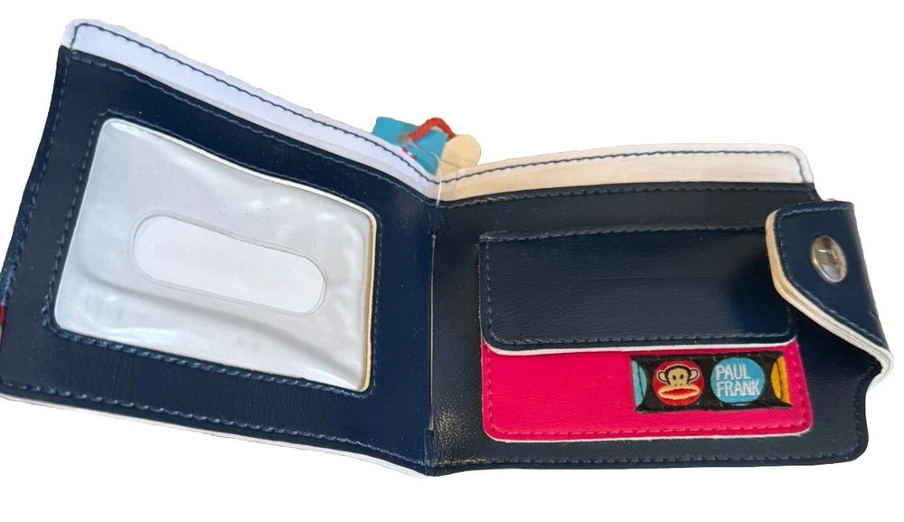 Color:Navy blueMaterial:VinylFeatures:Credit Card, Folding, Zip Change PocketFabric Type:VinylAccents:Zipper, Snap, Bill Slot, Credit Card Slots X 5Department:UnisexCharacter:Julius The MonkeyType:WalletBrand:Paul Frank